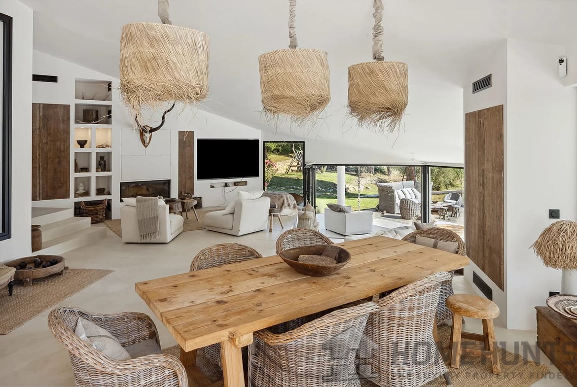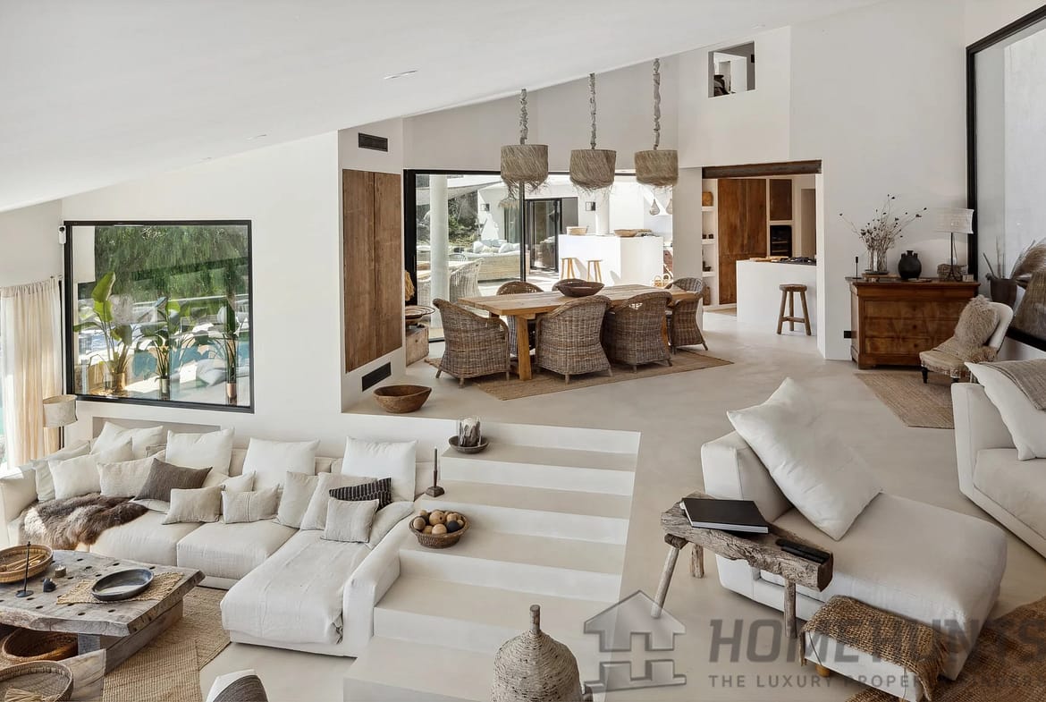 The spacious open-plan living area on the ground floor is bathed in natural light, featuring a fully equipped American kitchen, a stylish dining area, and a cosy lounge—all with stunning views of the expansive pool and outdoor living spaces. Floor-to-ceiling windows seamlessly connect the indoors with the large covered terrace, providing the perfect setting for outdoor dining and enjoying the sun-drenched Mediterranean climate.