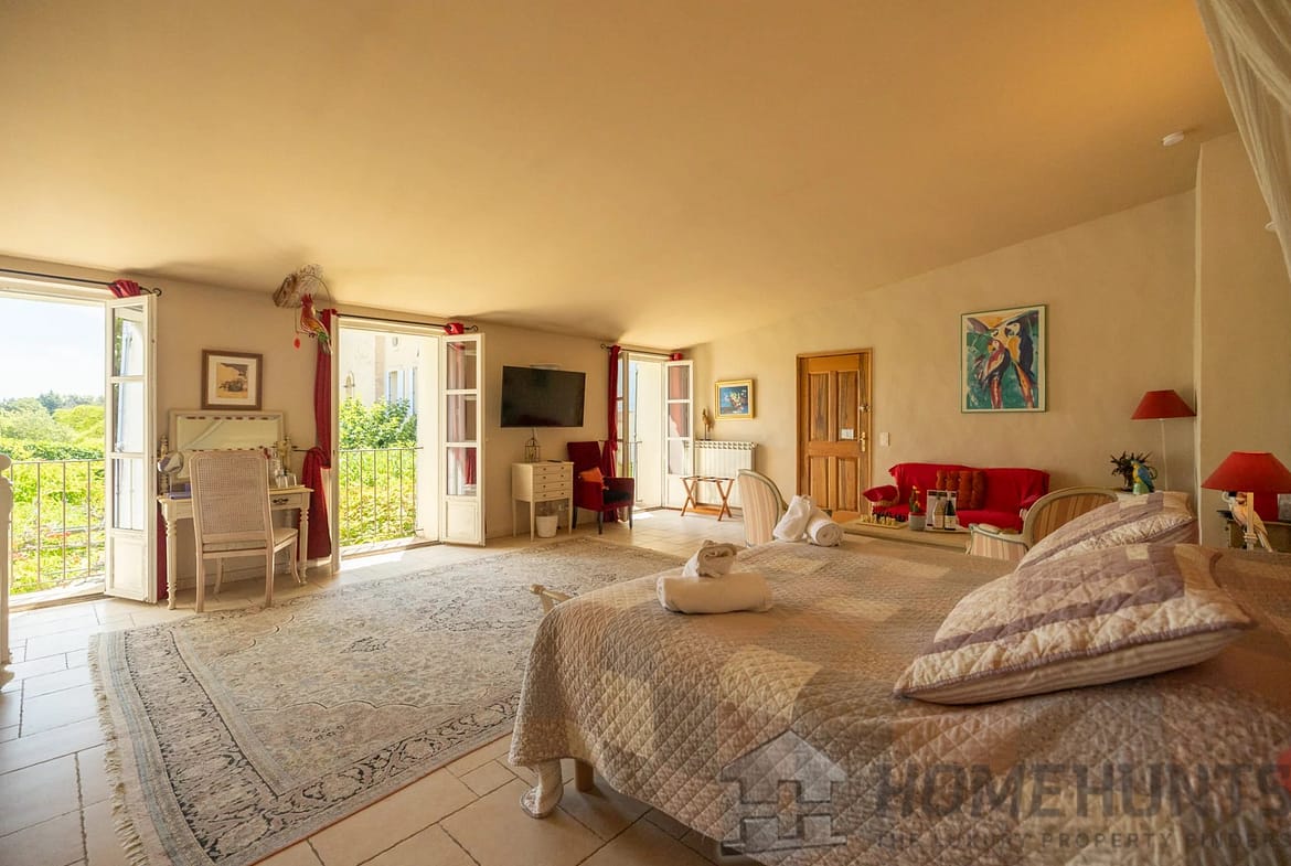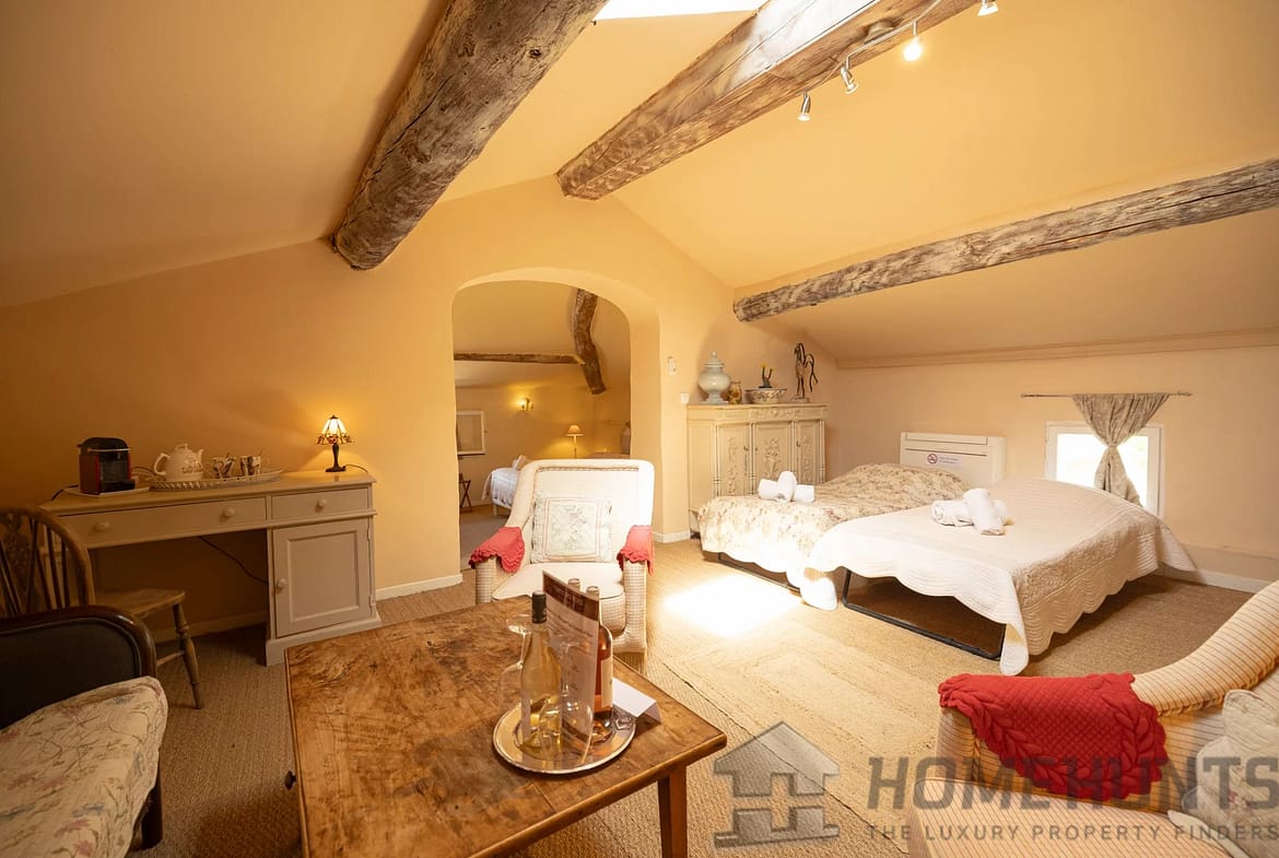 The entire building has been carefully restored, preserving the old features – exposed stonework, beams, generous volumes – while offering modern and refined amenities. The property has several bright reception rooms, two kitchens, ten bedrooms, most with en-suite bathrooms, as well as numerous additional spaces: laundry rooms, cellars, hallways, dressing rooms and upstairs lounges.