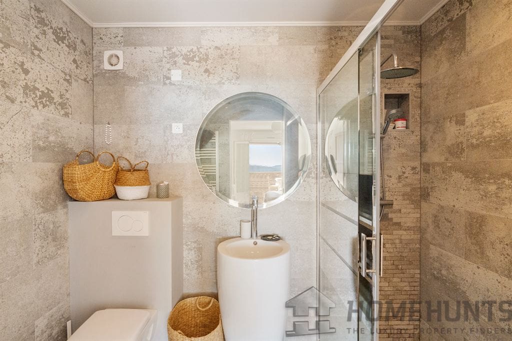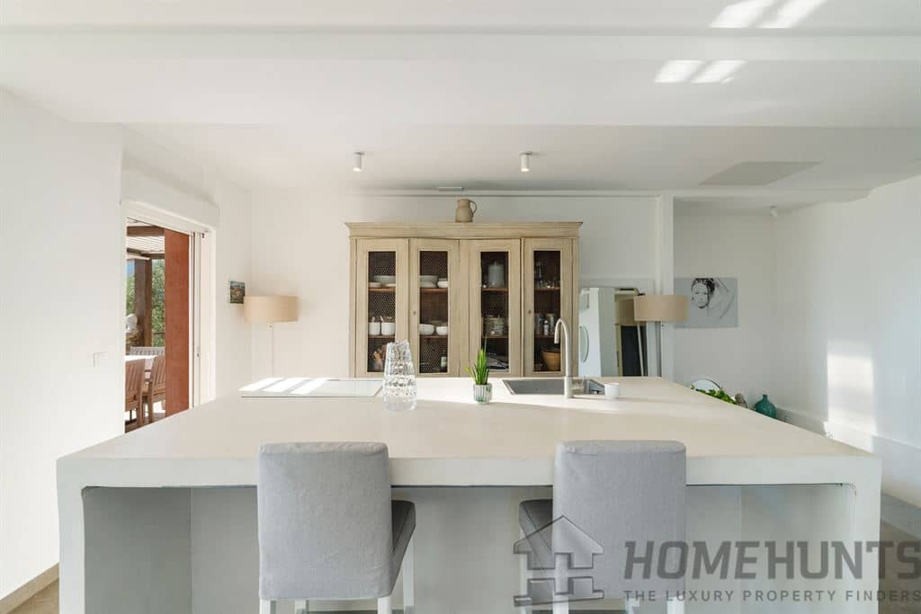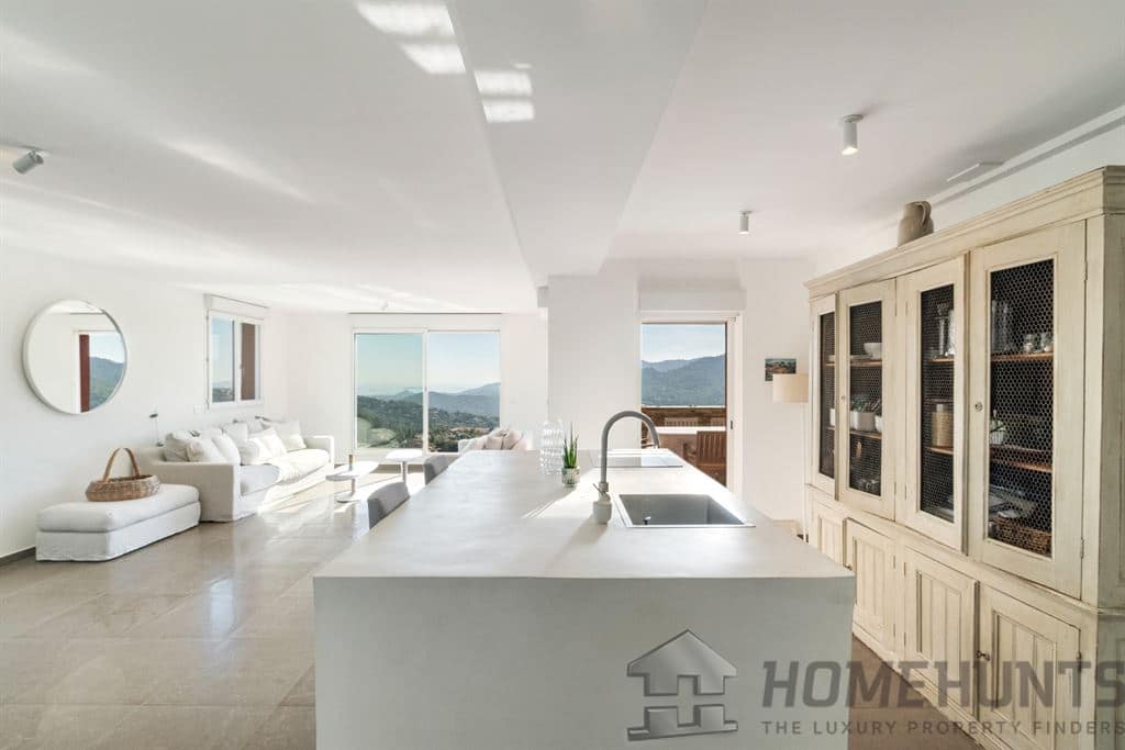 Spread over three levels, the villa has a private elevator connecting the double garage and laundry room. It comprises two spacious living rooms, a dining room, and a fully equipped open-plan kitchen opening onto a terrace with sea view. Two bedrooms with en-suite bathrooms and an office with sleeping area complete the interior.