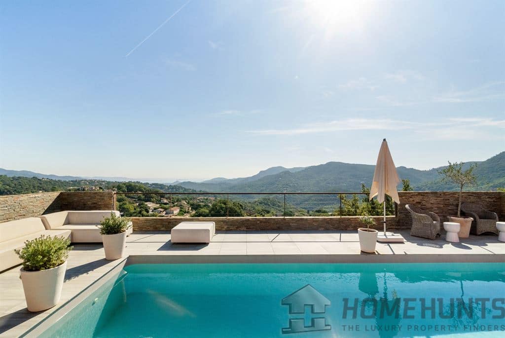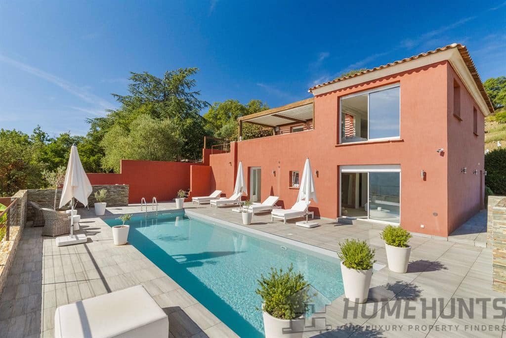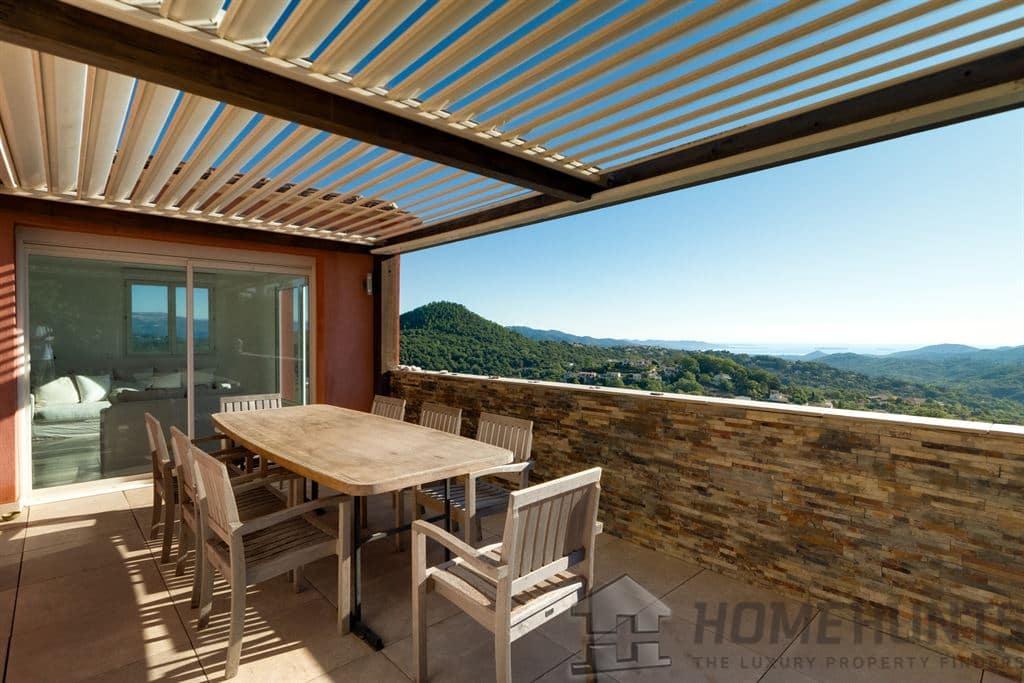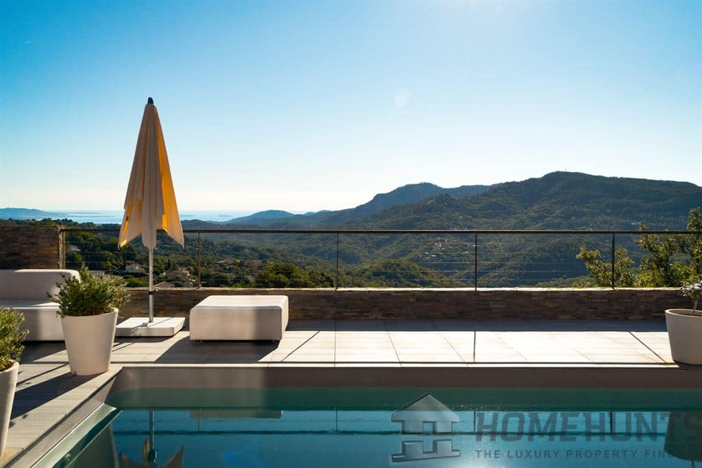Outside, the property includes a swimming pool with views of the Esterel massif and the Mediterranean, as well as a shaded terrace.
