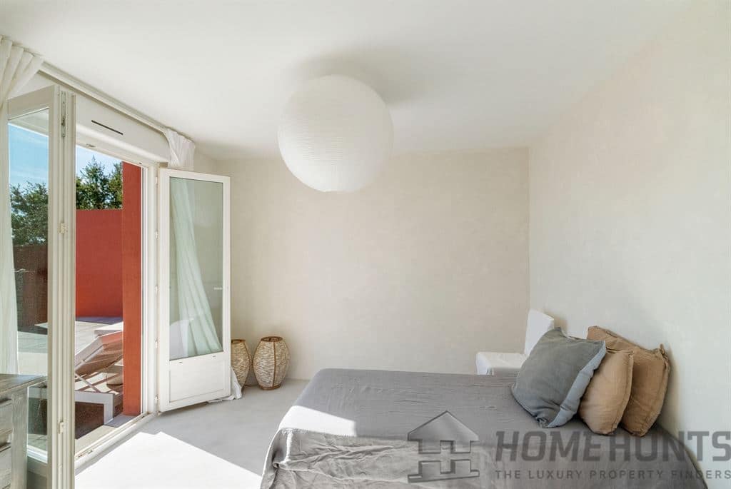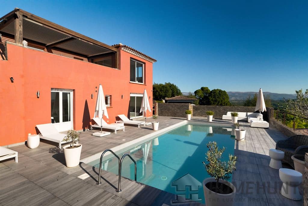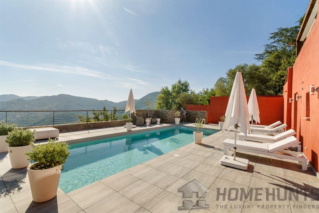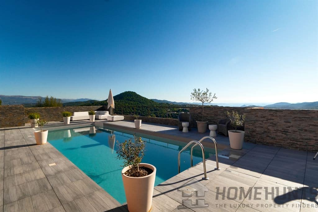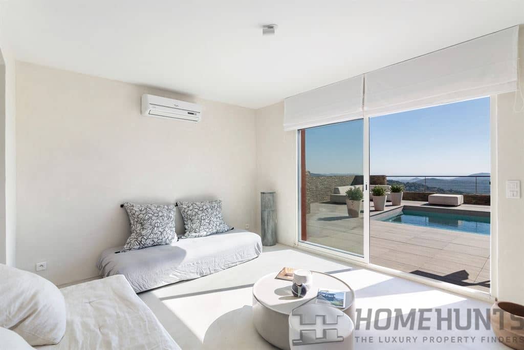 Outside, the property includes a swimming pool with views of the Esterel massif and the Mediterranean, as well as a shaded terrace.