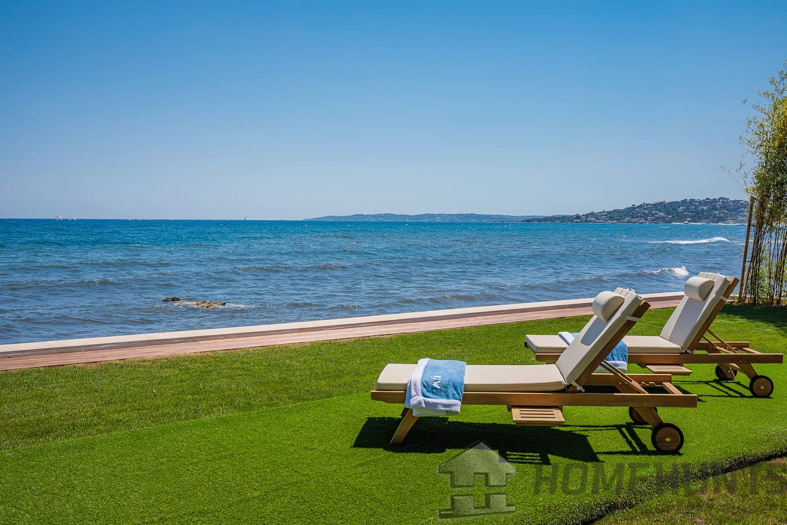 Inside this exceptional family beach front home there are 4 suites, a modern and bright living space opening onto the terraces, the sandy beach below, the perfect spot to take in its breathtaking view over the bay and its magnificent gardens to the side.