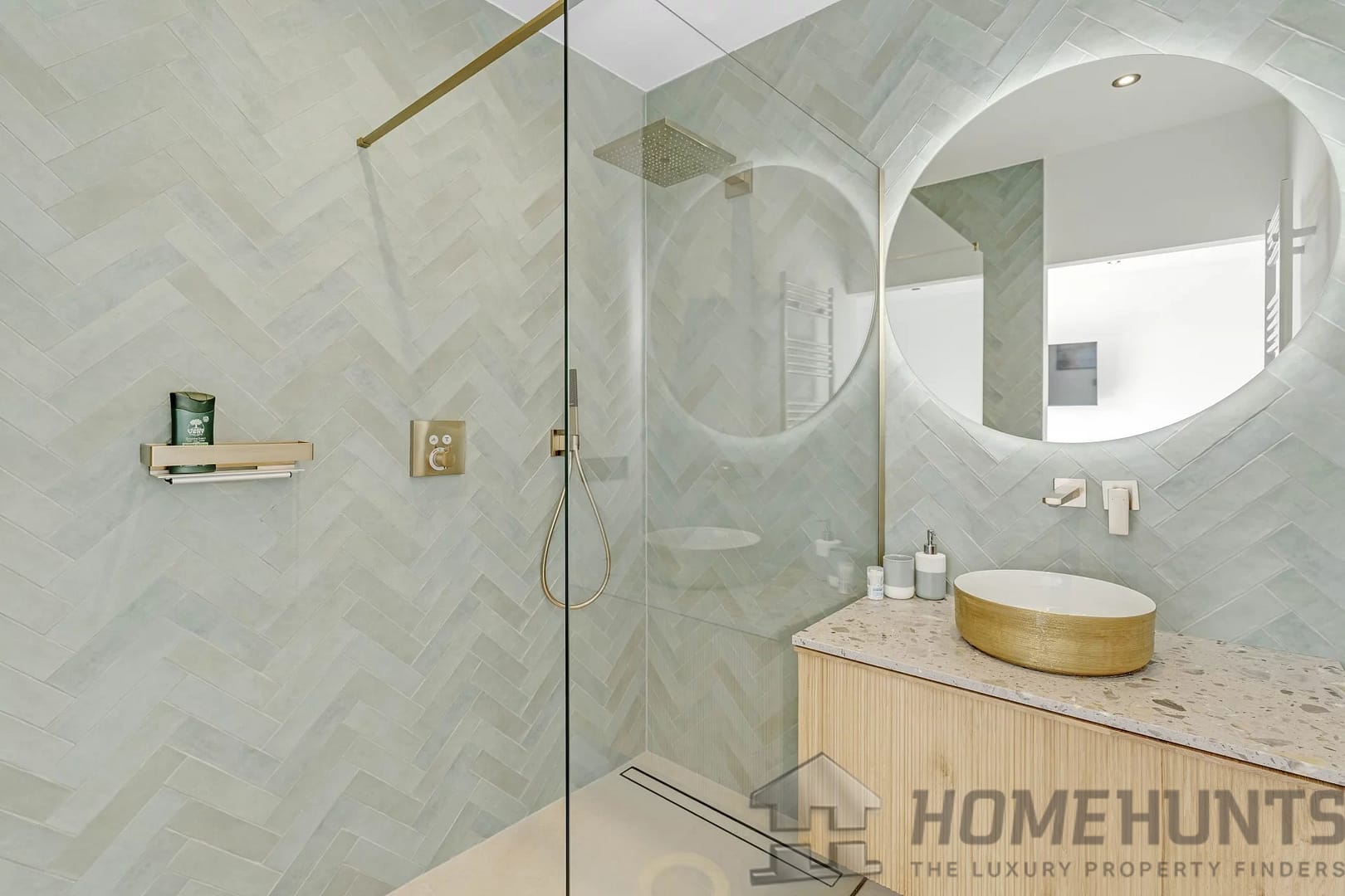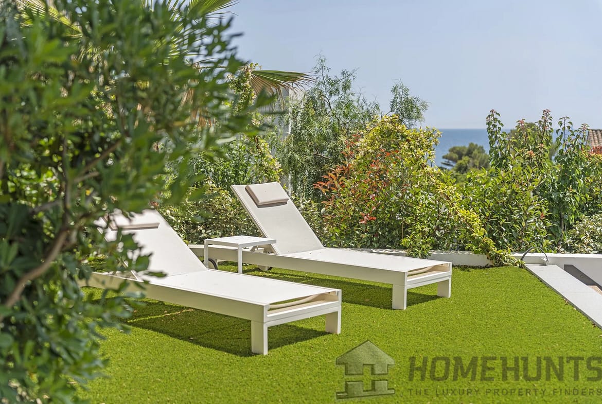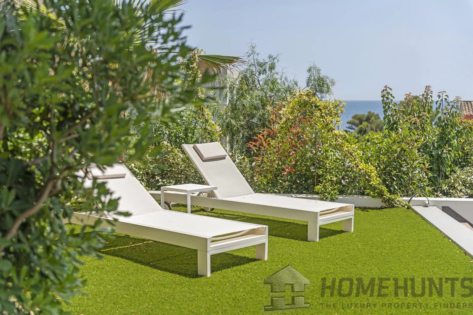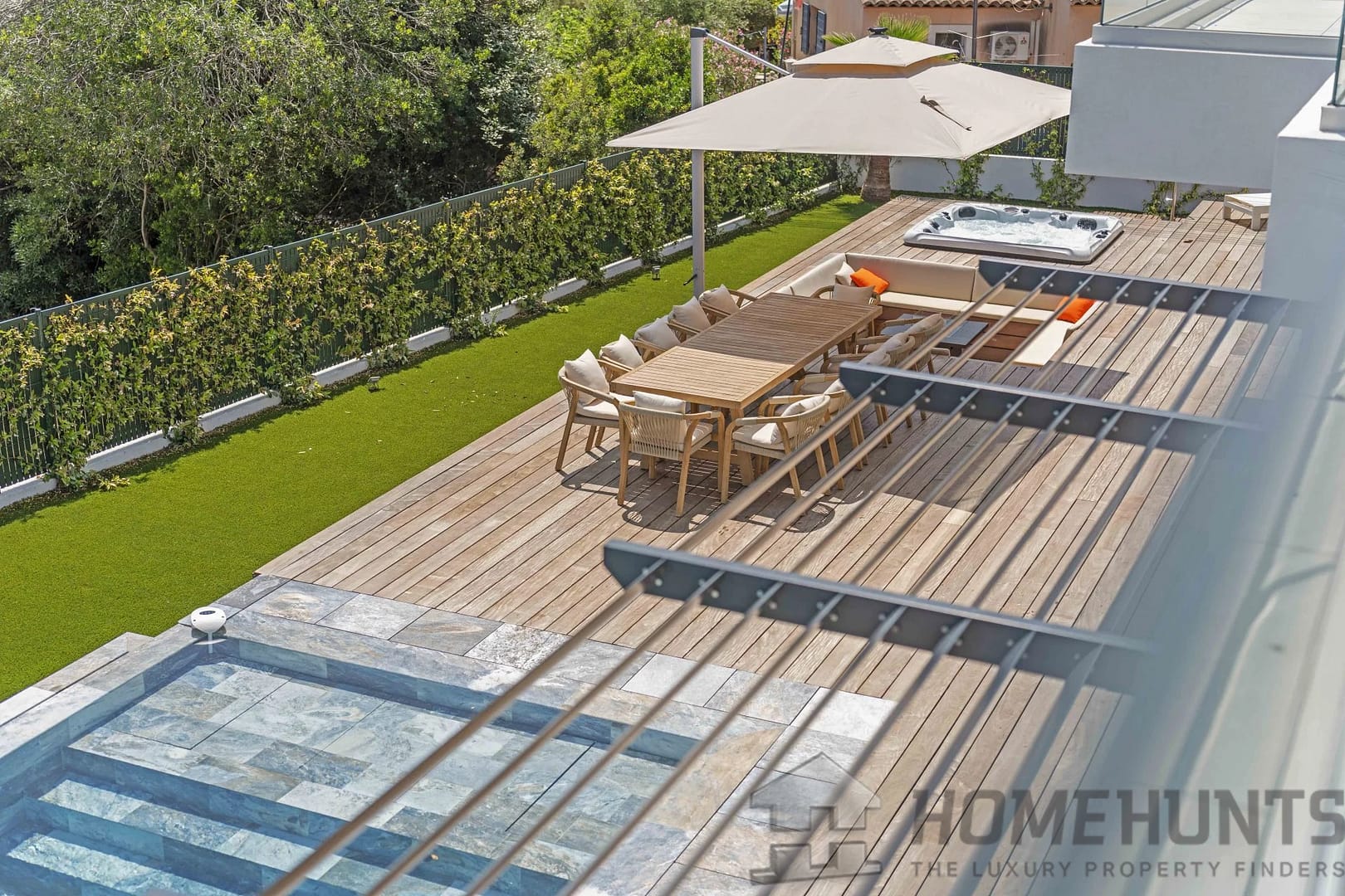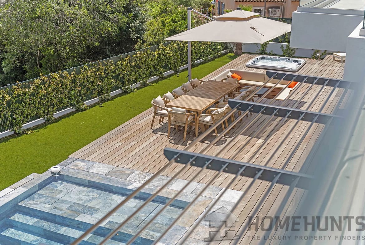 The villa sits on a flat 833 m2 plot, featuring a stunning heated infinity pool with a waterfall, a jacuzzi, and a brazier area with a lounge space.