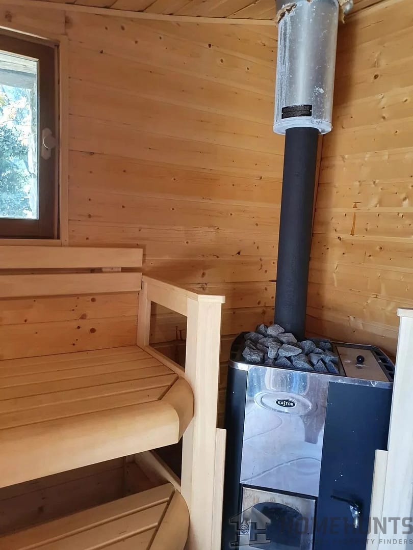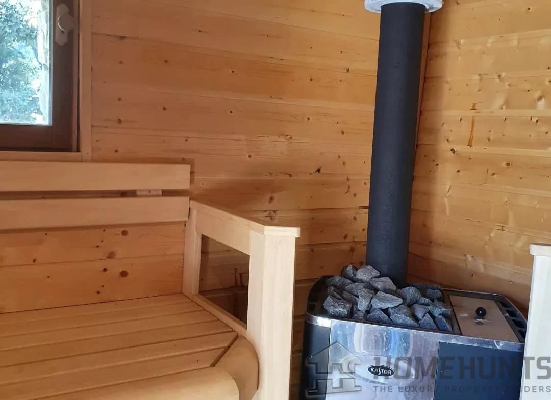 The ground floor features a bright open living and dining area with fireplace (insert), a fully equipped kitchen, a pantry, a climate-controlled wine cellar, a laundry room, and a shower room.