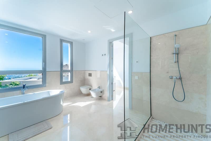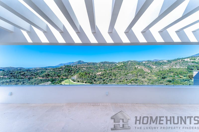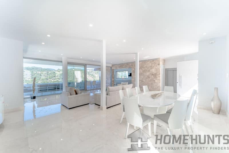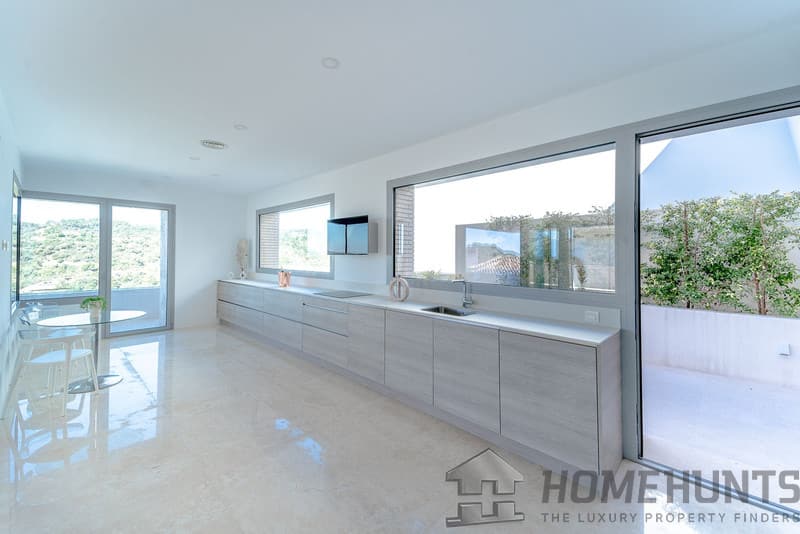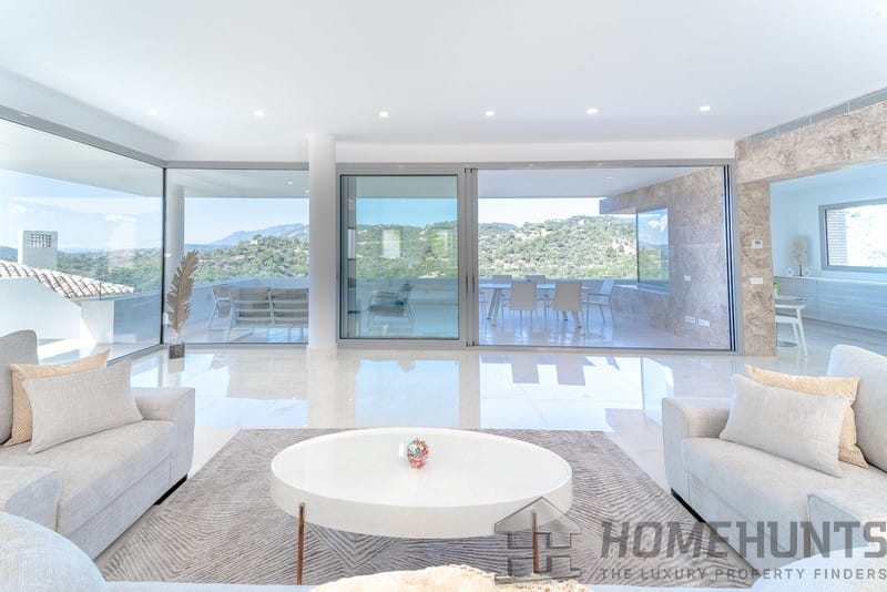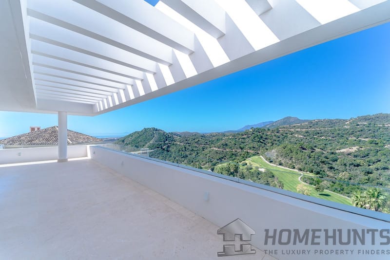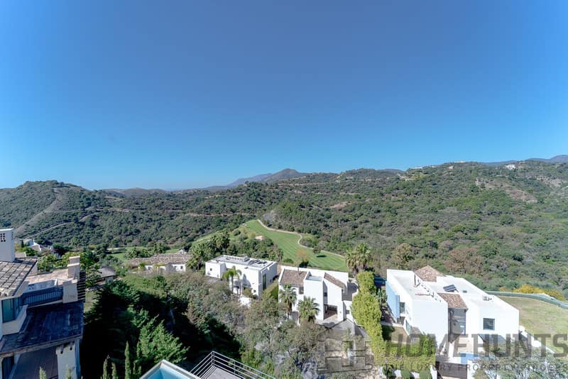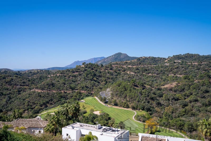 It is located in a natural environment, surrounded by golf and mountain, providing nice open views to those, panoramic sea view from the solarium and good sea view from some areas of the house.