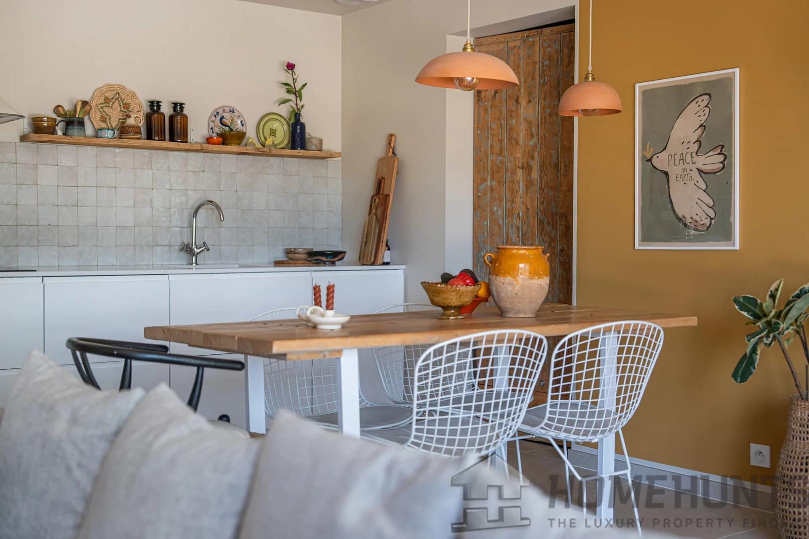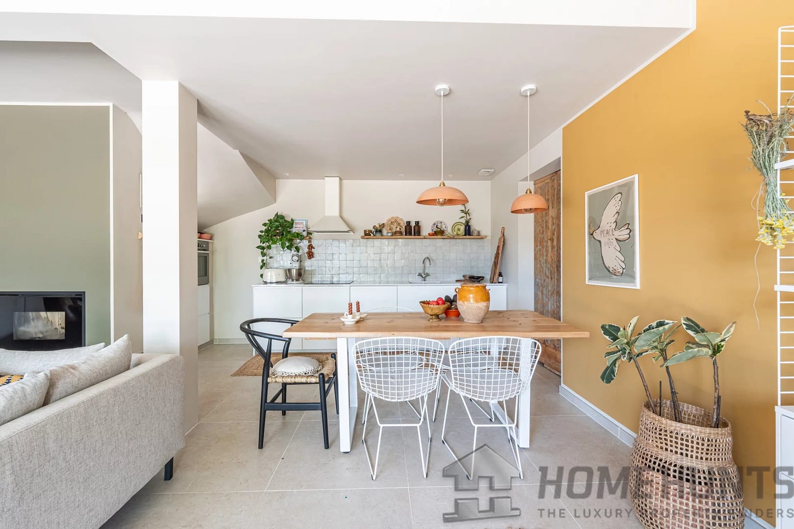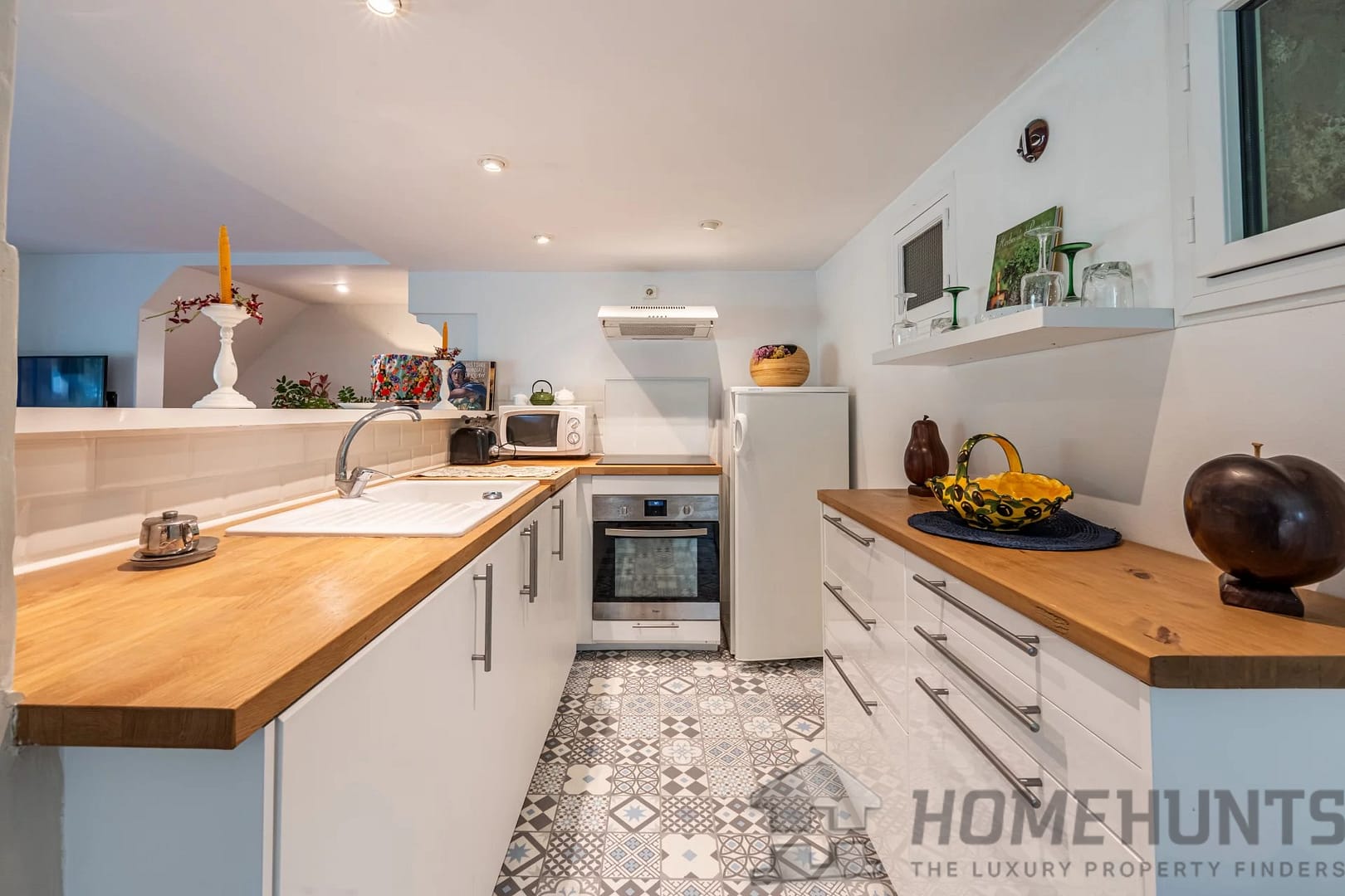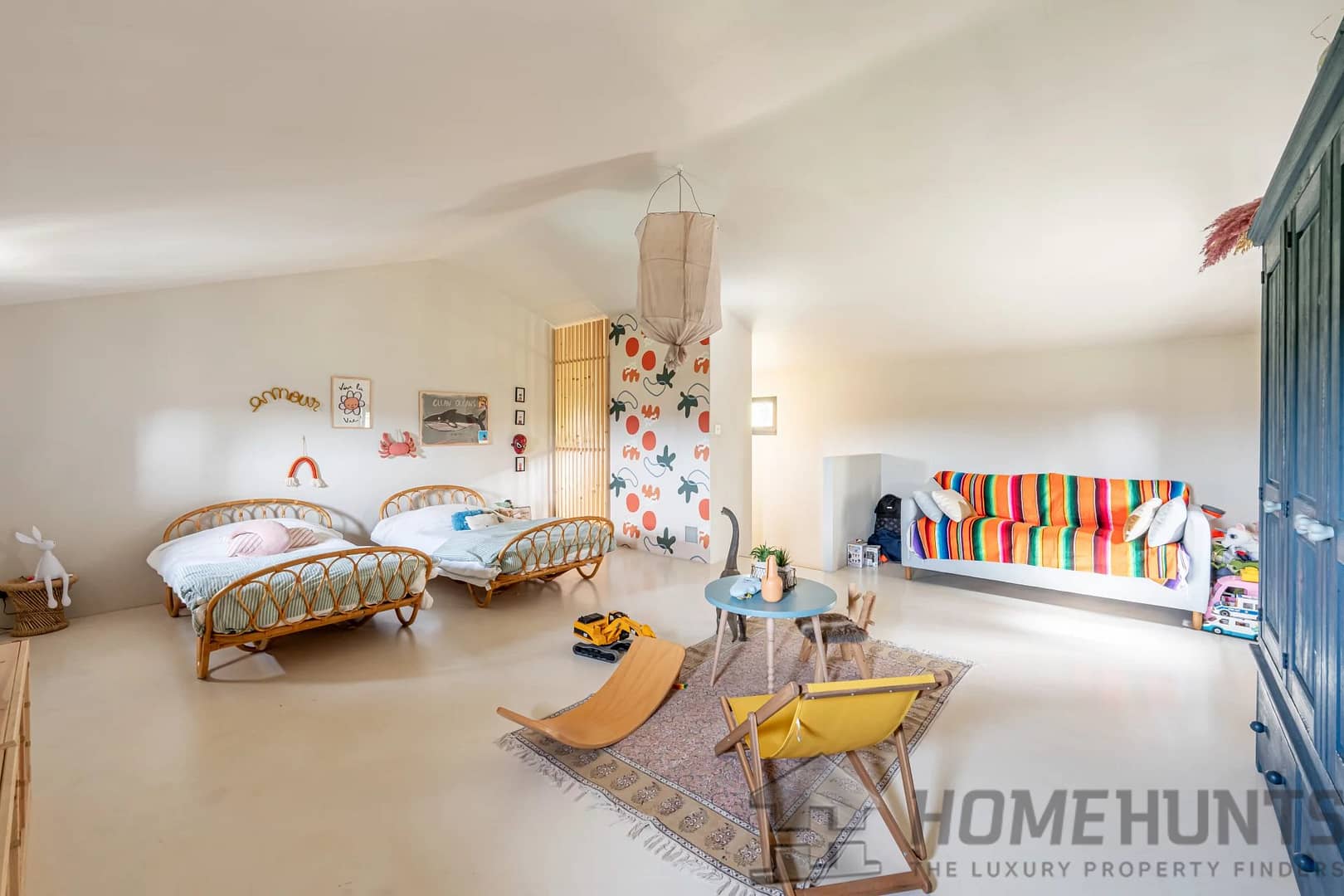 An adjoining new house of 125 m2: on 3 levels it opens onto a large living room with wood insert, beautiful open kitchen, laundry room. On the 1st floor a large bedroom with dressing room and bathroom. The top floor includes a room/bedroom of 35m2. The careful decoration is resolutely contemporary: polished concrete floors, Zellige tiles, modern kitchen, etc.