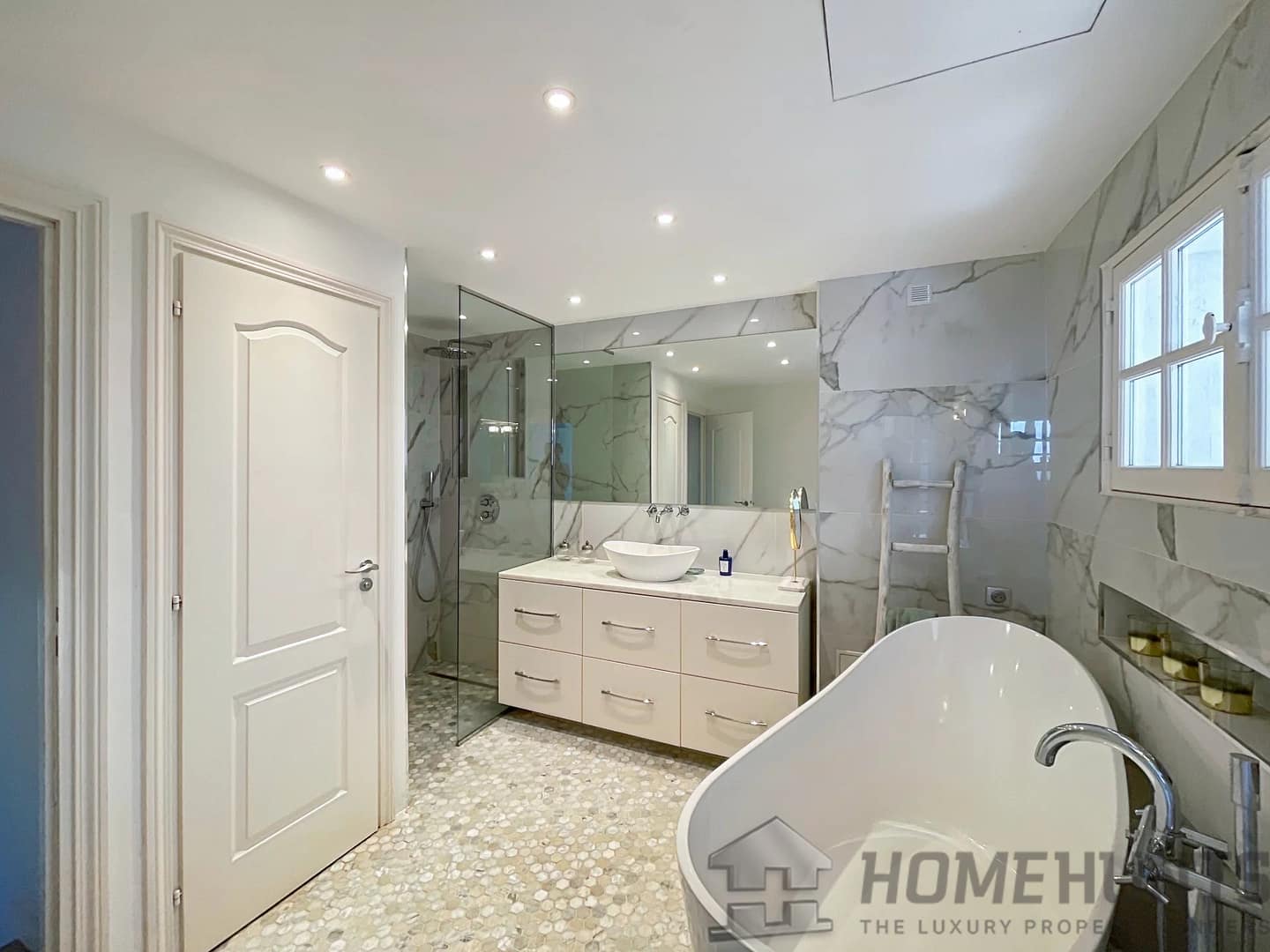 On the upper floor, two bedrooms with terraces offer stunning views of the sea. A shower room with WC ensures the comfort of the occupants. And the master bedroom, with its large bathroom including a shower, bathtub, and separate WC, also has its terrace.