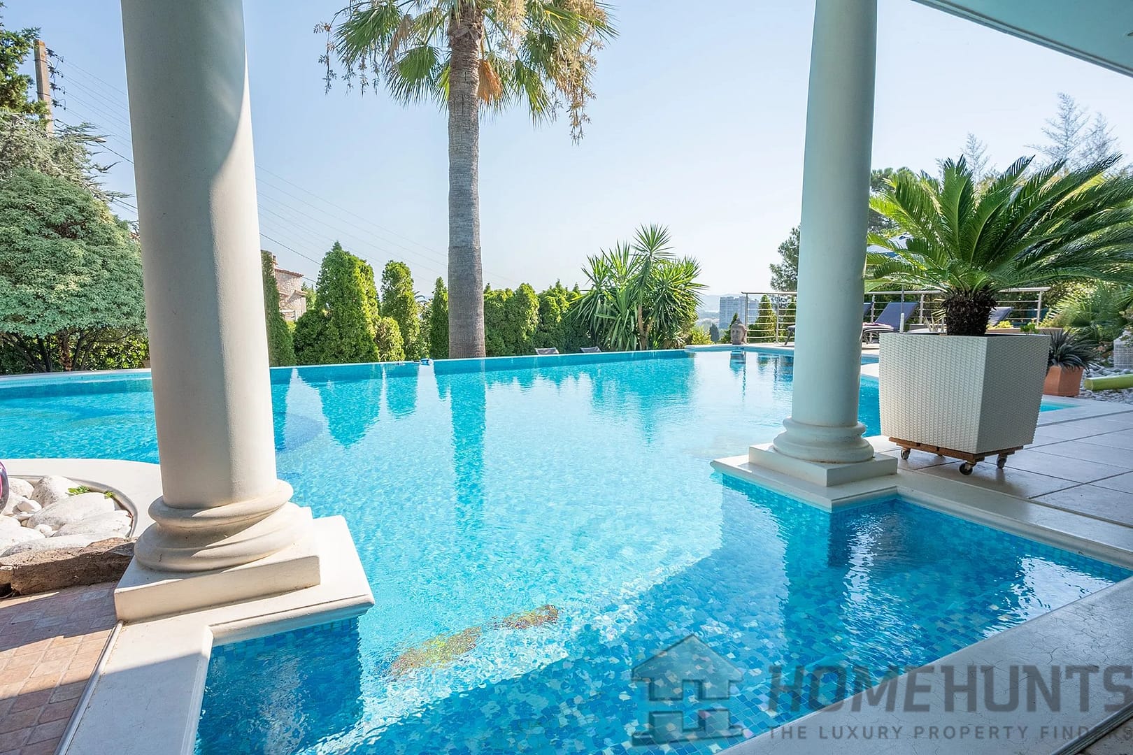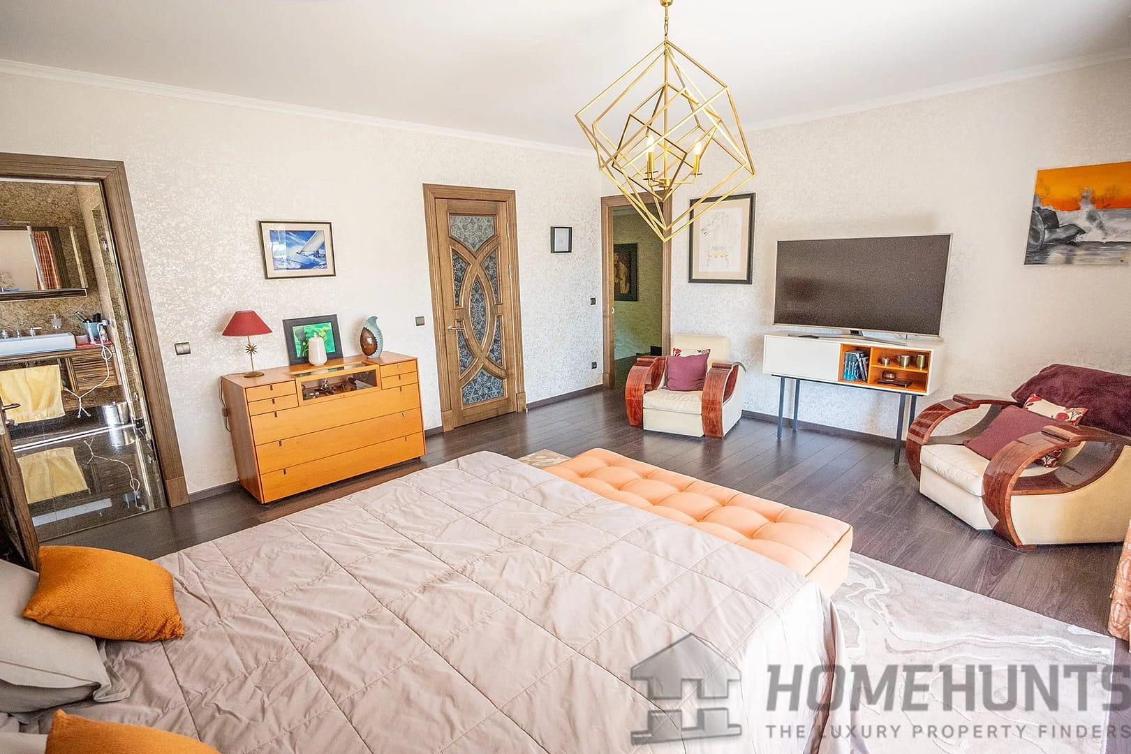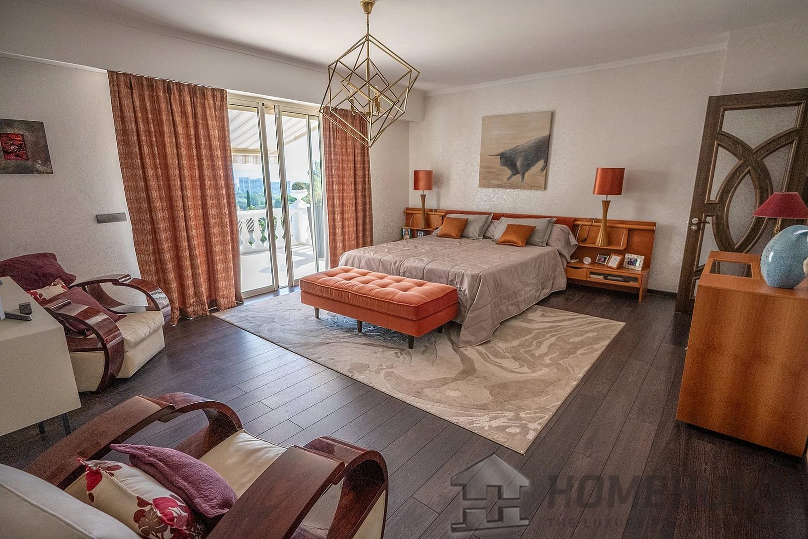 The first floor, which is the garden level, opens directly to a large swimming pool area. From here, there is also a small but genuine view of the sea. The home’s heating system combines integrated reversible air conditioning with electric underfloor heating in all stone and marble-floored areas, while the bedrooms, finished with wooden flooring, offer a warmer, natural feel.