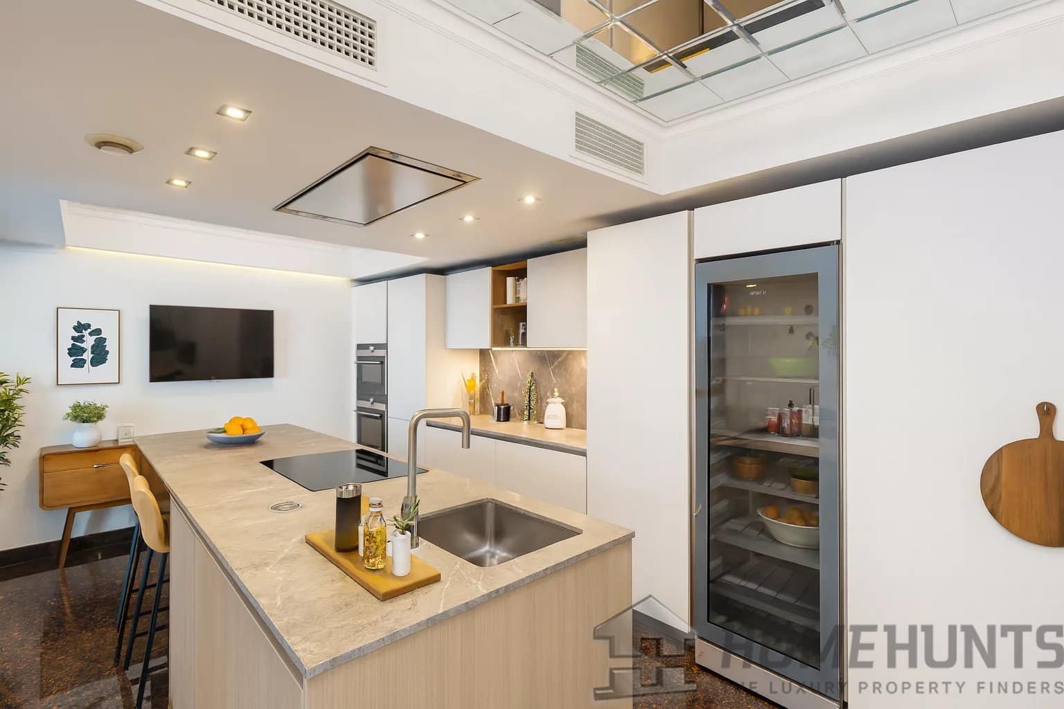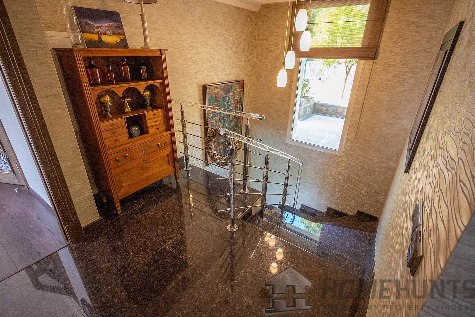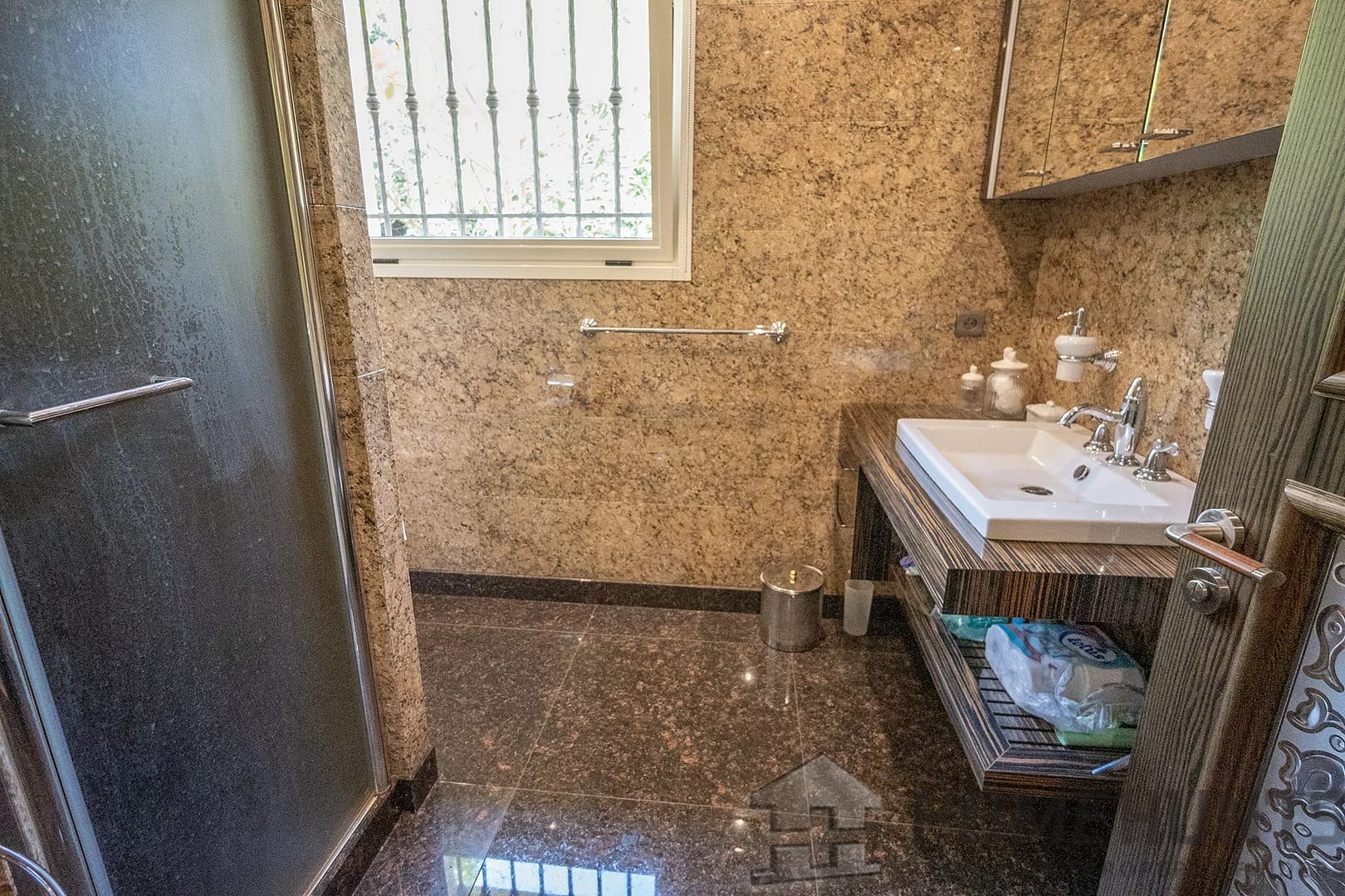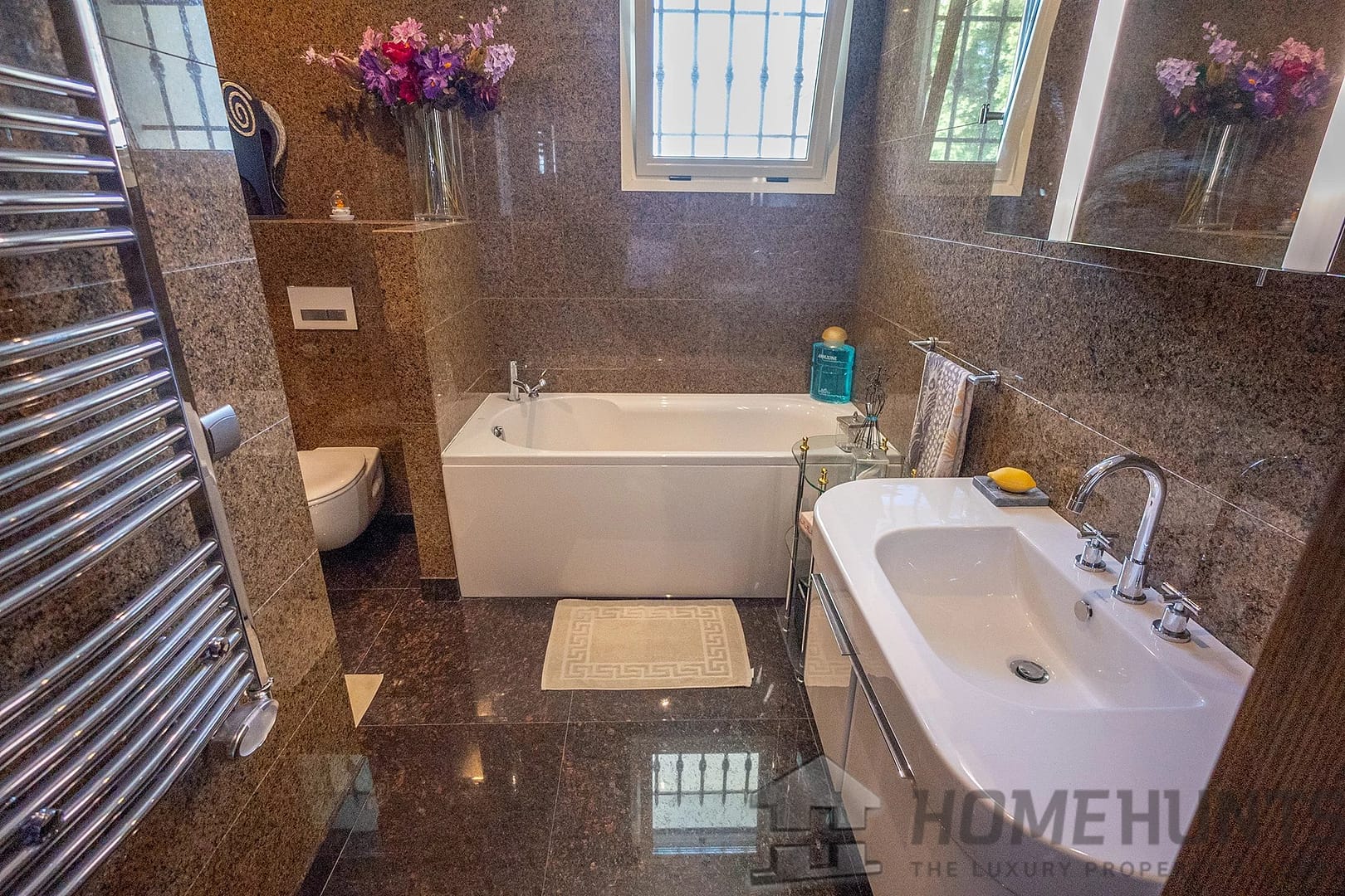 The first floor, which is the garden level, opens directly to a large swimming pool area. From here, there is also a small but genuine view of the sea. The home’s heating system combines integrated reversible air conditioning with electric underfloor heating in all stone and marble-floored areas, while the bedrooms, finished with wooden flooring, offer a warmer, natural feel.