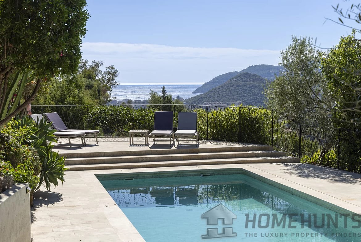 The property comprises six well-appointed bedrooms, complemented by two garages and additional parking for two vehicles, alongside a private swimming pool, creating a serene and private Riviera retreat.