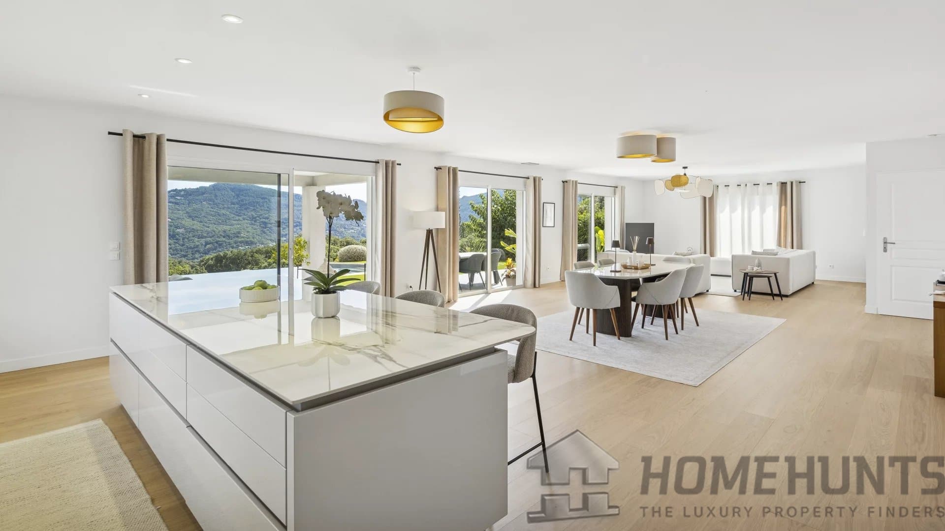 A vast, bright living space of over 90 m2, facing south, welcomes you with a living/dining room opening onto the outside and an elegantly fitted and equipped open-plan kitchen. This space leads directly to a shaded terrace and a sumptuous infinity pool offering unobstructed views of the surrounding nature.