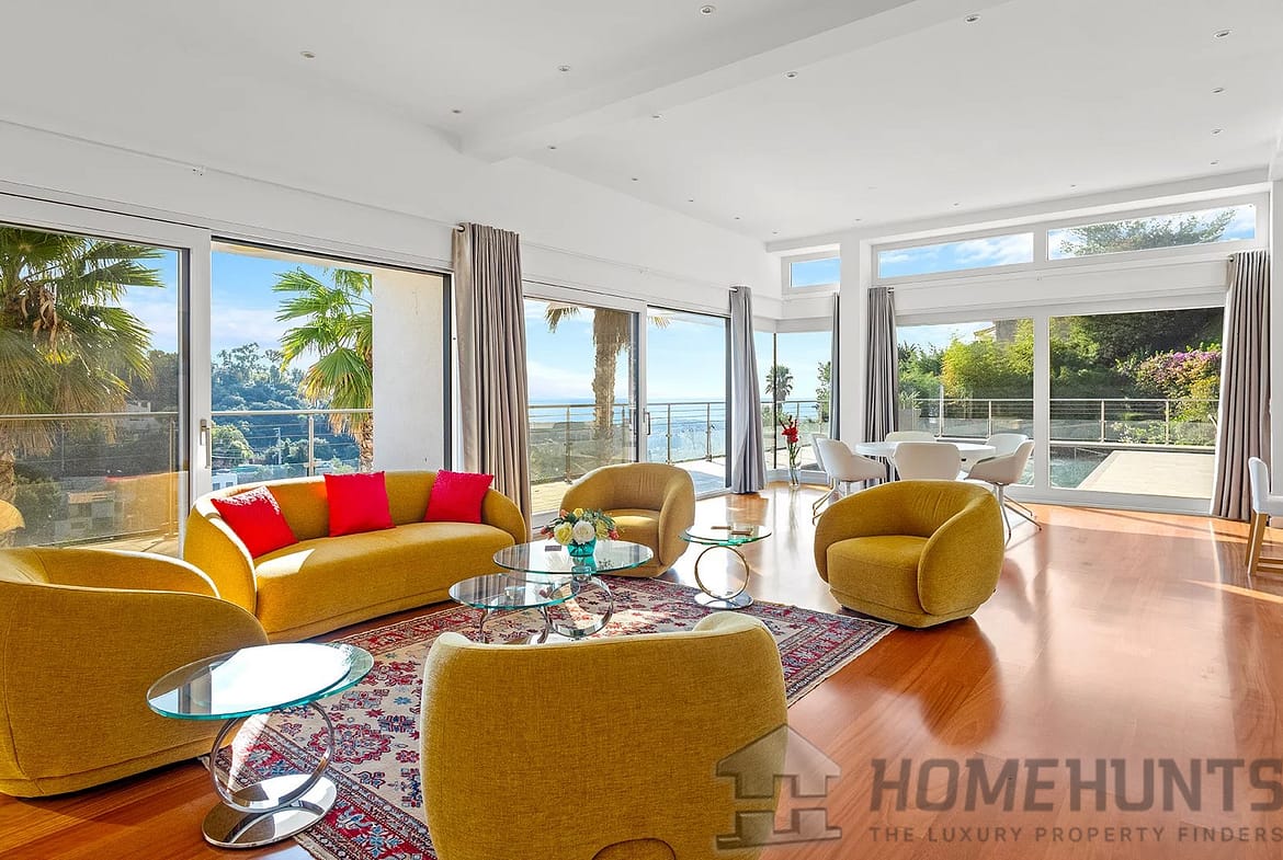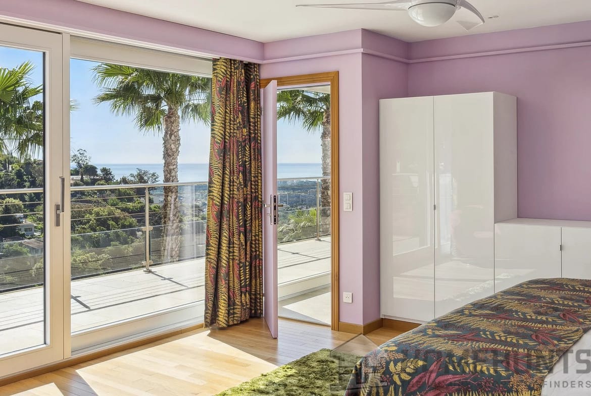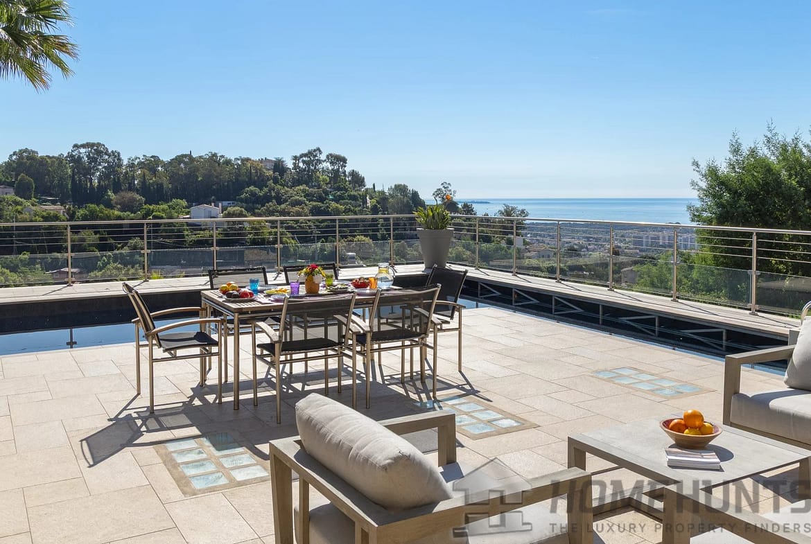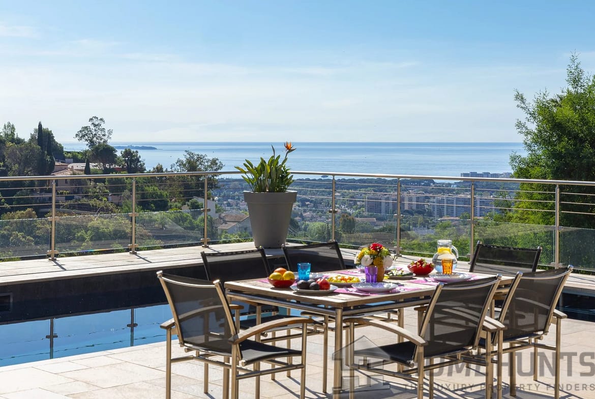 This contemporary-style villa, perched on the hills of Termes in Mandelieu, offers a panoramic view that seamlessly blend the sea with the surrounding hills.