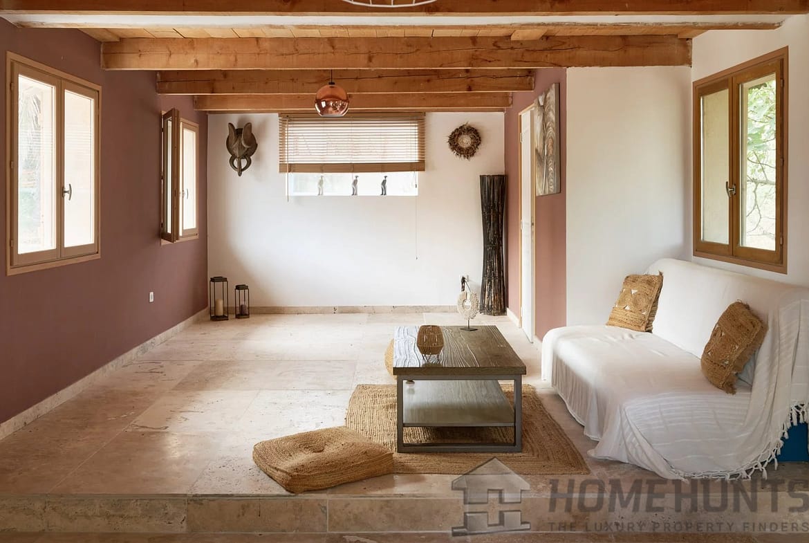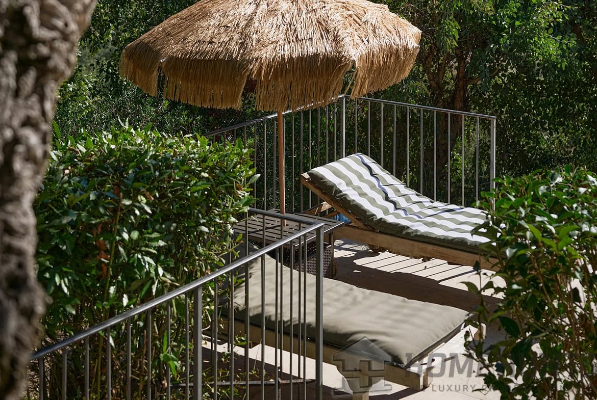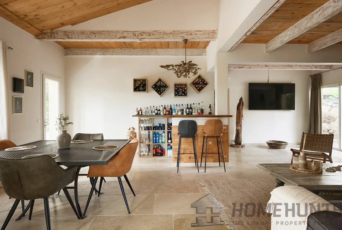 The main house features a spacious and bright living room, a fully equipped kitchen, 4 bedrooms each with en-suite bathrooms, and opens onto a large south-facing terrace with a swimming pool and open views of the surrounding landscape.