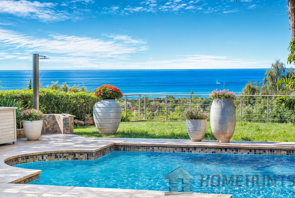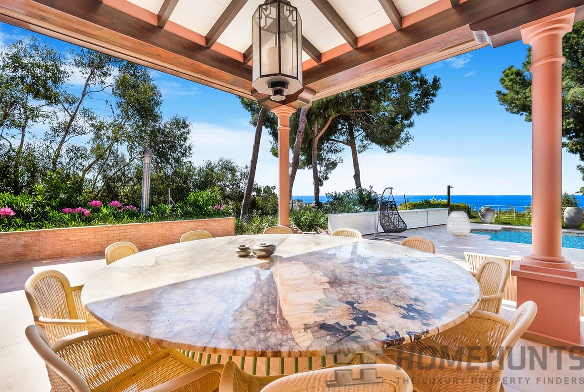 The villa boasts spectacular sea views from both the ground floor and first floor; the entrance level has a spacious open plan living and dining room with built in fireplace, lounge and access to the terrace, garden and private swimming pool; fully fitted kitchen; guest suite; and a guest toilet.
