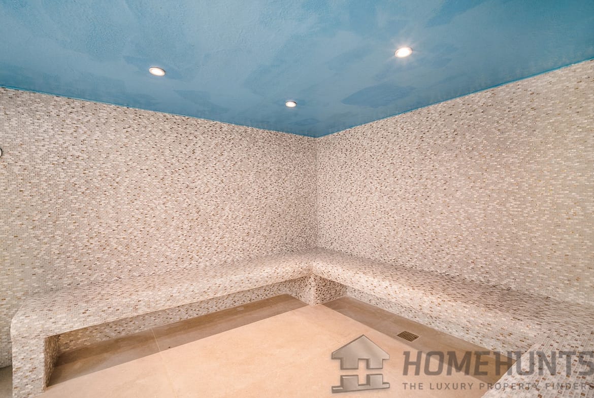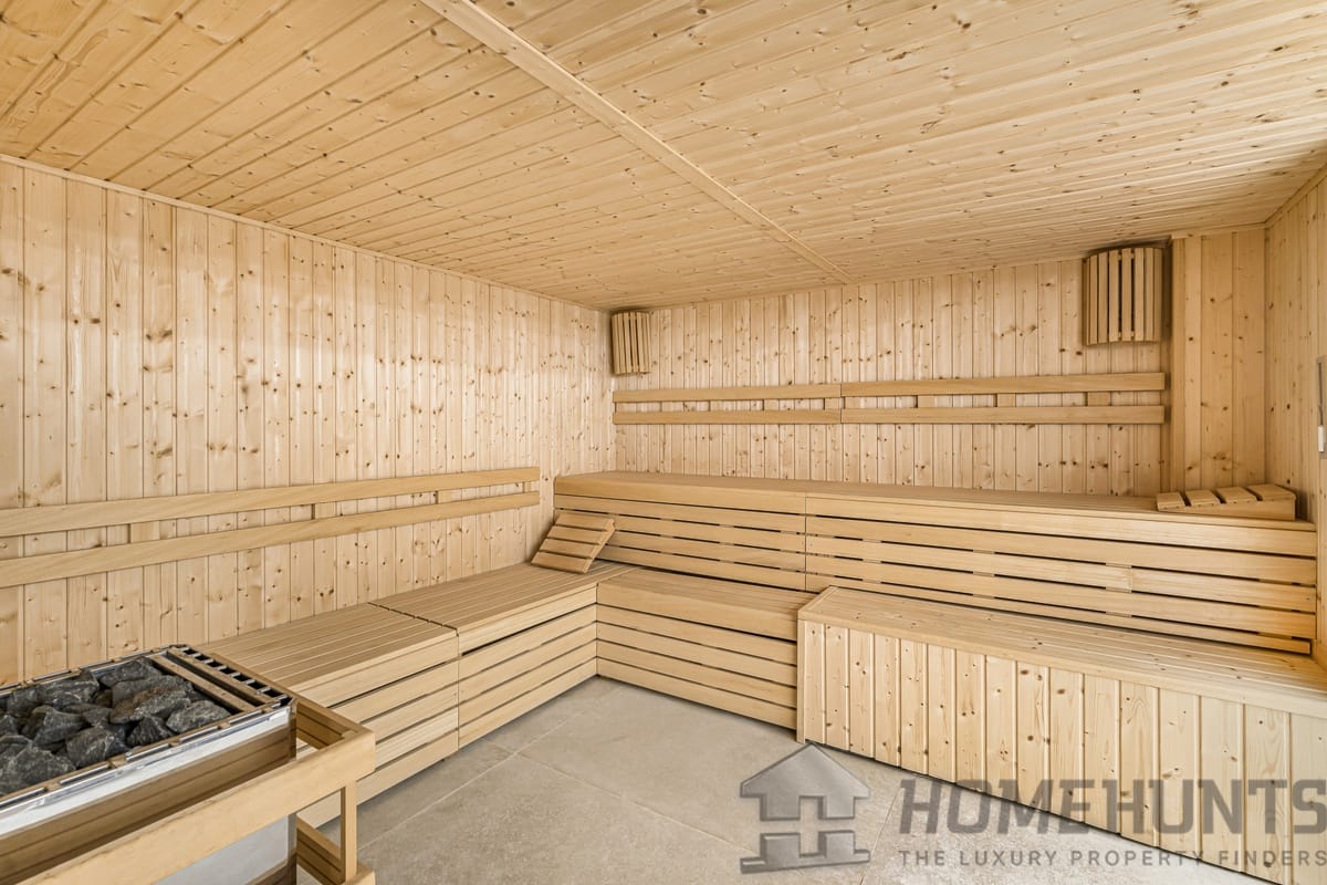 The lower level of the property leads to the gym and spa, complete with bathroom, sauna and Hamamm. There is also a storage room; laundry room; and lounge area on this level. Other features include hot and cold air conditioning, double car port, fitted wardrobes and solar panels.
