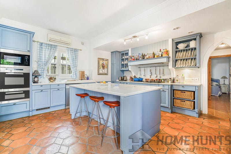 On the first floor the wide staircase leads you to the spacious master suite and dressing room, boasting captivating views and access to an additional terrace with solarium. One additional bedroom can also be found on the first floor, all maintaining the beautiful English style that permeates throughout the property.