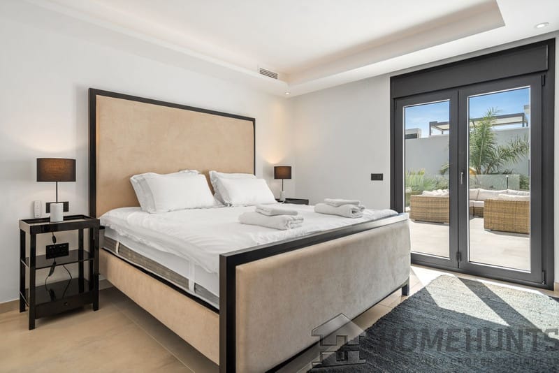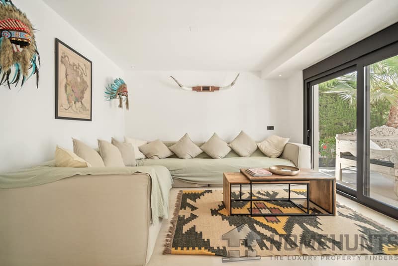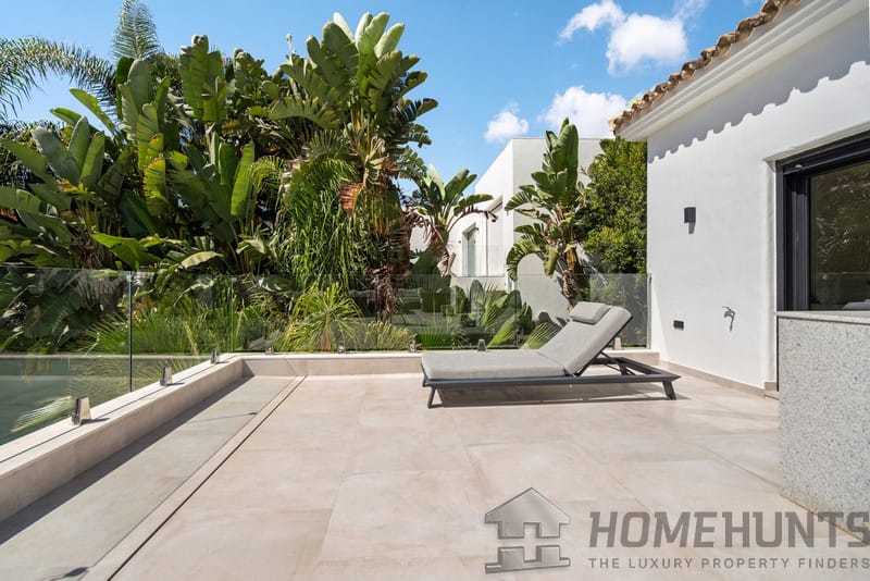 The upper level features a sophisticated chill-out lounge with sofa and TV, two large and luxurious en-suite bedrooms, one with a walk-in wardrobes and the other with fitted wardrobes. Both bedrooms and the chill out area have access to a generous sun-drenched terrace overlooking the garden.