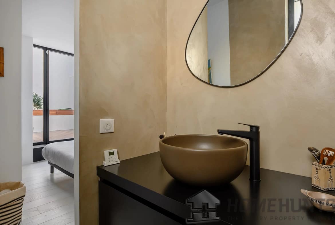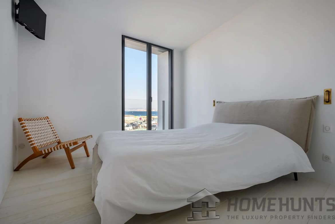 Upon entering, a refined waxed concrete staircase leads to the first floor, where an office space enjoys stunning views of the Mediterranean and the Frioul Islands. The master suite, complete with a dressing room and en-suite shower room, also faces the sea, offering a serene retreat. A second spacious bedroom, featuring its own en-suite shower room and dressing area, opens onto a tranquil patio terrace.