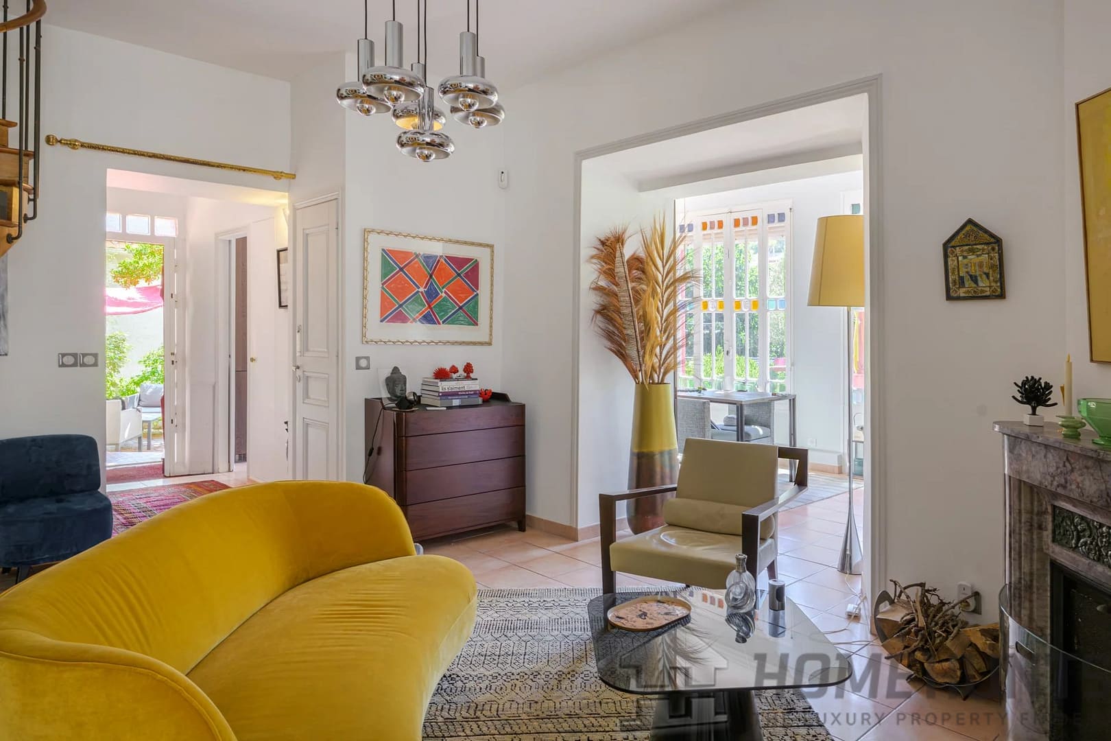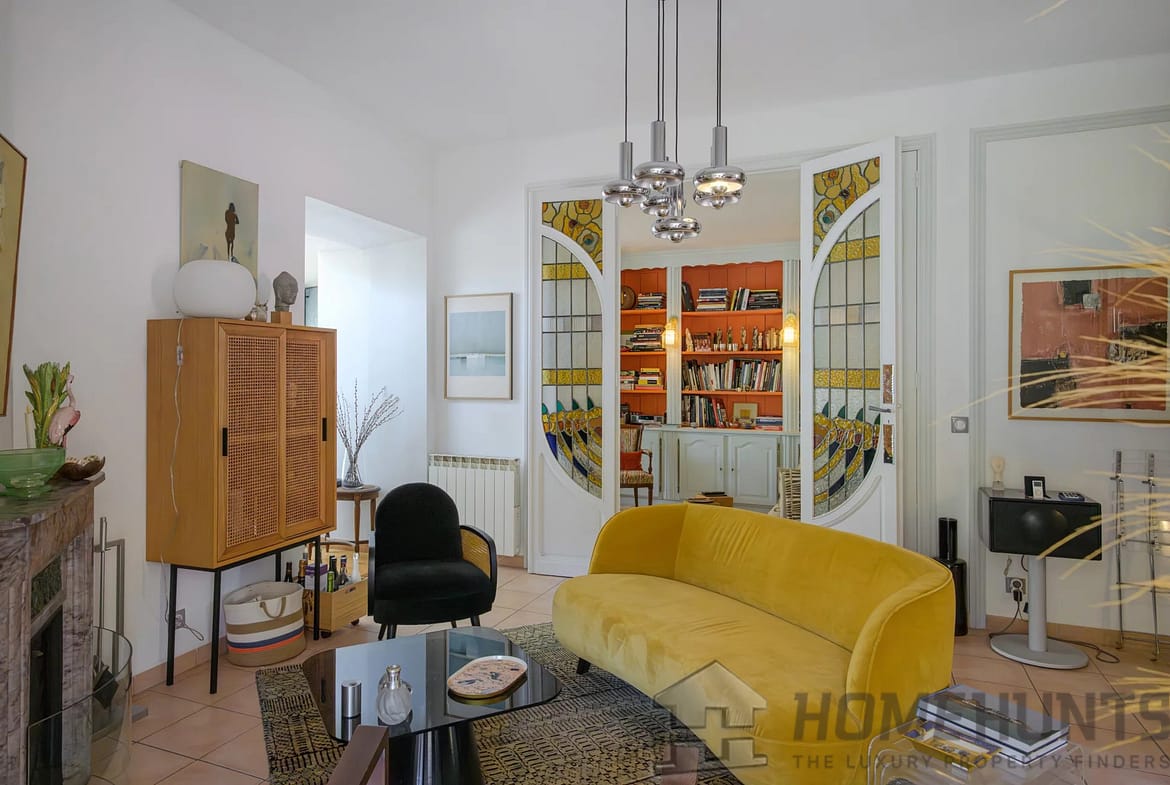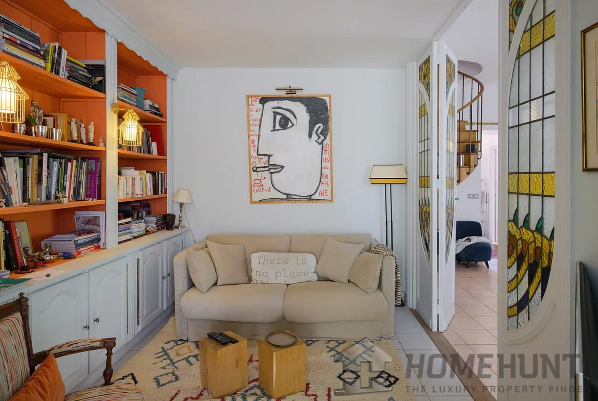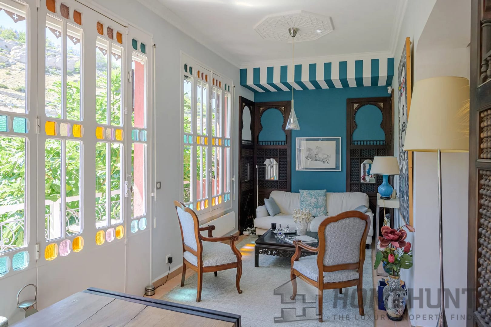 A highly refined ‘favourite’ house where each room has its own identity. A blue summer living room overlooking the garden and its multicoloured glass roof. A winter living room in warm colours with its art deco fireplace. A kitchen with a view of the Calanques, connecting the living rooms. A small TV room and an office. Colourful glasswork features in several rooms of the house. A black and white bedroom with its own bathroom on this first level. Four other bedrooms, each with its own colour scheme, bathroom and small private terrace.