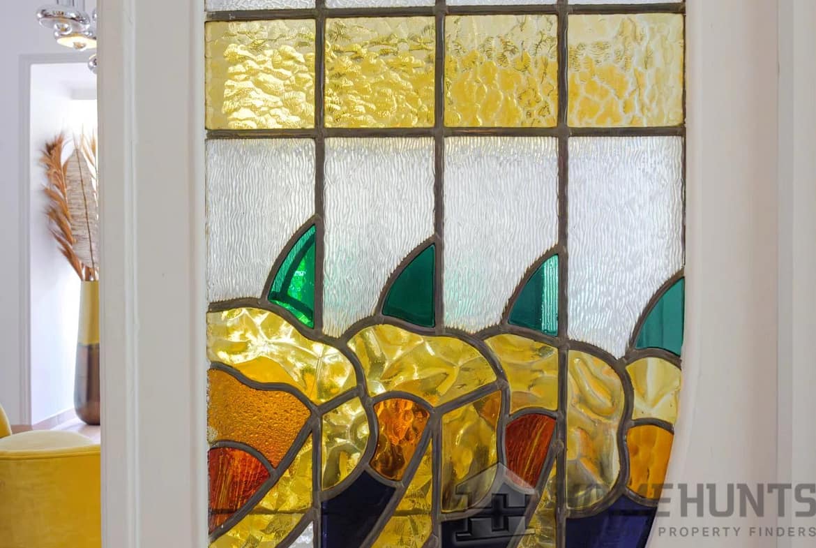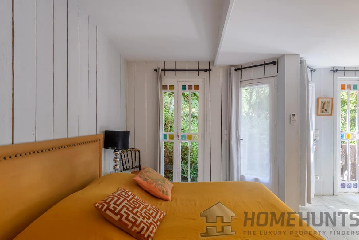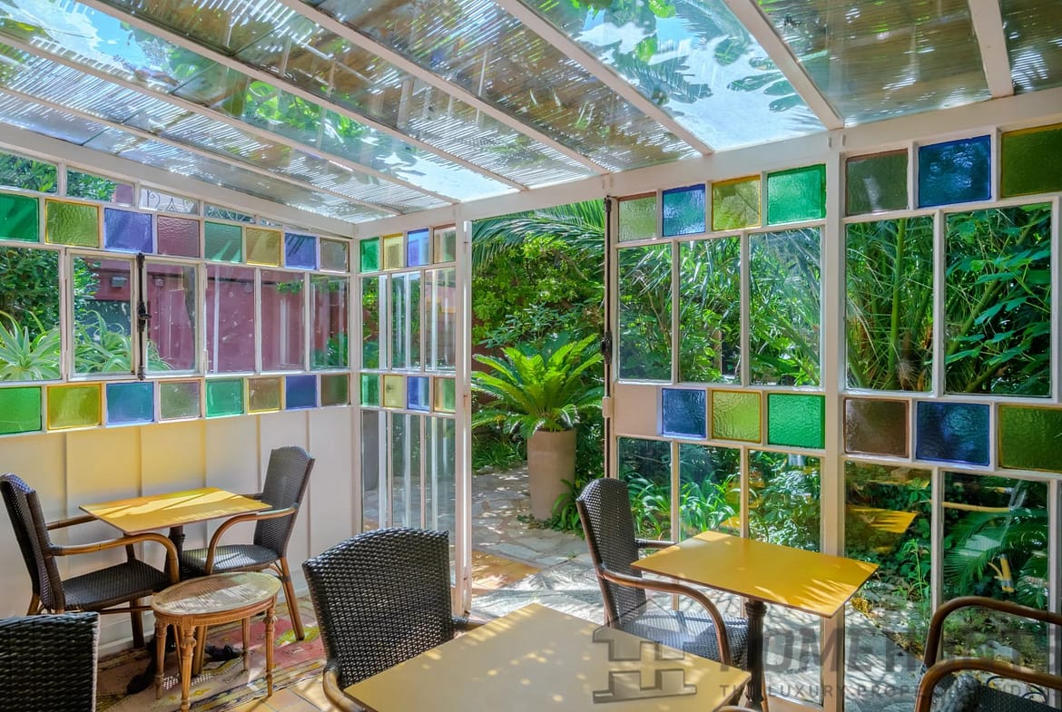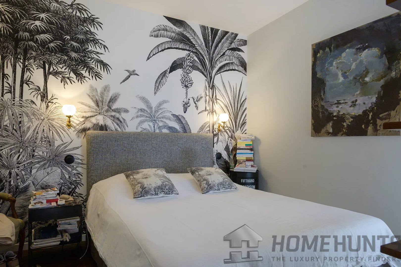 A highly refined ‘favourite’ house where each room has its own identity. A blue summer living room overlooking the garden and its multicoloured glass roof. A winter living room in warm colours with its art deco fireplace. A kitchen with a view of the Calanques, connecting the living rooms. A small TV room and an office. Colourful glasswork features in several rooms of the house. A black and white bedroom with its own bathroom on this first level. Four other bedrooms, each with its own colour scheme, bathroom and small private terrace.