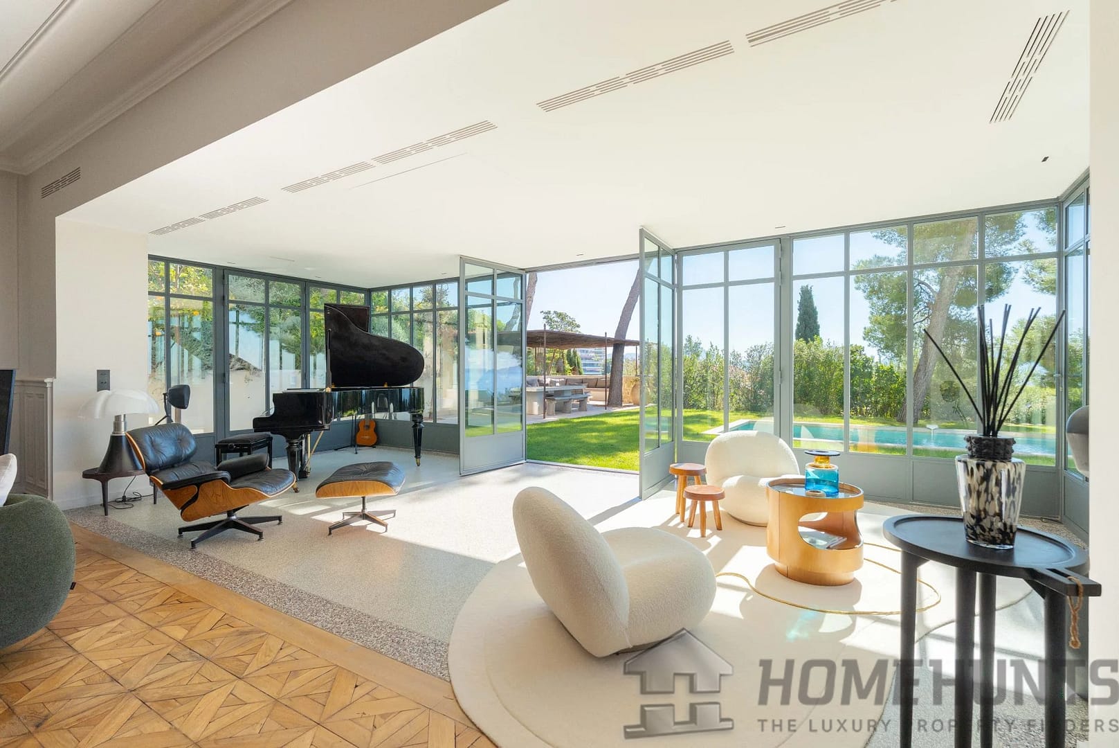 The sea, ever-present, reveals itself through wide openings. To the south, a granite-floored glass veranda opens onto a Mediterranean garden planted with orange trees, olive trees, and umbrella pines, enhanced by an infinity pool, a summer kitchen, and a hammam. To the west, a distinctive terrace combines carved woodwork, original cement tiles, and period faience.