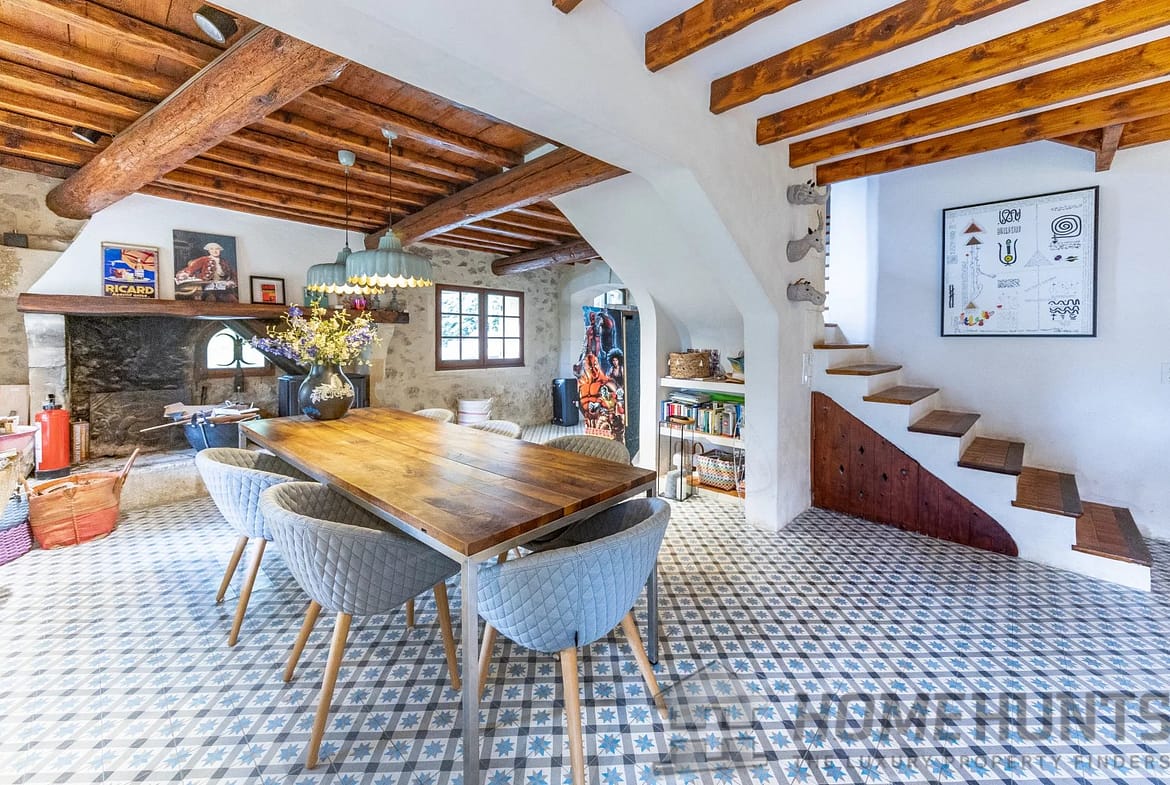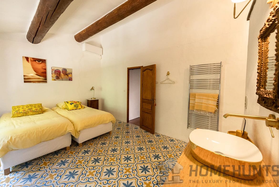 The main house, in a rustic style, spans just under 300 m2 and comprises a kitchen, dining room and sitting room as well as 6 en-suite bedrooms and a study.