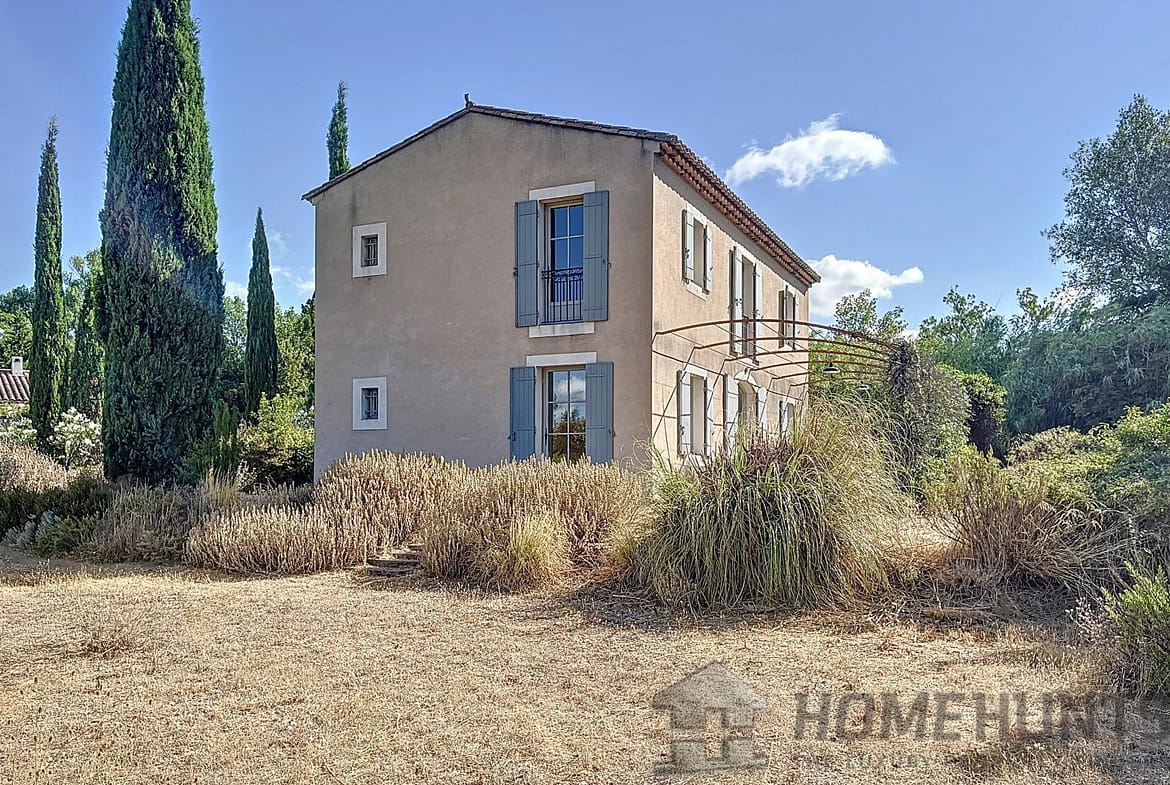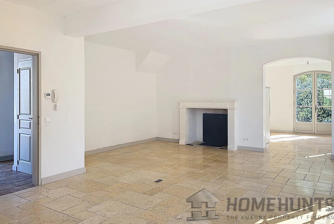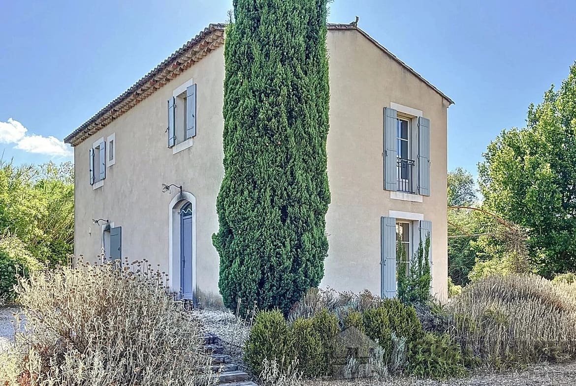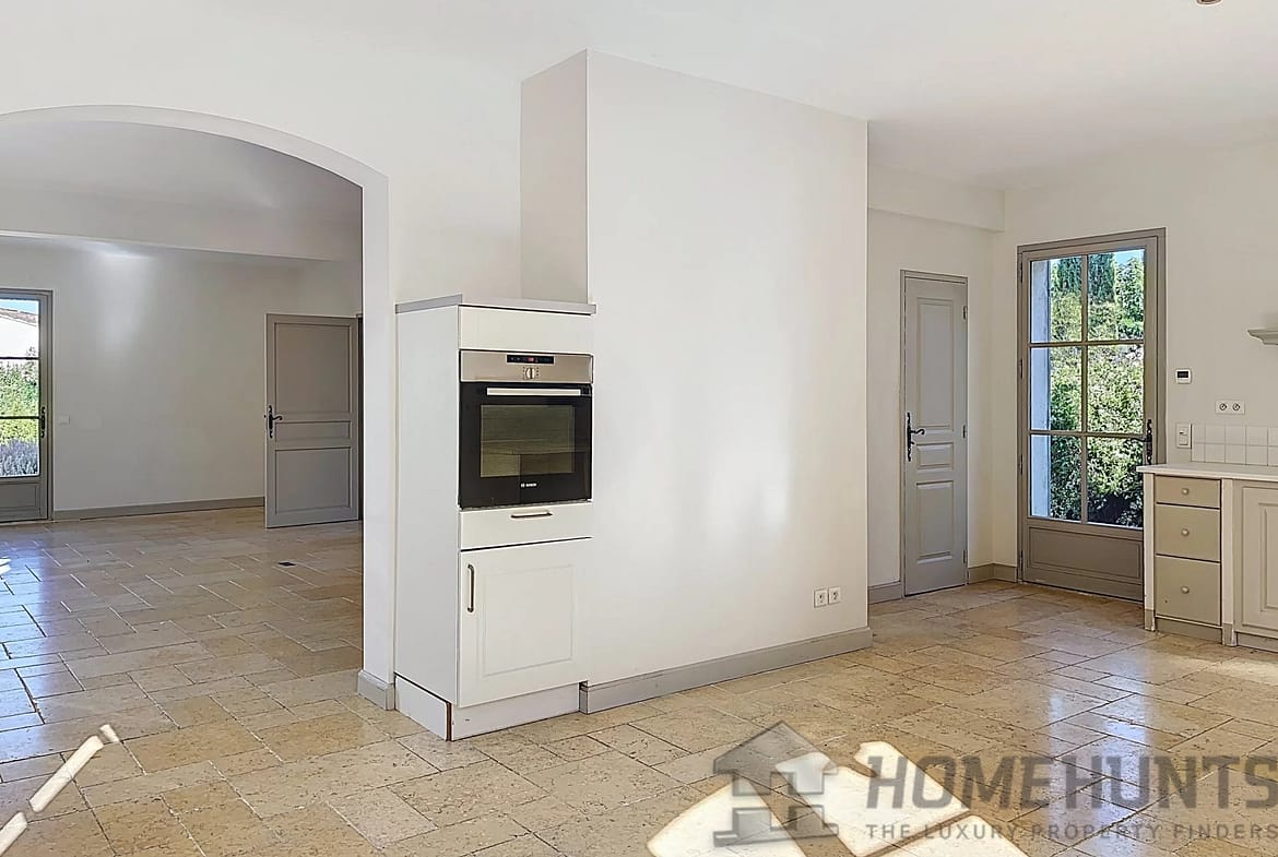 The house opens onto an entrance hall with built-in cupboards, a bright fitted kitchen opening directly onto the garden and a shaded terrace with a trellis, ideal for summer meals. The warm, spacious living room features a natural stone floor and a Baux stone fireplace. A guest toilet completes this level.