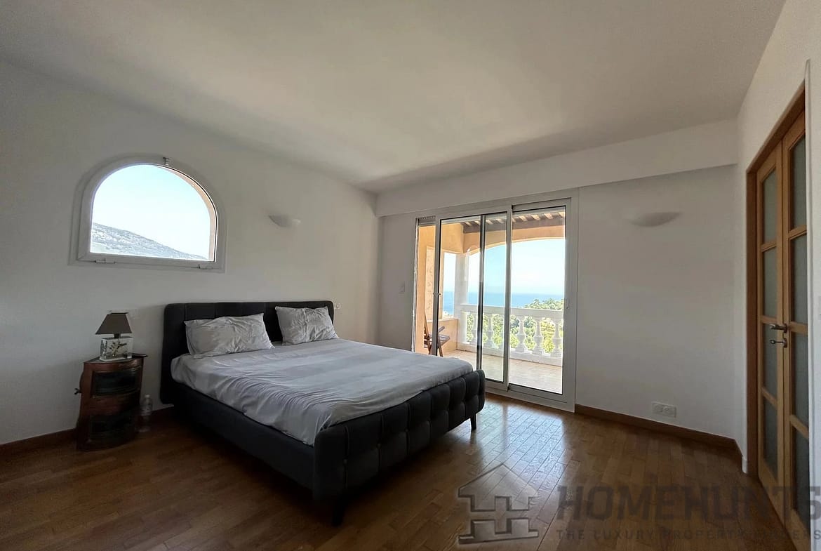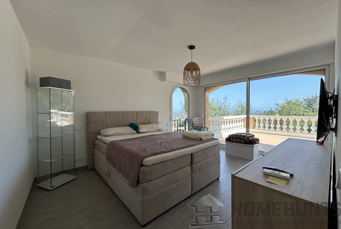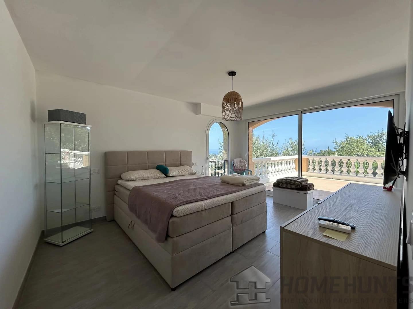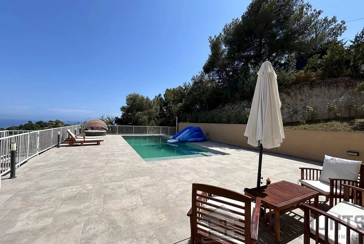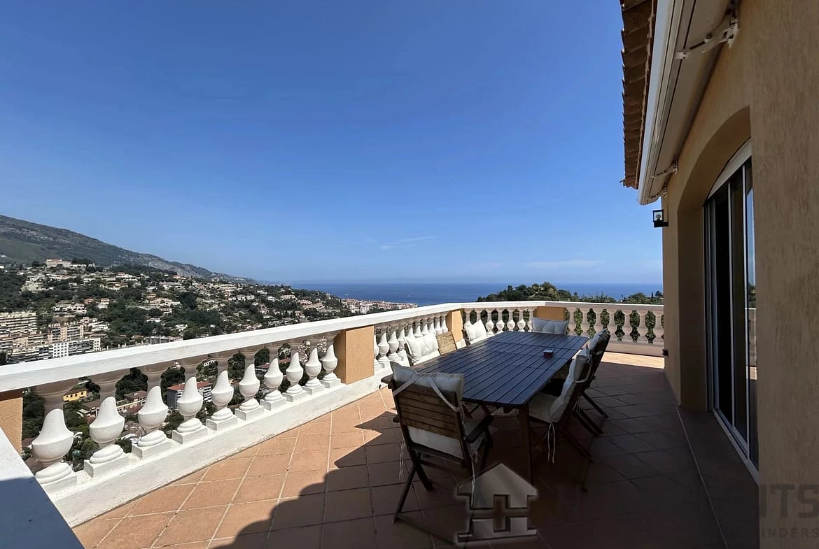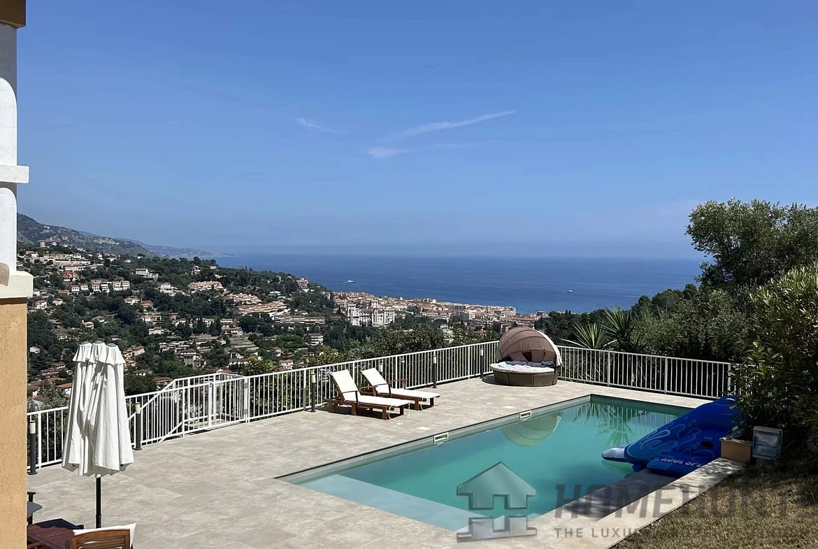 In a sought-after residential area of Menton, beautiful family sized sea view property set in 2,152 m2 of gardens with heated swimming pool and panoramic sea and mountain views.