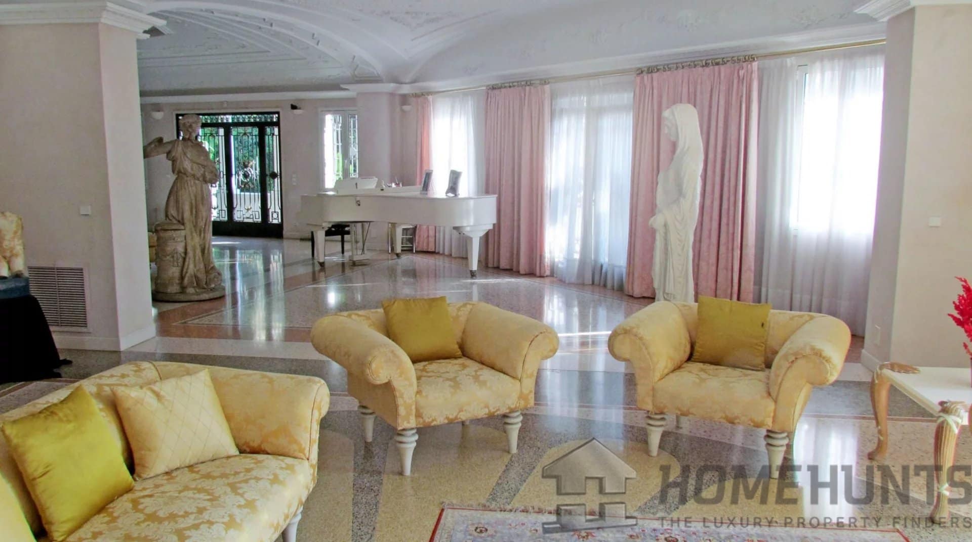 The main villa impresses with a triple reception room, a fully equipped kitchen, five en suite bedrooms, and a private gym, combining classic elegance with modern comfort.