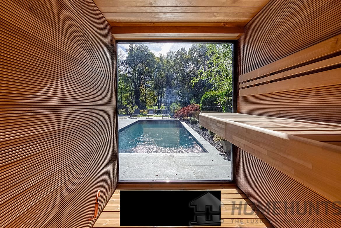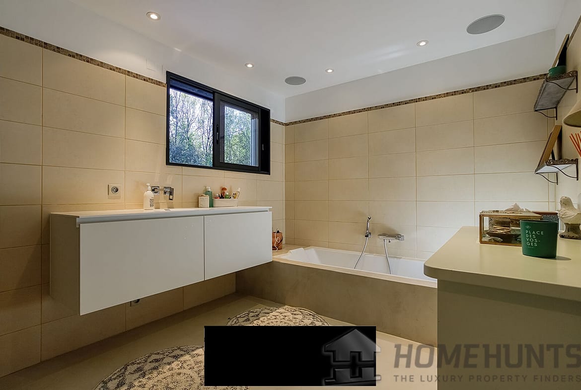 As an extension of the terrace, a wellness area for relaxation (sauna-hammam) was created by the owners. A spacious garage and a parking area complete the beautiful features of this atypical house.