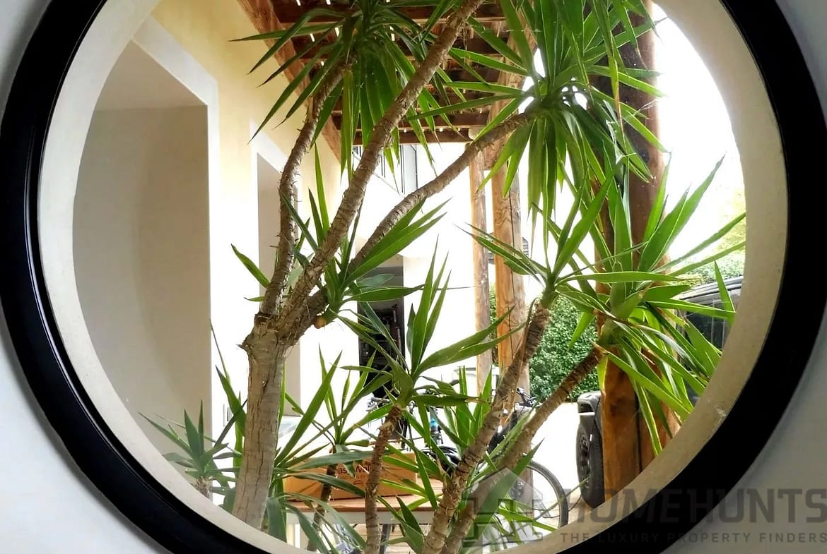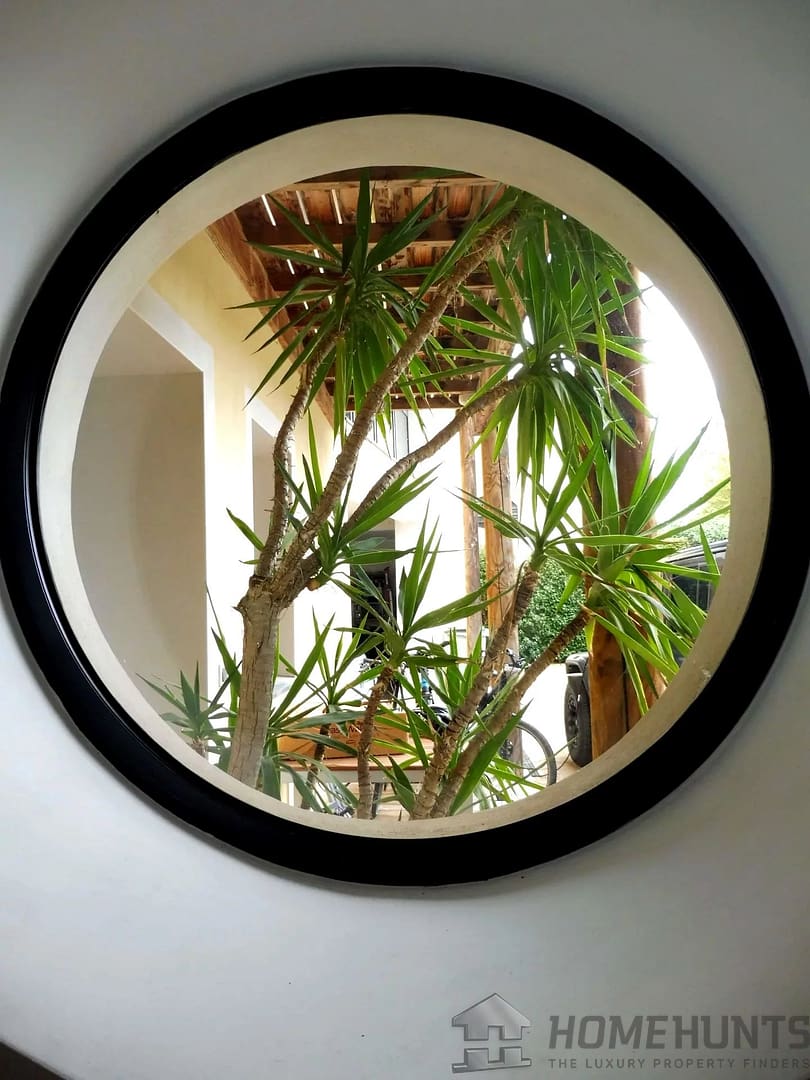 The exotic-inspired garden frames a swimming pool and pool house. The old bread oven is a reminder of the house’s origins.