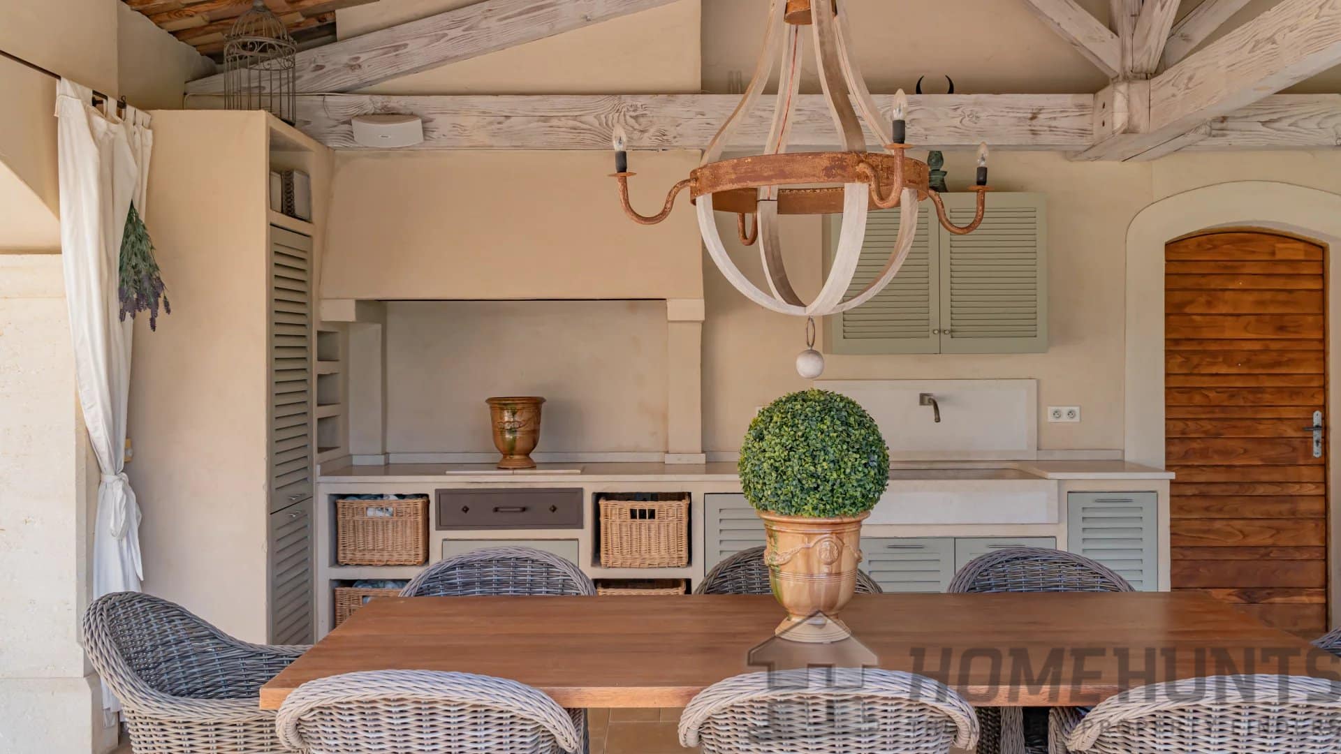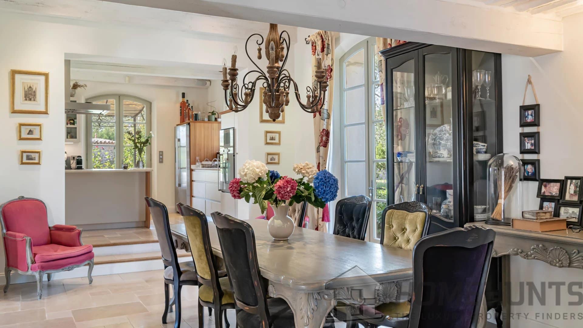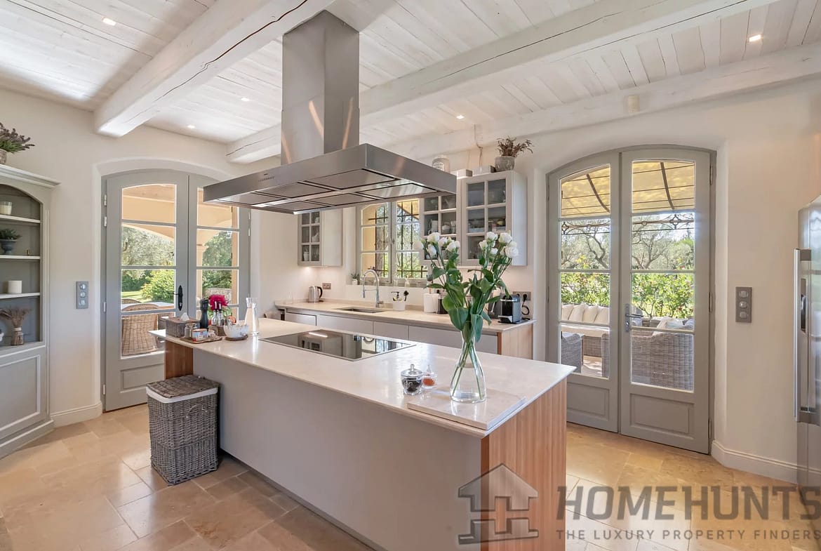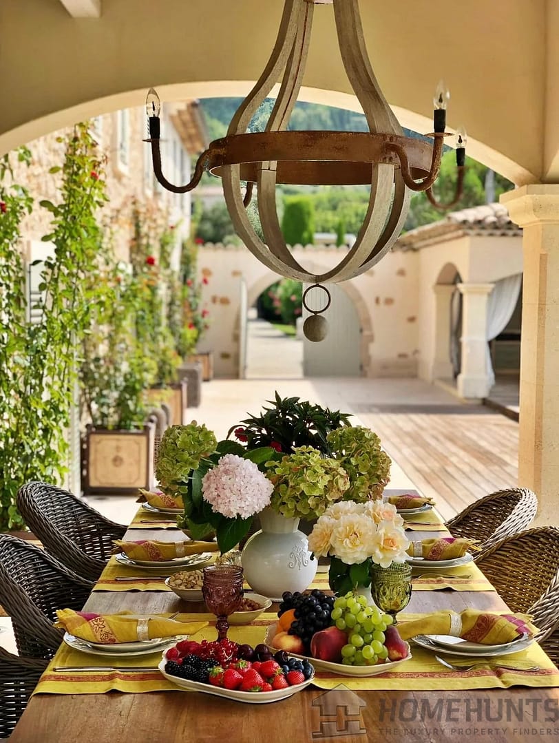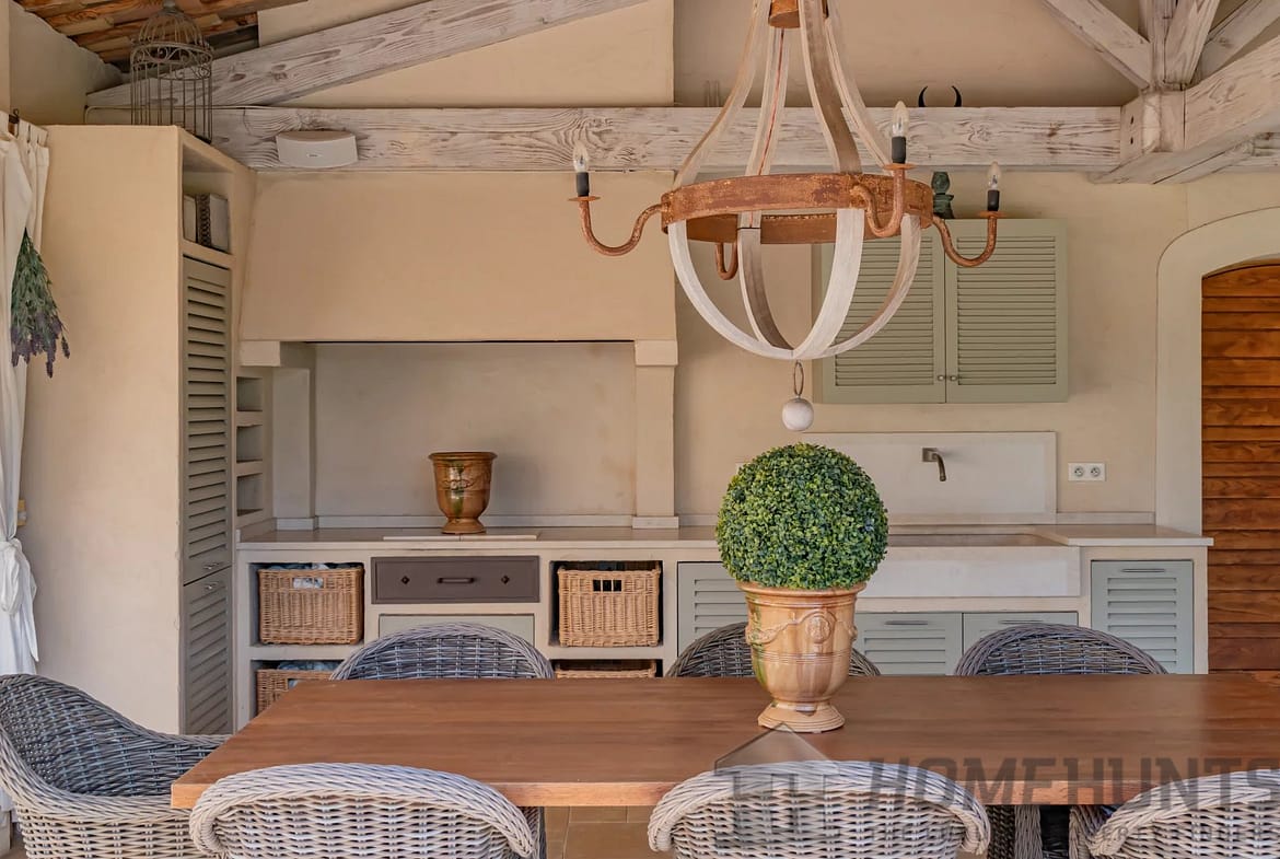 The outdoor spaces are designed for effortless Mediterranean living. An impressive pool house with a fully equipped kitchen, dining, and lounge area offers the ideal setting for relaxed gatherings, while an elegant covered terrace adjoining the kitchen provides a seamless flow between indoor and outdoor dining. Beneath the shade of mature olives and vines, a charming pergola shelters a long dining table, evoking the essence of Provencal conviviality.