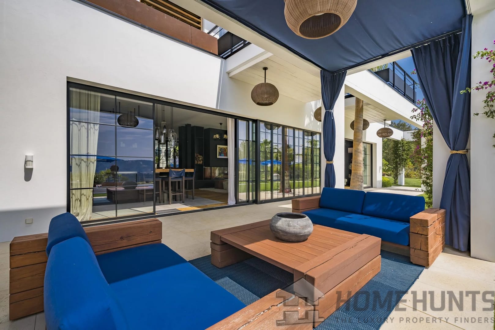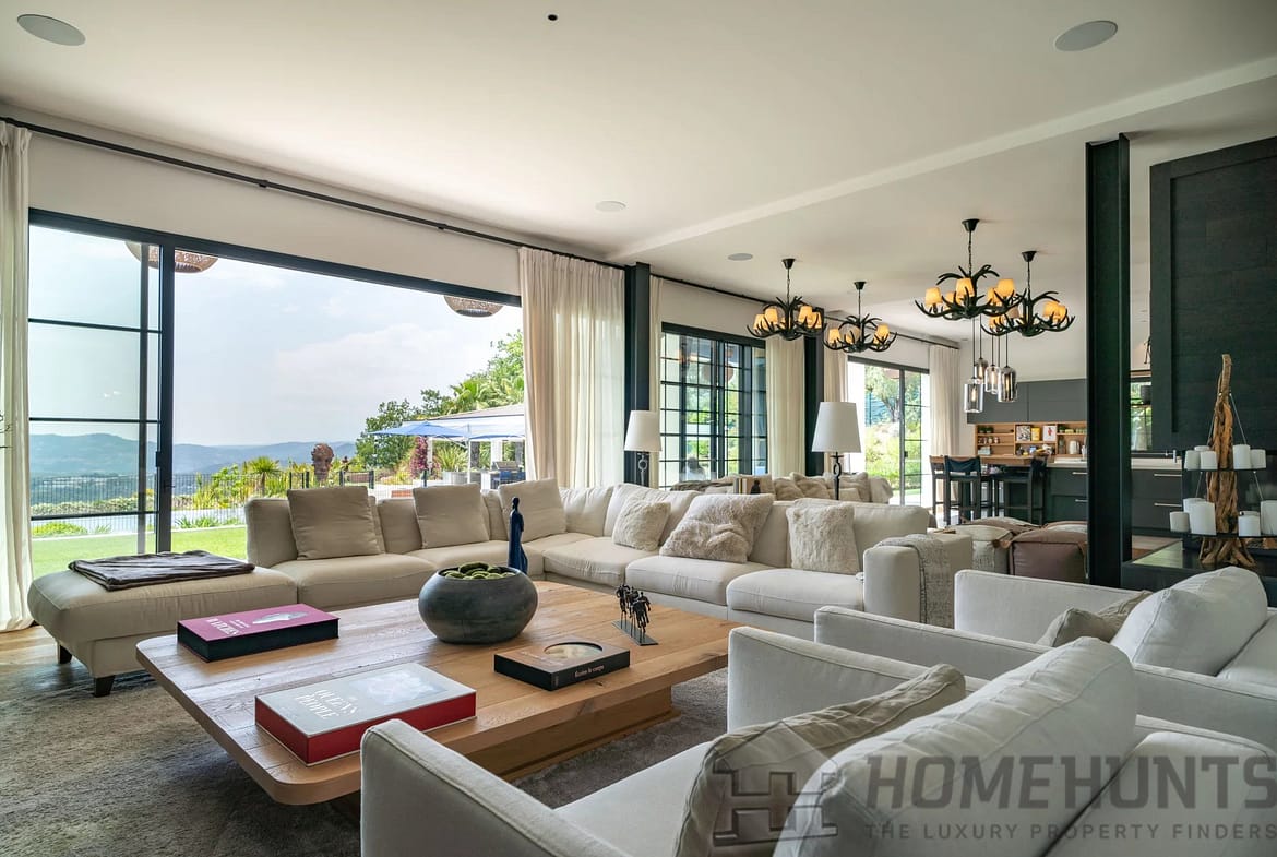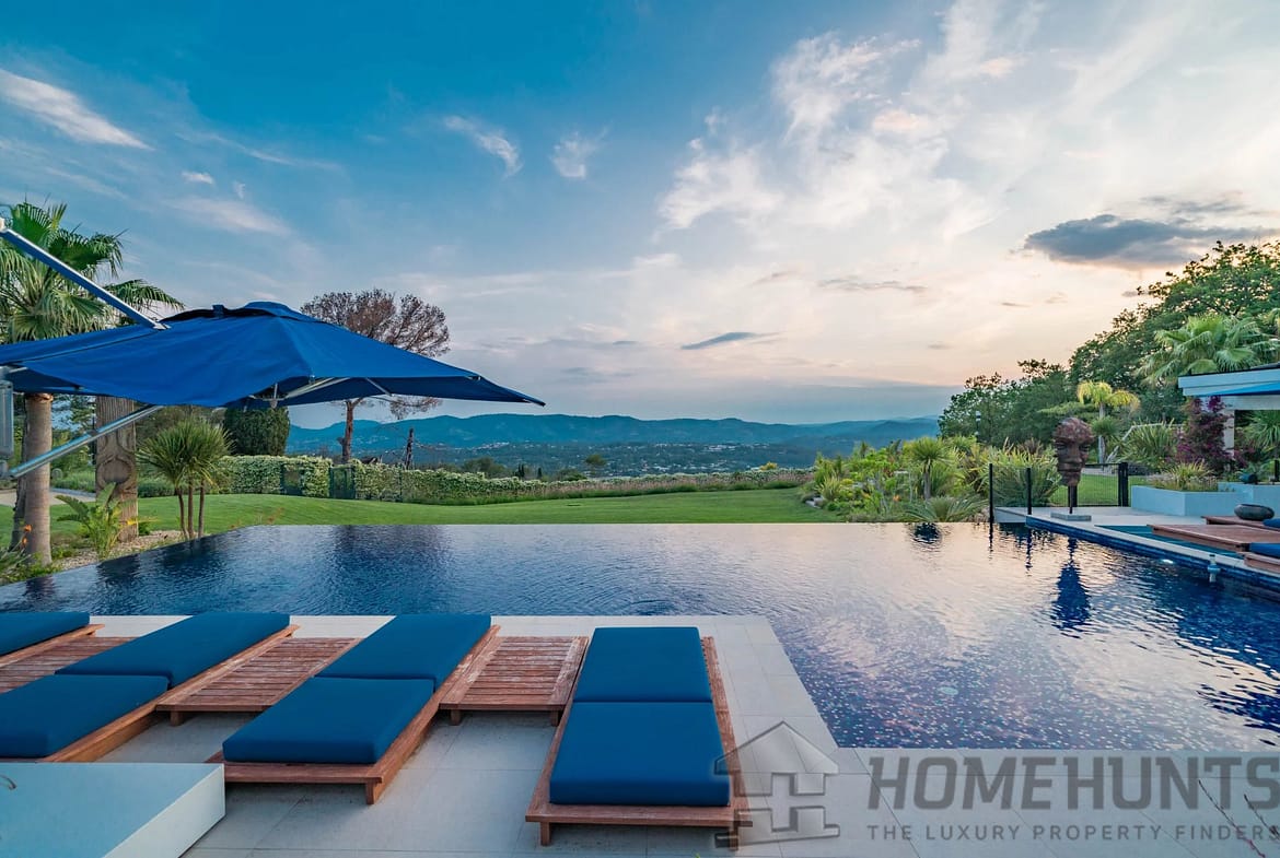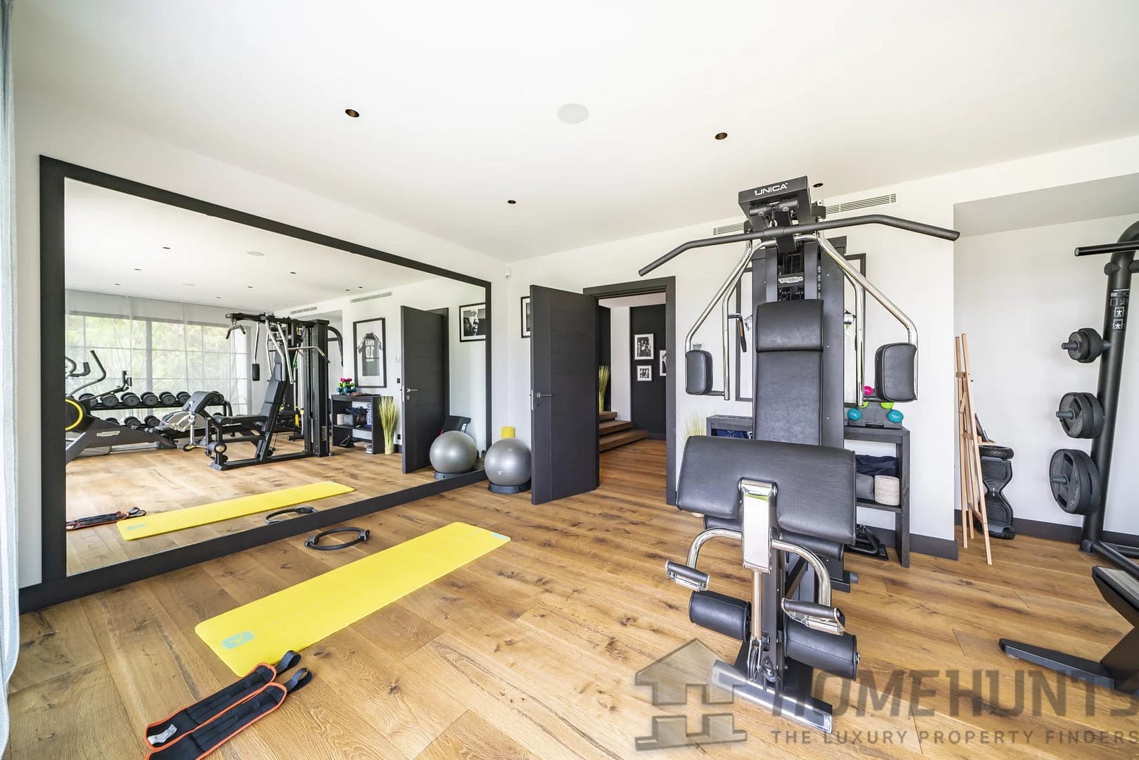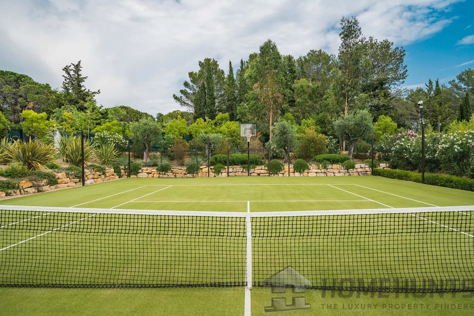 Six generously proportioned bedroom suites, each with terrace or garden access, complement the home’s amenities, which include a fully equipped gym overlooking a professional tennis court. Sweeping countryside vistas, particularly stunning at sunset, further enhance the property’s allure.