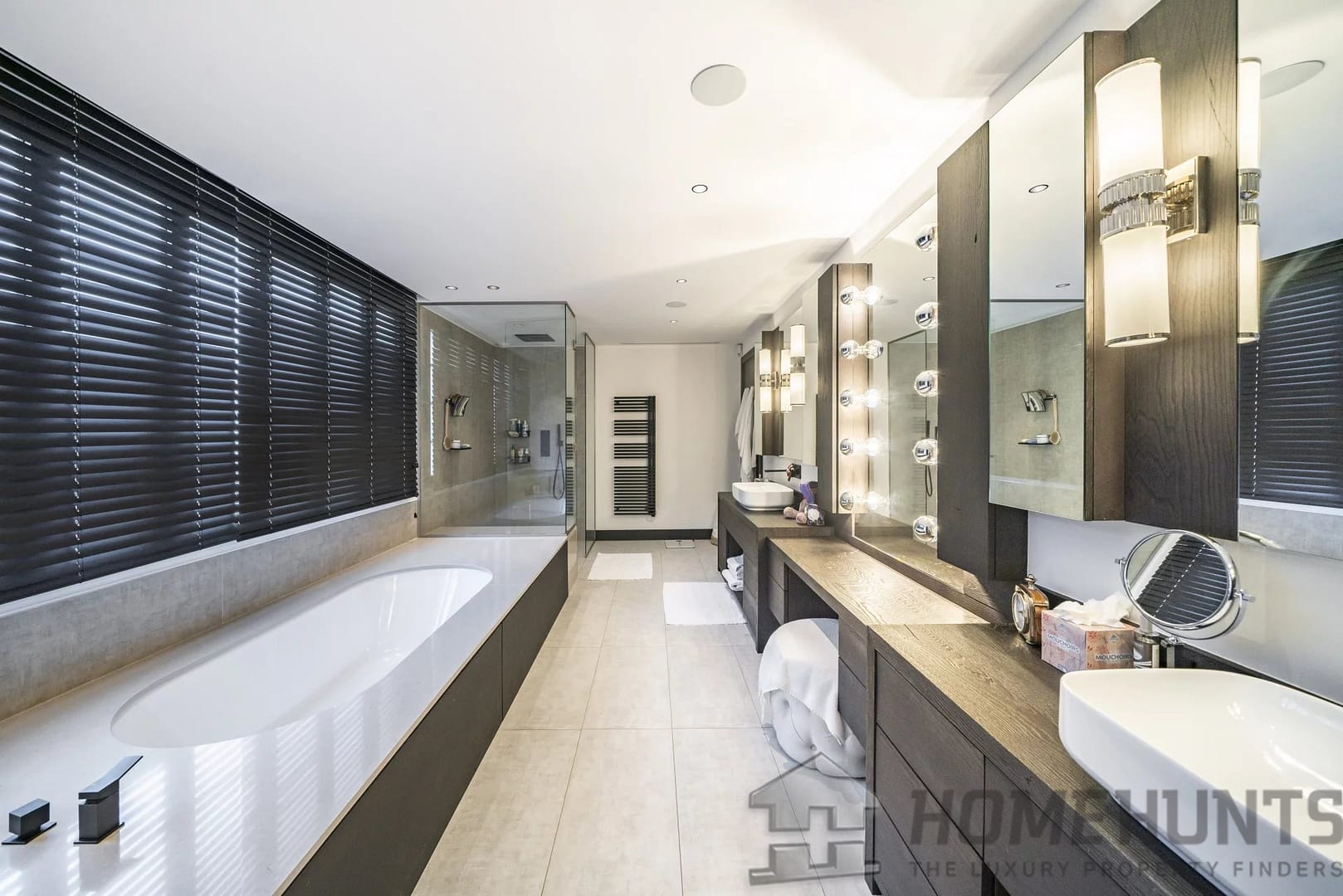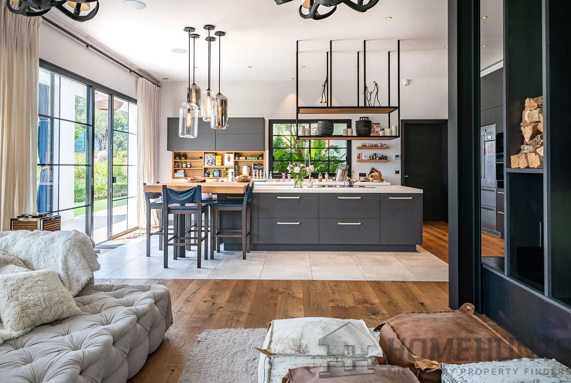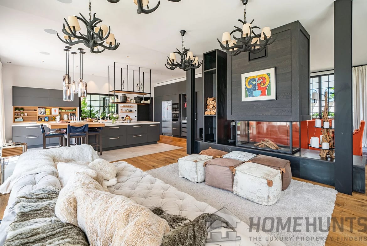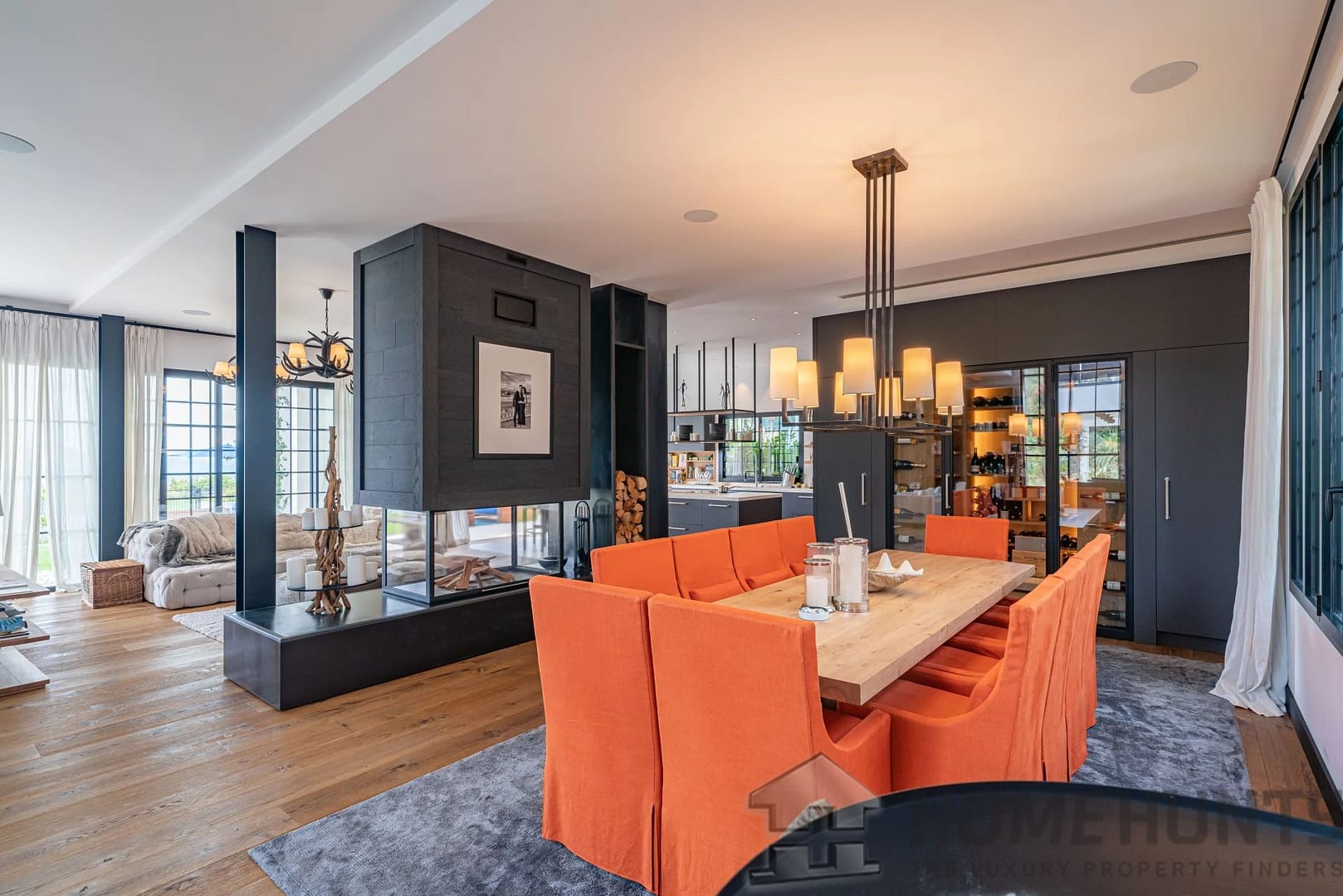 Upon entry, the foyer offers breathtaking vistas extending through the living area to the pool and beyond. The main level boasts a cloakroom and guest WC, leading past a striking staircase and floor-to-ceiling windows to the first segment of the living room, complete with a central 360-degree fireplace. Adjacent to the open-plan dining room lies a sleek glass-walled wine cellar, while on the opposite side of the hearth, a cosy lounge adjoins the spacious kitchen with a breakfast bar. Behind the kitchen lies a dry storage area, laundry room, and access to the garage.