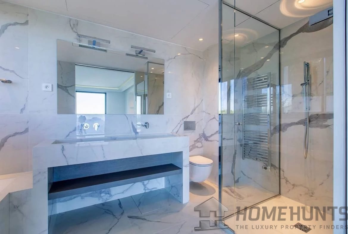 Ground floor: entrance hall, living room with 85 m2 open-plan kitchen, utility room, master bedroom with dressing room and bathroom. First floor: 3 bedrooms with en suite bathrooms and terraces.