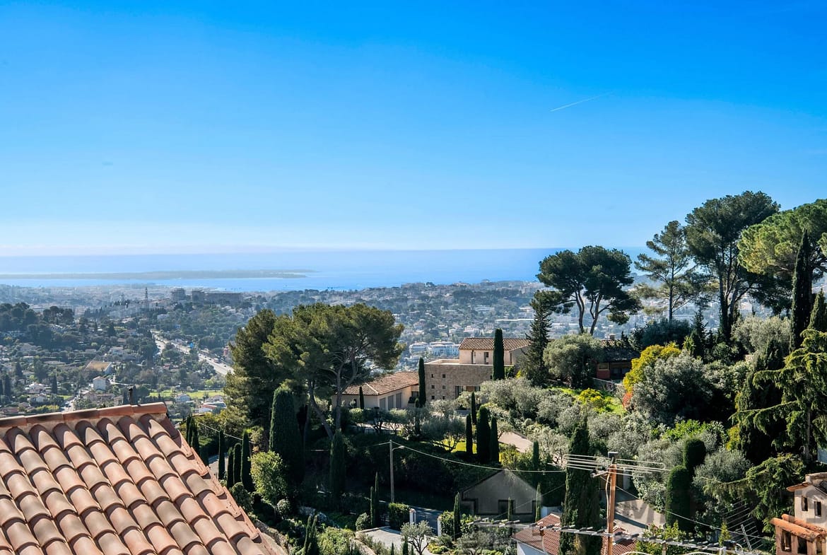 Moving to the top floor, the living and dining room opens up to a stunning terrace that embraces a panoramic view spanning 180 degrees. This elevated vantage point invites you to immerse yourself in the tranquil beauty of the Bay of Cannes directly ahead, with its surrounding sea. To the right, behold the charm of the old town with its church, while to the left, marvel at the majestic allure of the mountains.