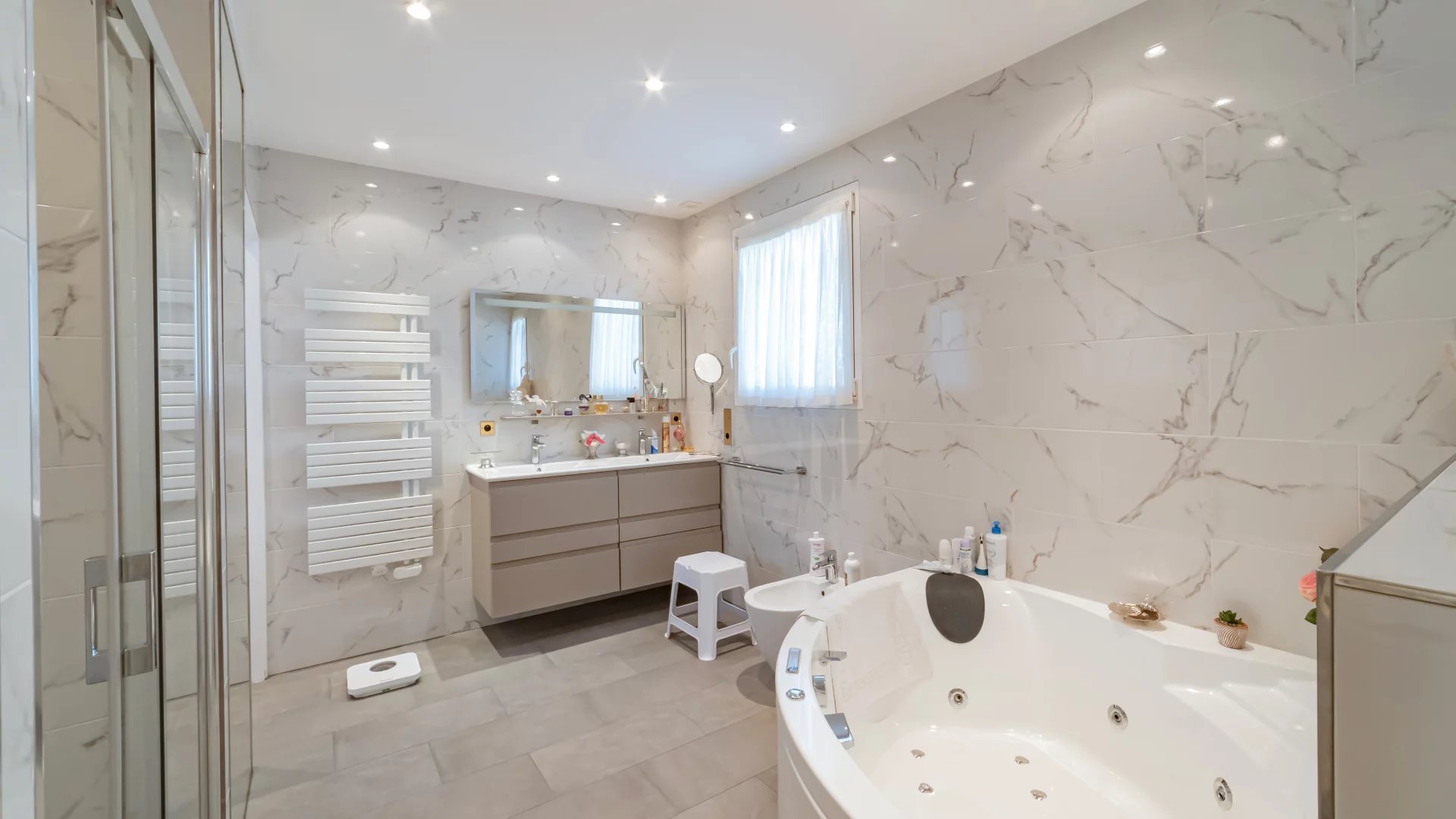 The majestic entrance, with its cathedral-style hall, opens into a spacious and light-filled living area. The living and dining rooms, enhanced by a cosy fireplace, lead to a modern, fully equipped kitchen with a functional pantry. All of these living spaces open onto beautiful terraces, a sublime garden with a swimming pool, and a 45 m2 pool house that can be closed and heated during the winter months.