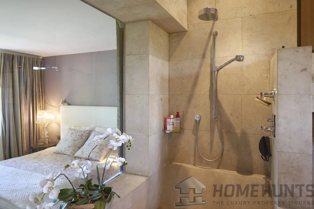 An independent guest or caretaker apartment with living room and open kitchen, a bedroom with a shower room and dressing area.