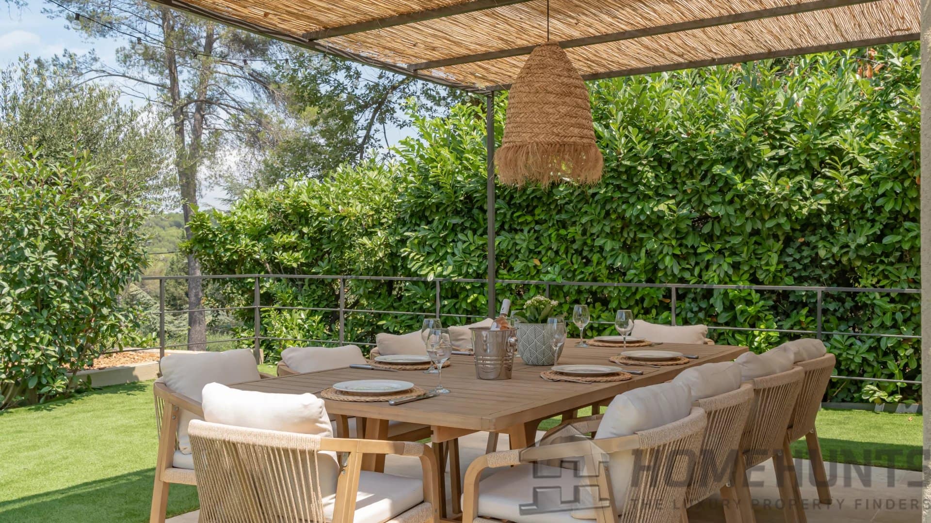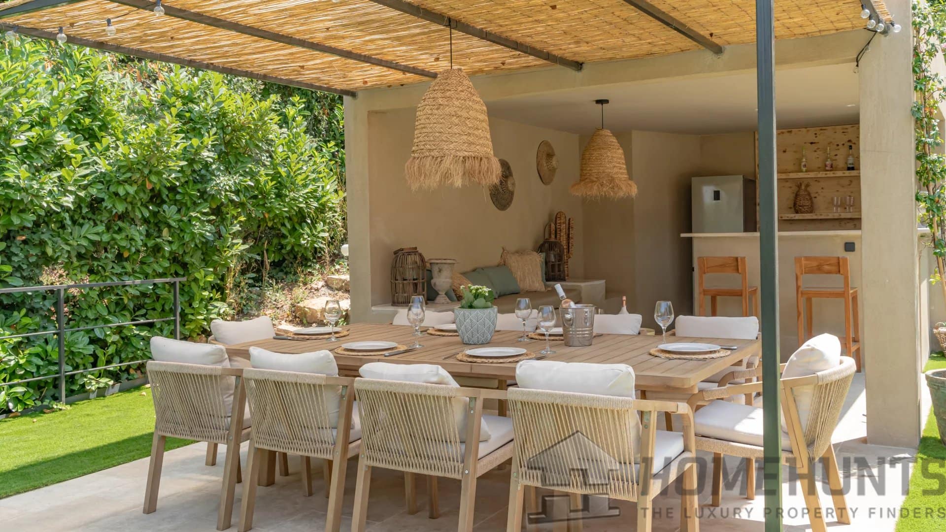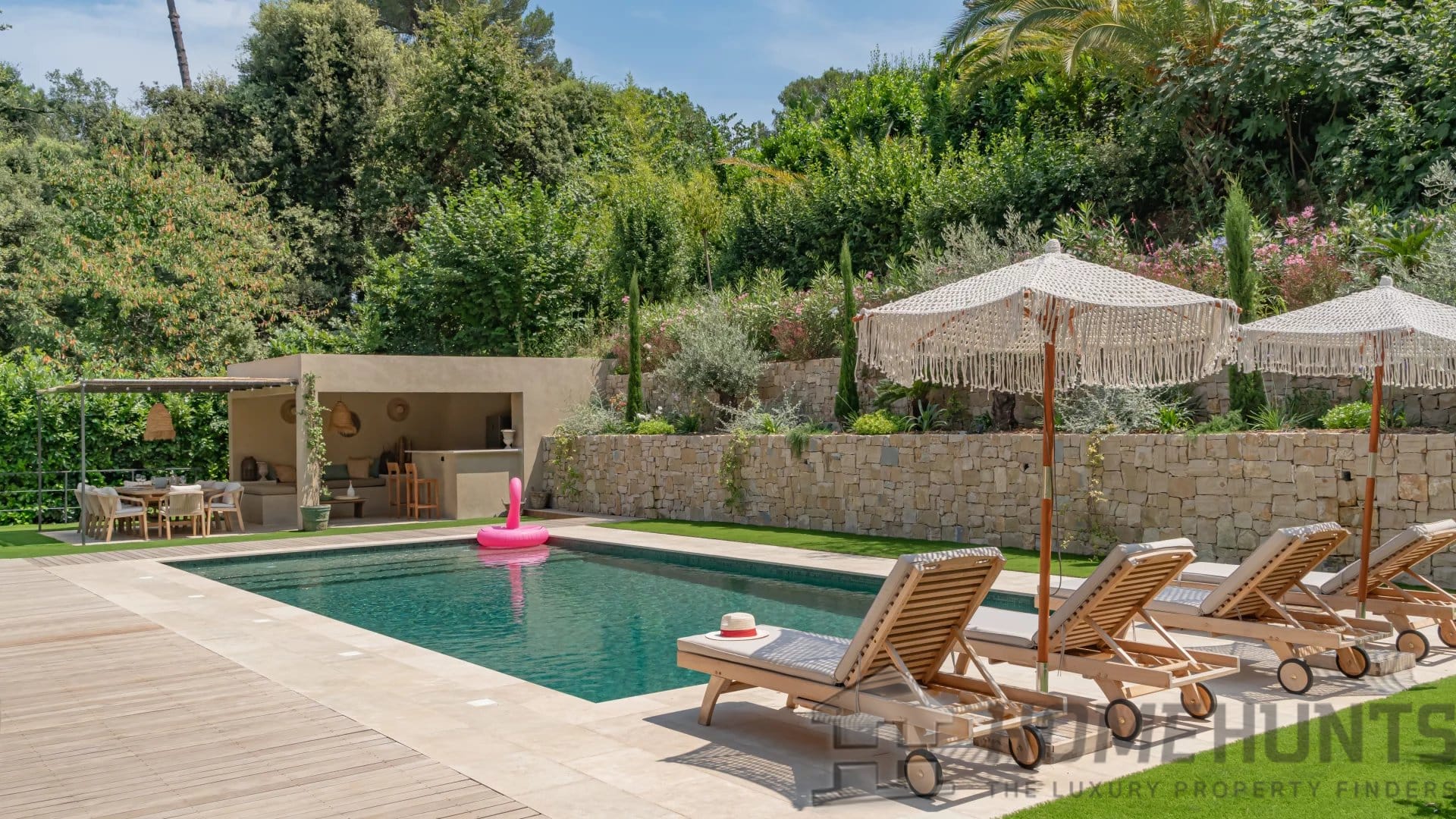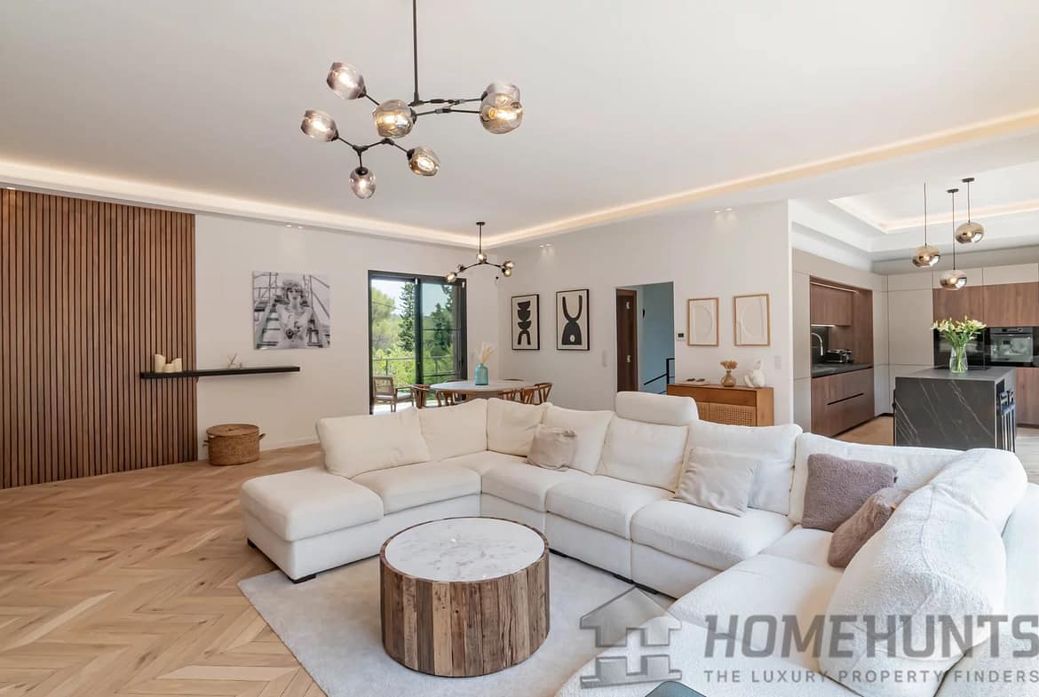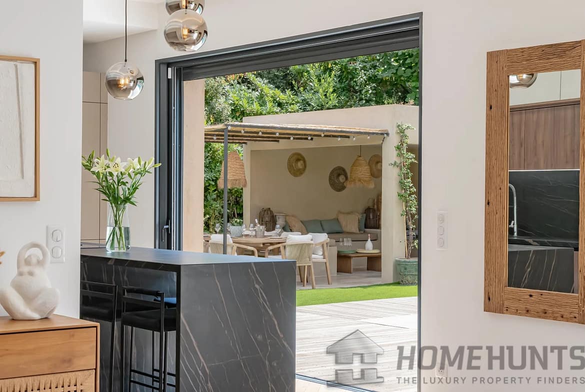 The bright, open living spaces extend naturally onto the lush landscaped garden, where a sparkling swimming pool and fully equipped summer kitchen invite outdoor living under the Riviera sun.