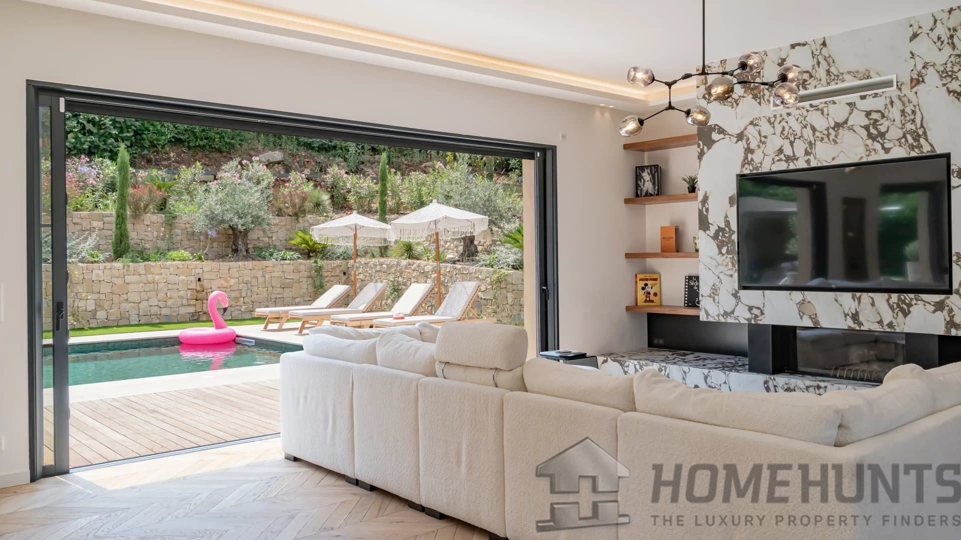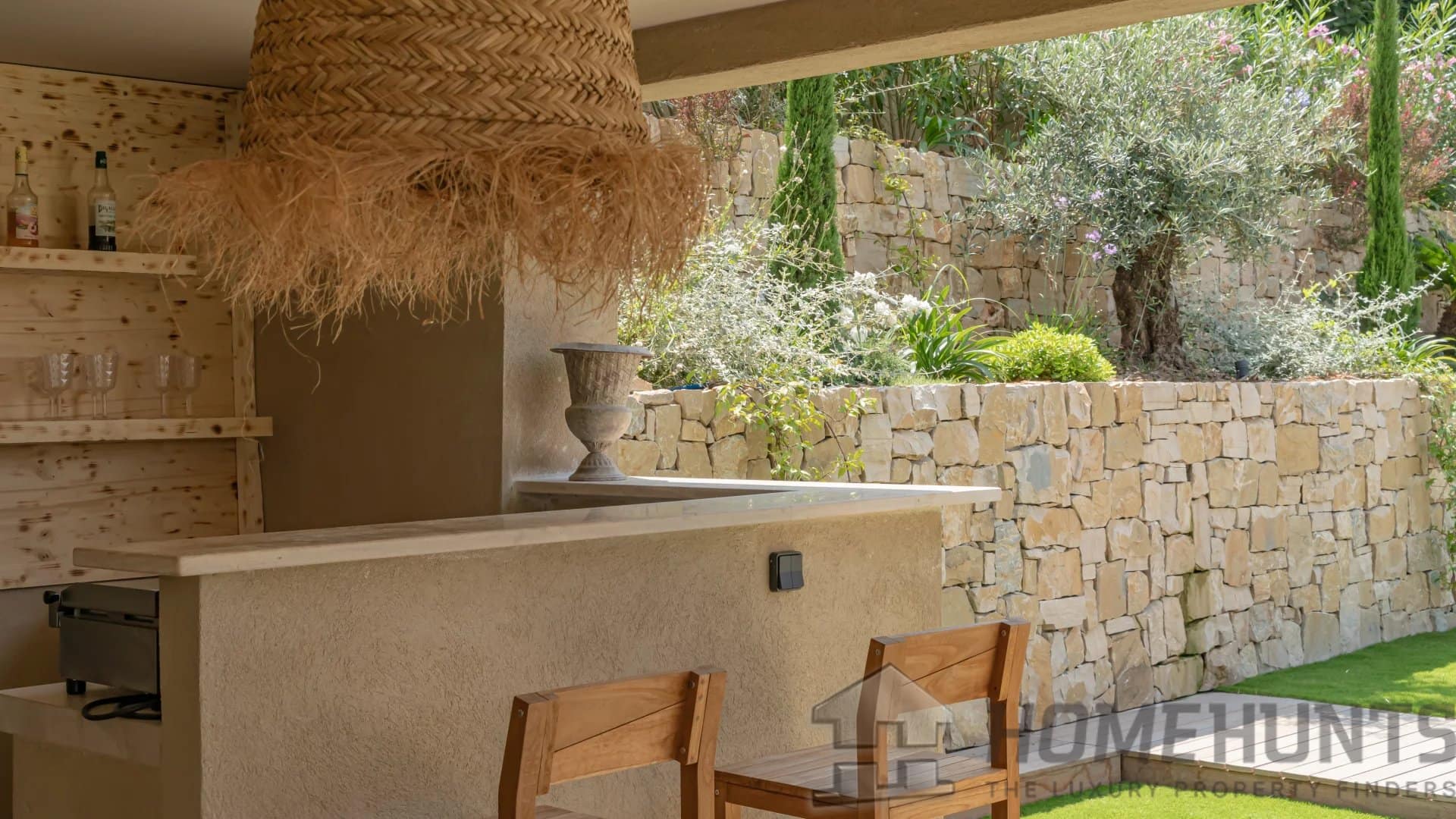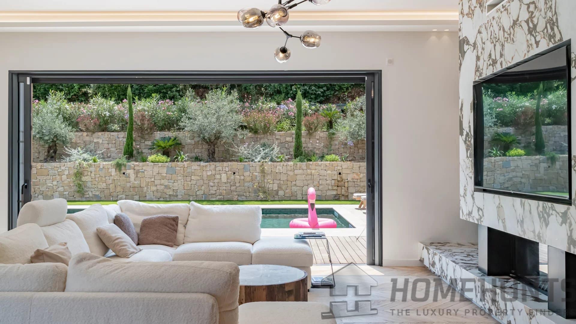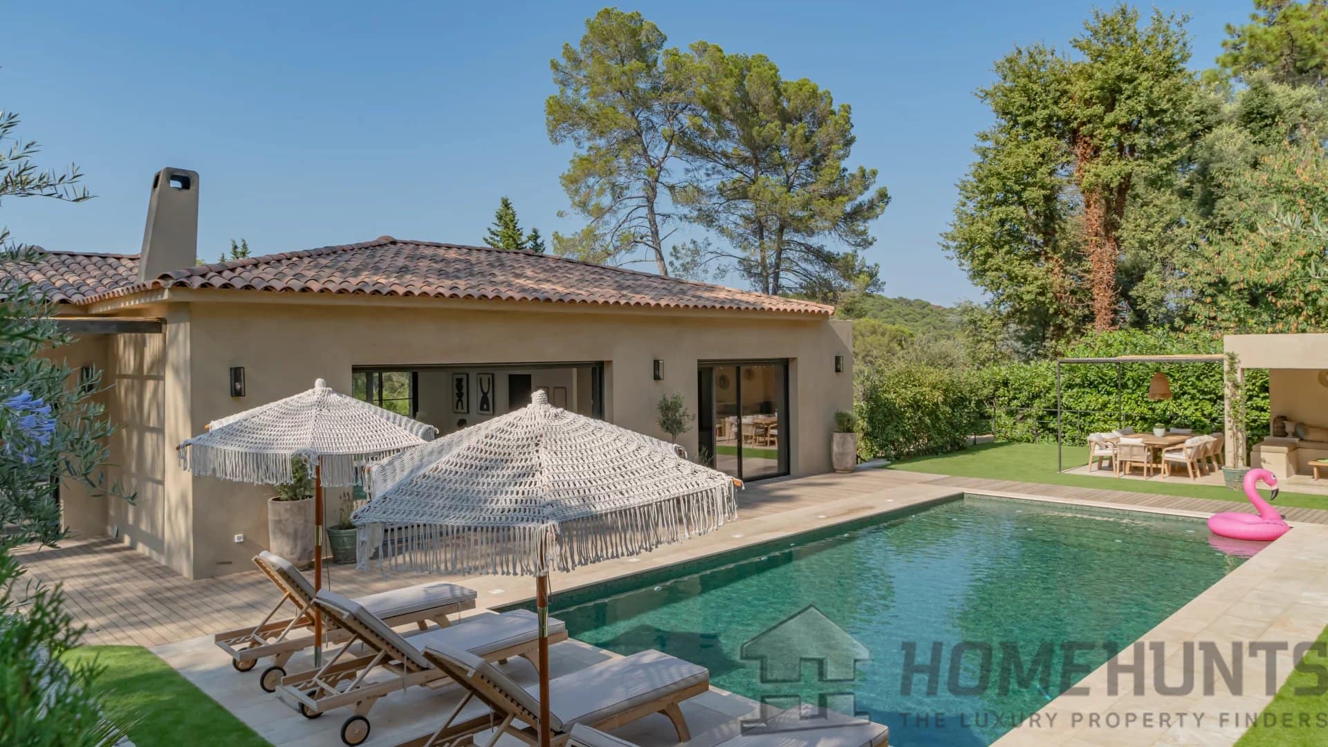 The bright, open living spaces extend naturally onto the lush landscaped garden, where a sparkling swimming pool and fully equipped summer kitchen invite outdoor living under the Riviera sun.