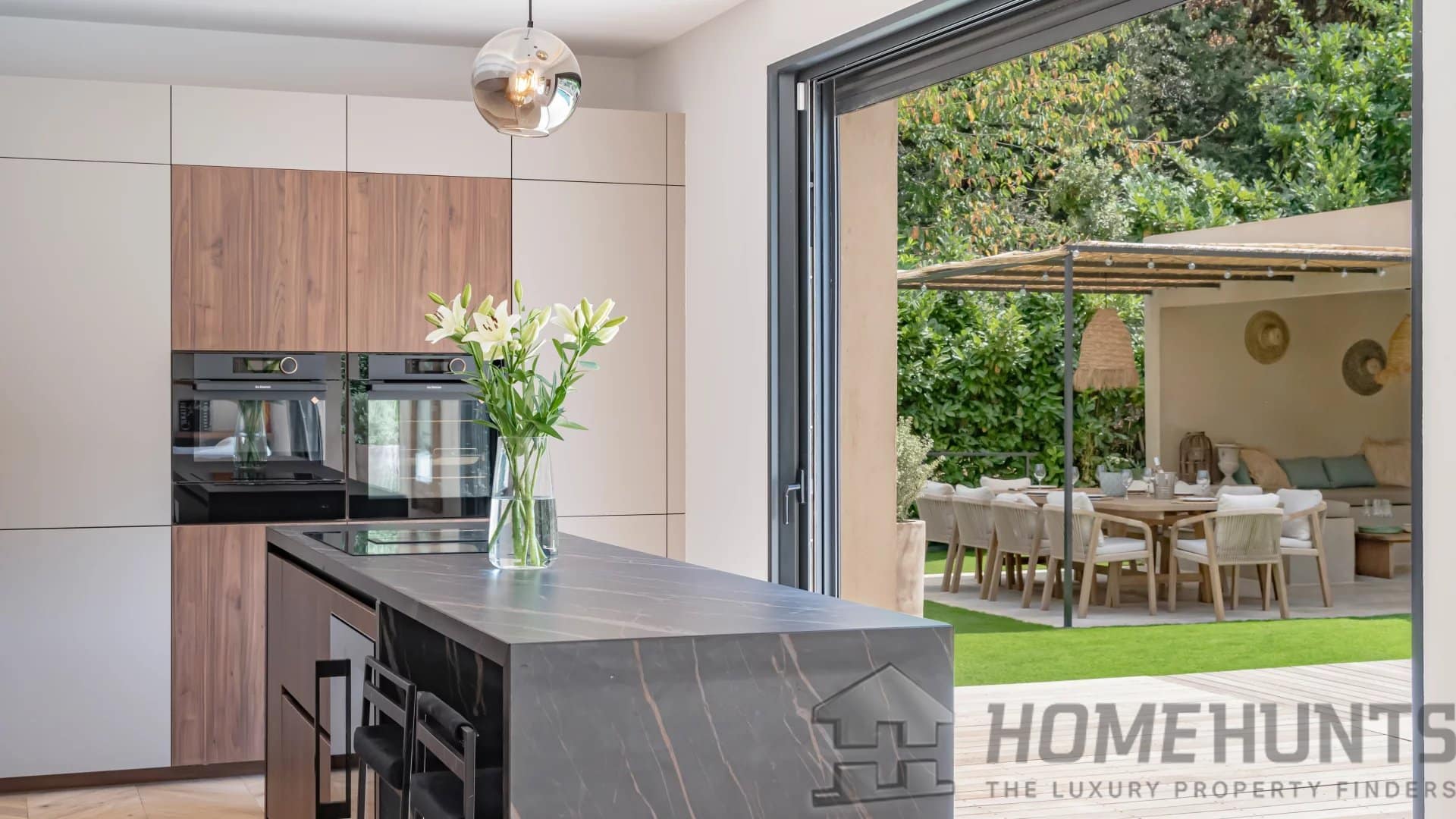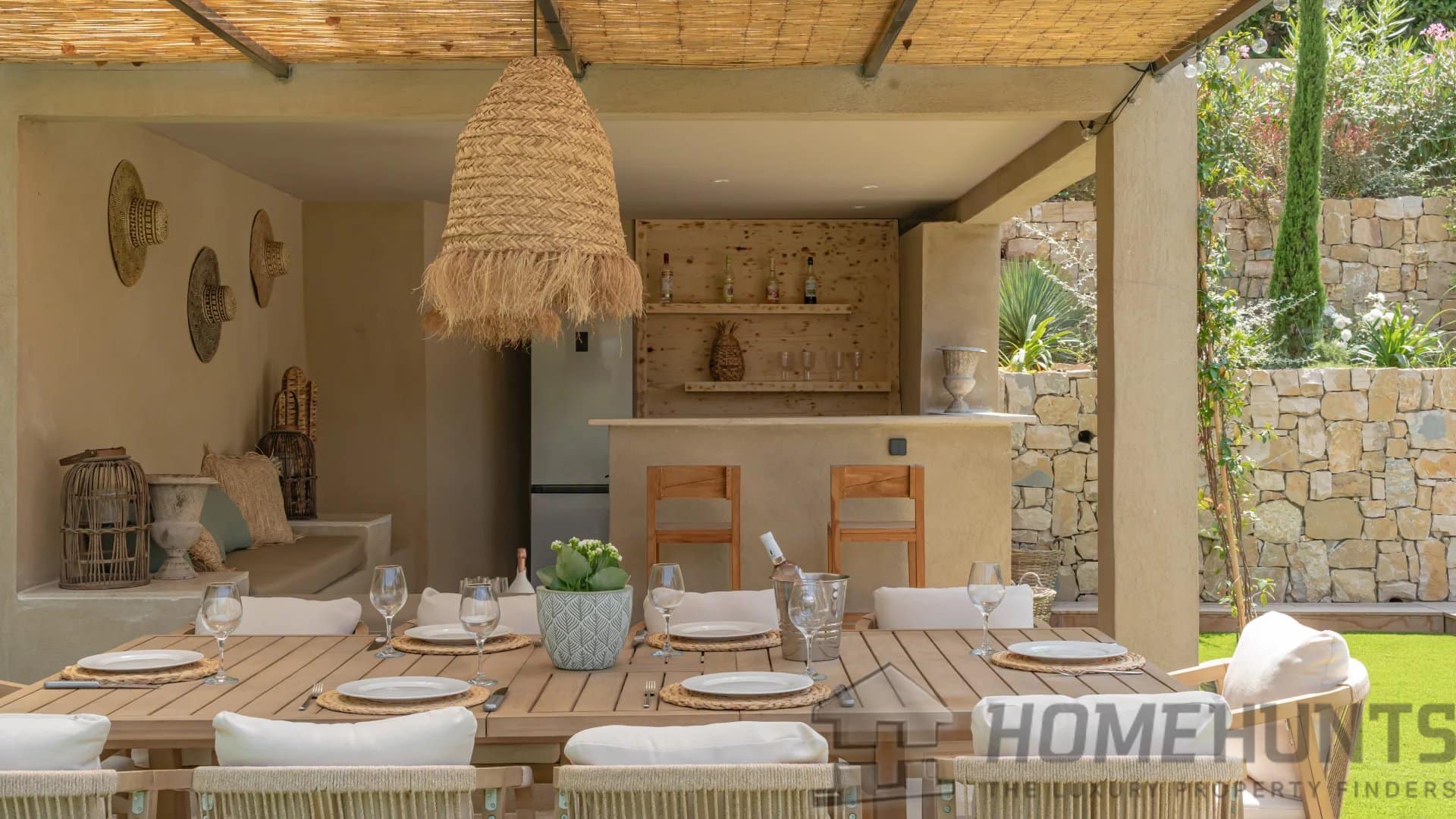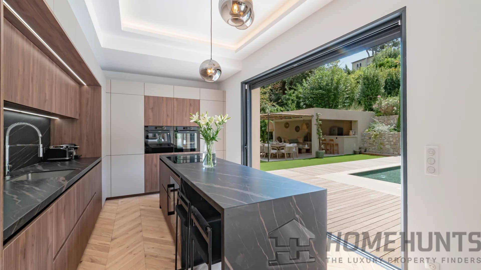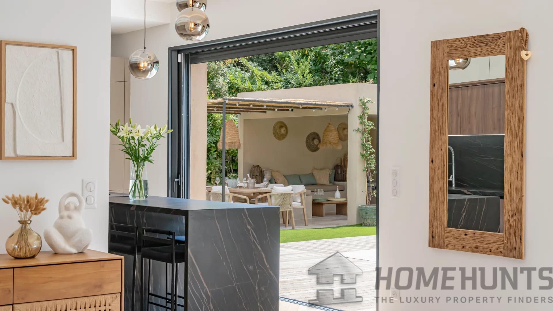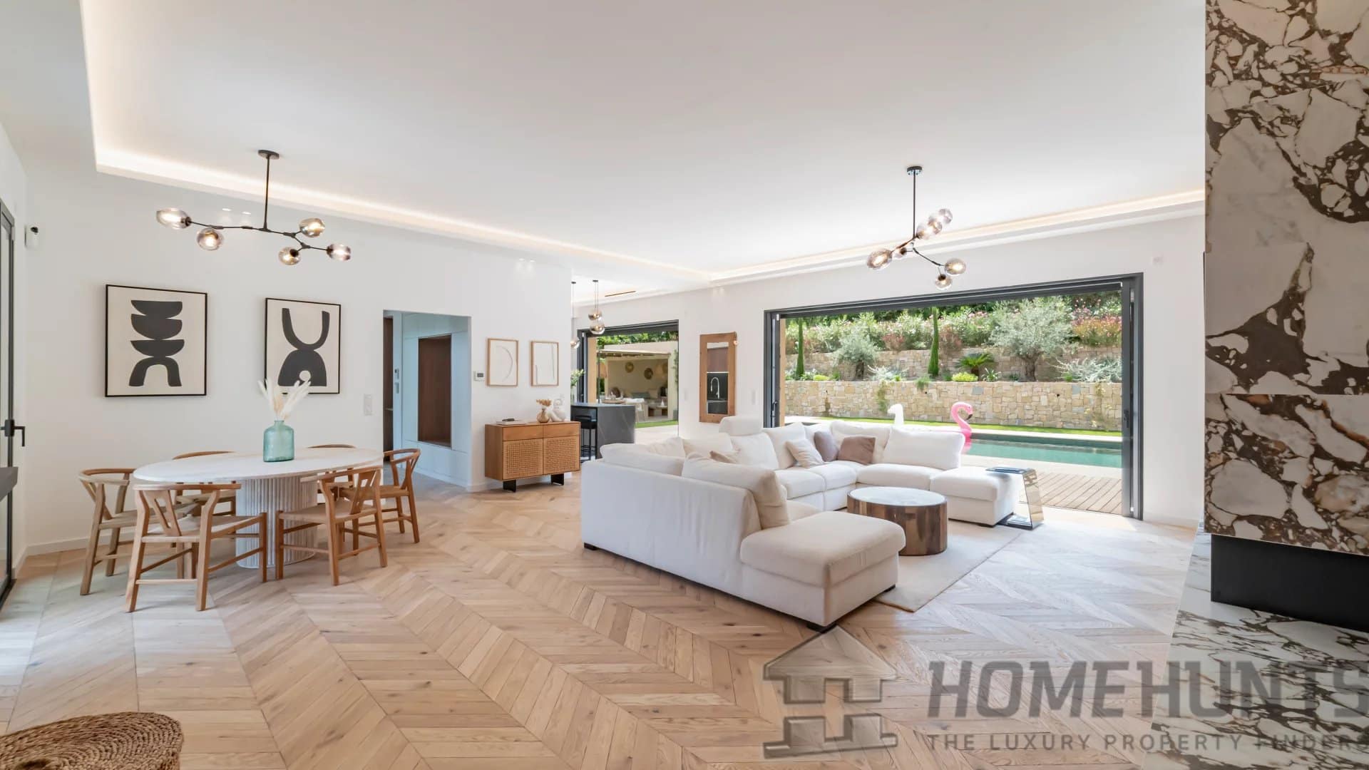 The bright, open living spaces extend naturally onto the lush landscaped garden, where a sparkling swimming pool and fully equipped summer kitchen invite outdoor living under the Riviera sun.