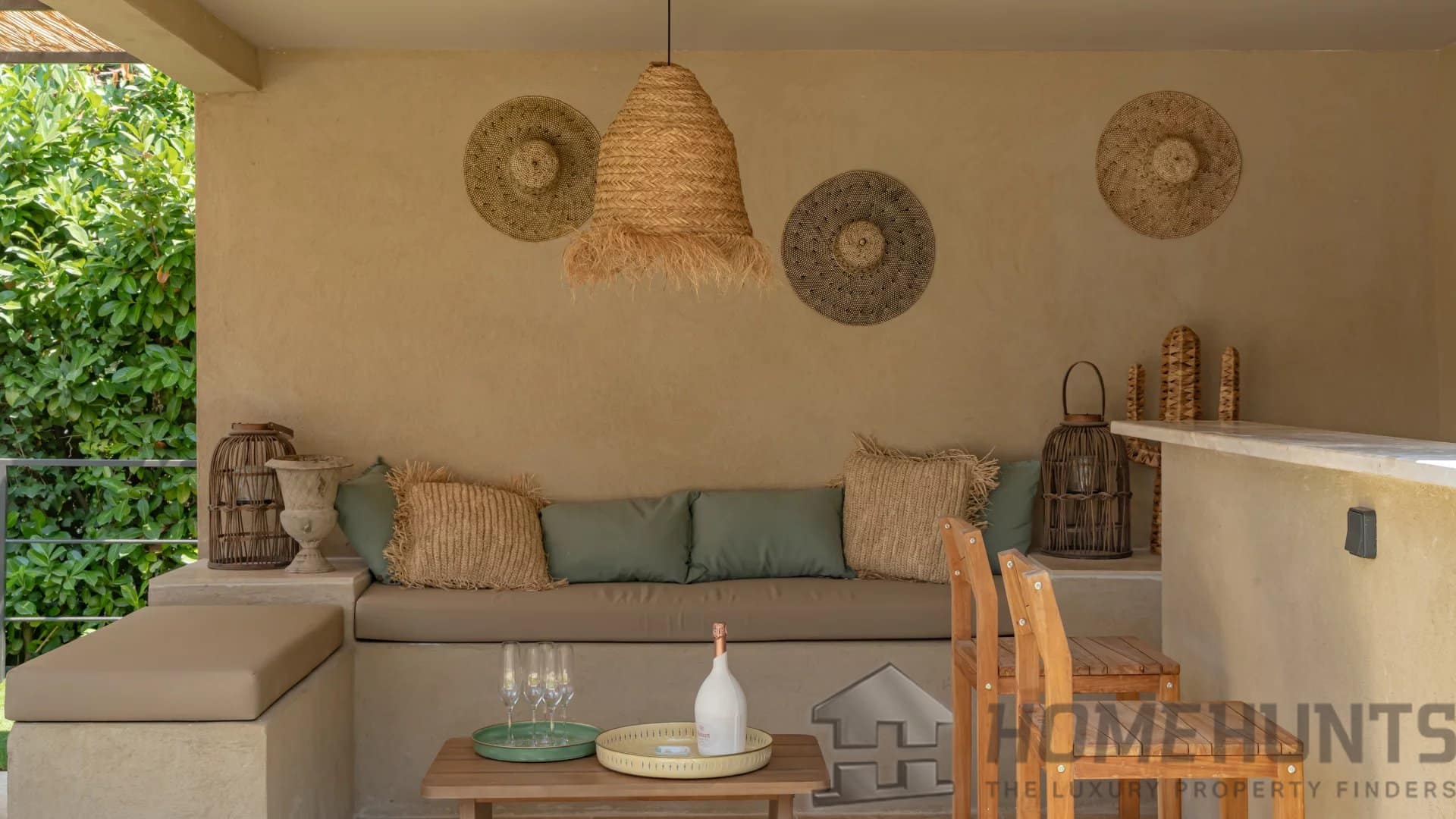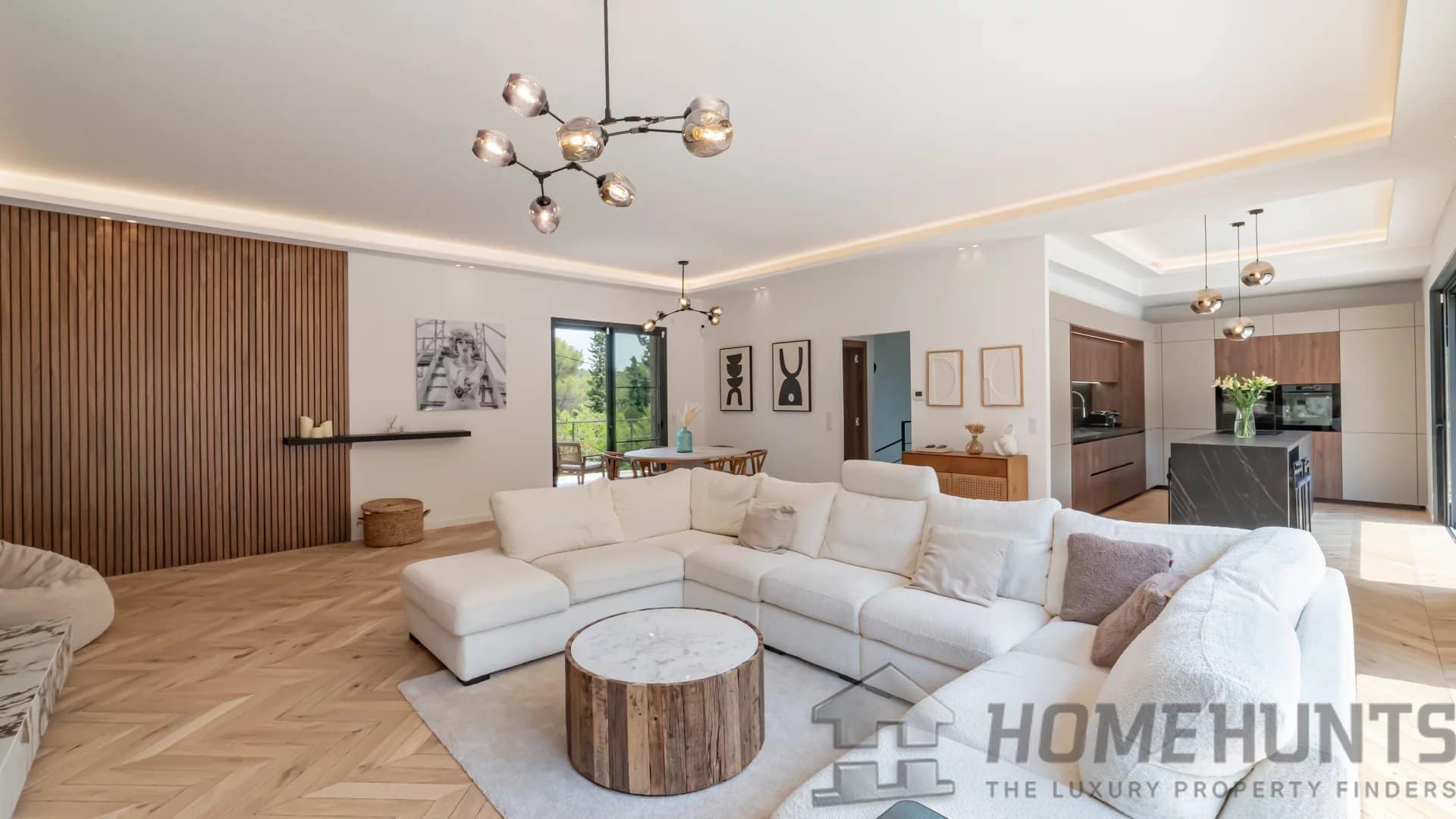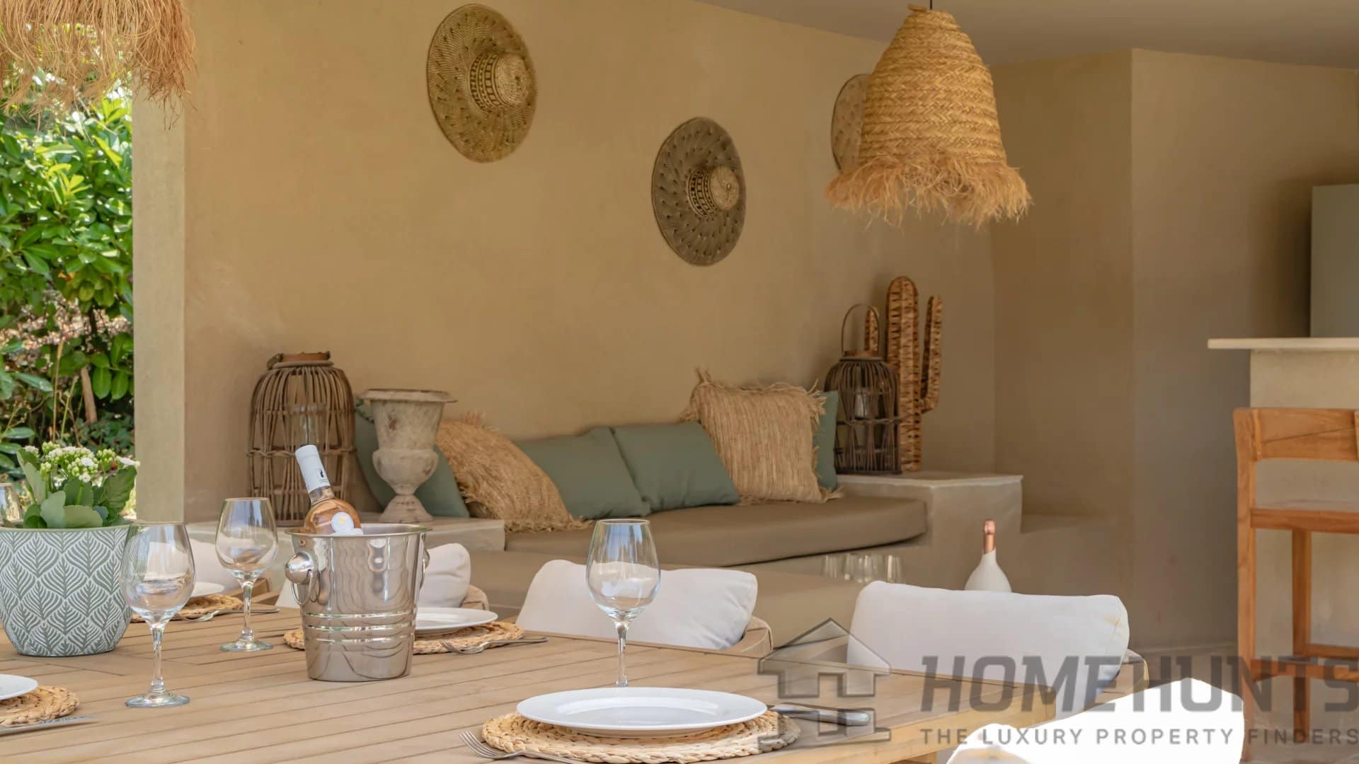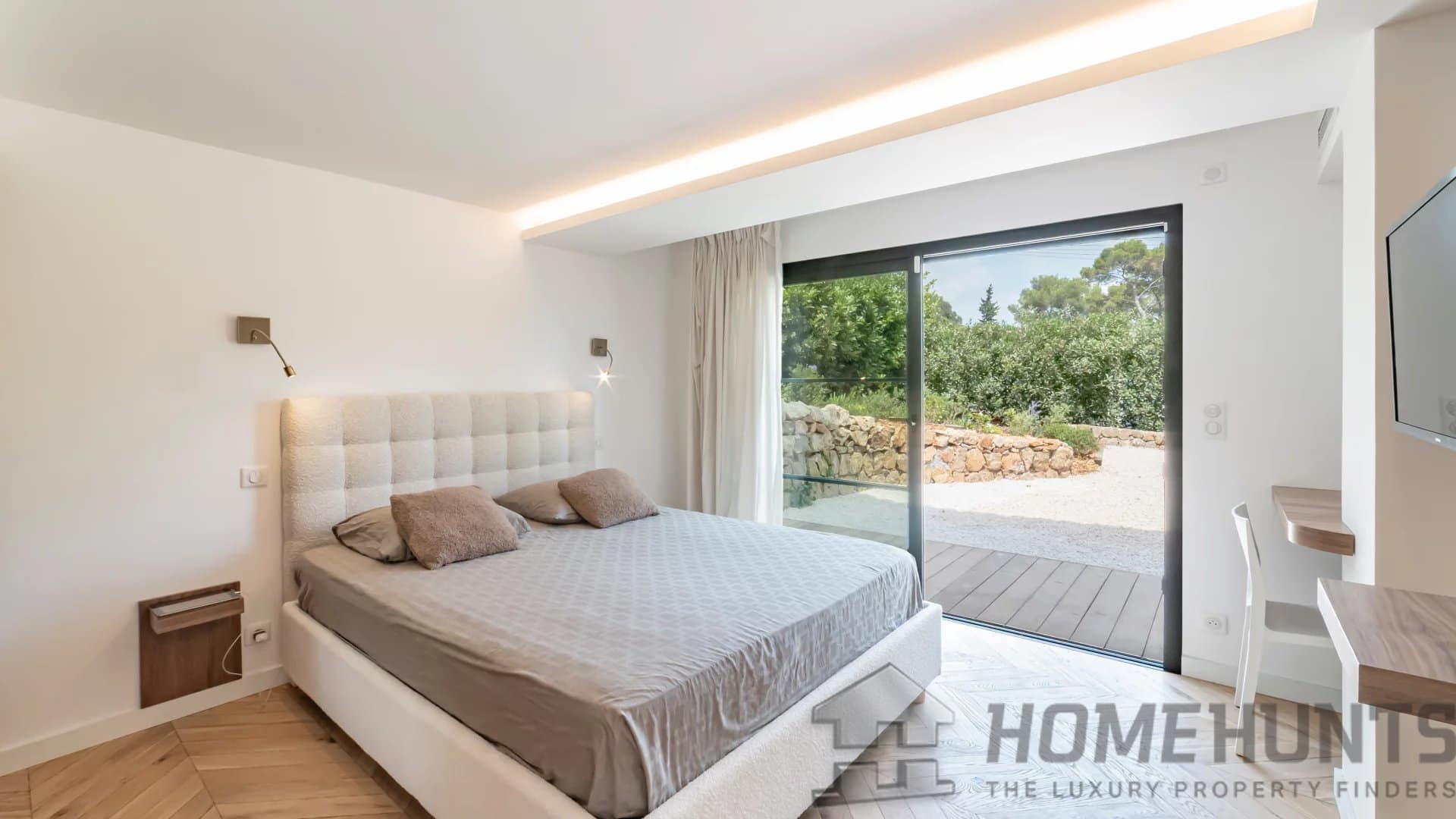 The bright, open living spaces extend naturally onto the lush landscaped garden, where a sparkling swimming pool and fully equipped summer kitchen invite outdoor living under the Riviera sun.