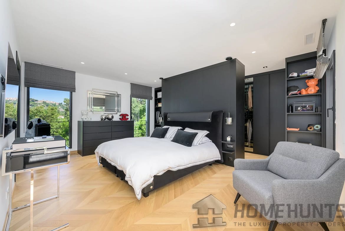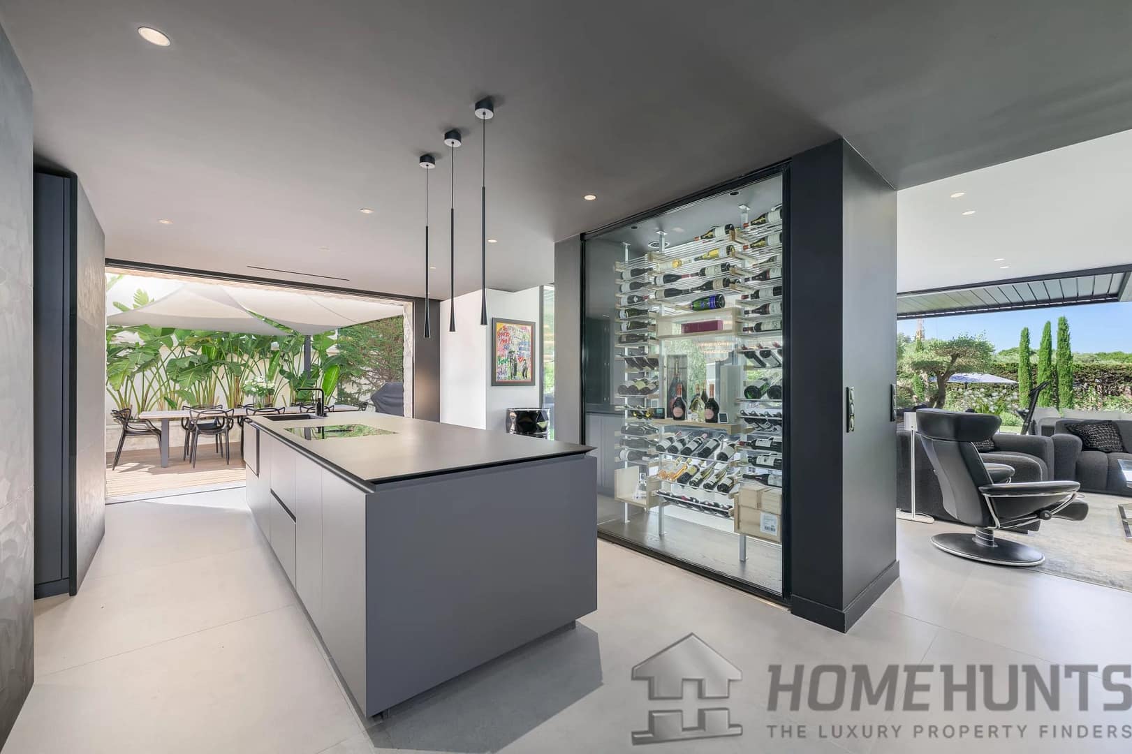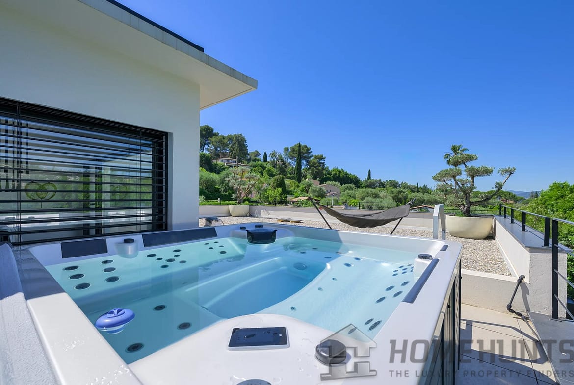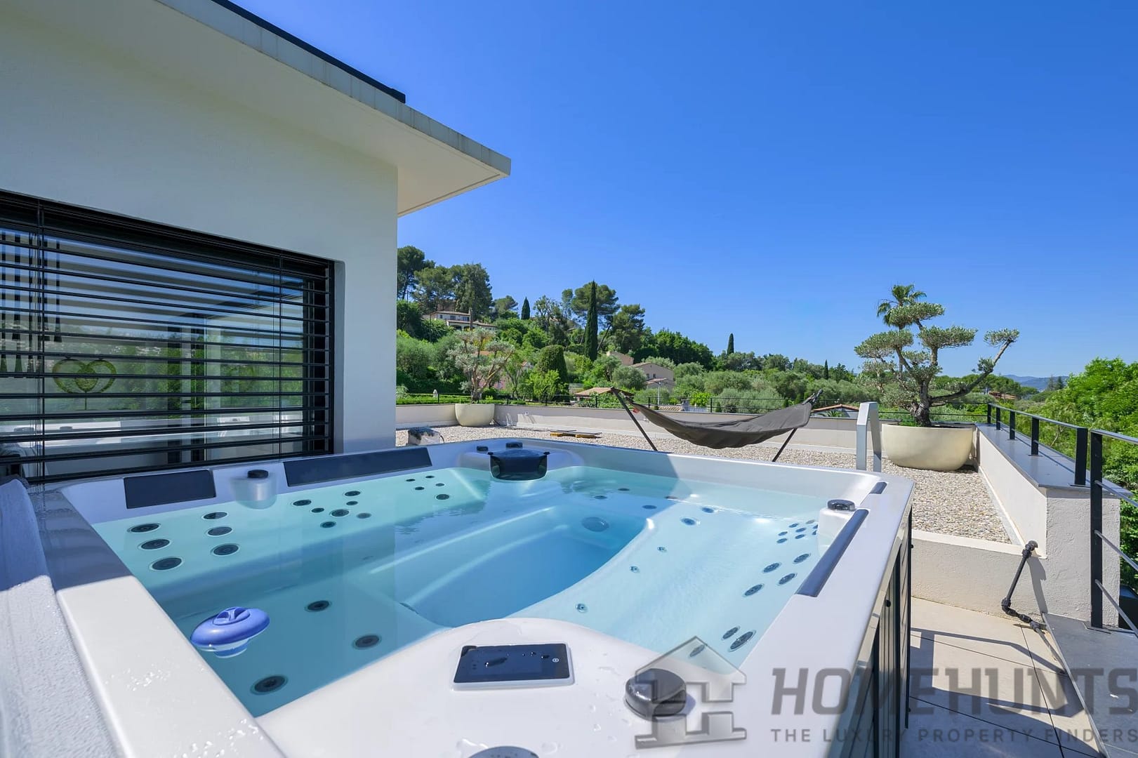 The amenities reflect the quality of this outstanding property: a fully integrated home automation system allows for effortless control of the villa’s main features. A stunning custom-designed glass wine cellar, discreetly positioned between the kitchen and the living room, adds a touch of elegance to the main living space. Outdoors, an elegant bioclimatic pergola naturally extends the living areas, providing an adjustable shaded space throughout the seasons. The beautifully maintained garden features a heated and cooled saltwater swimming pool, a pétanque court, and a genuine jacuzzi on the terrace, offering open views of the old village of Mougins.