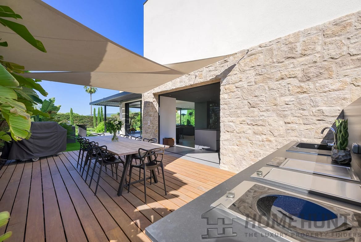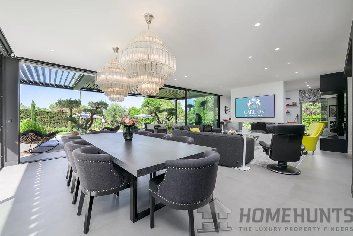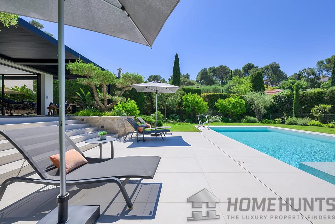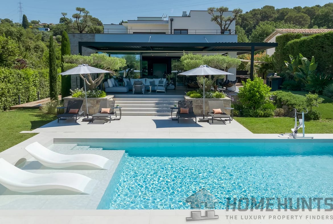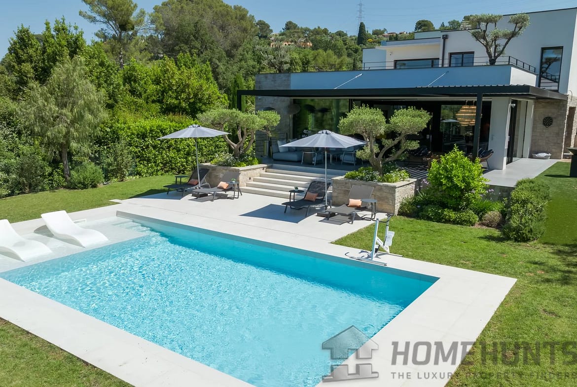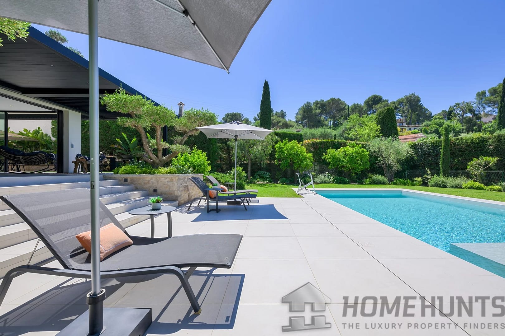In the heart of a sought-after residential area of Mougins, within a secure and gated estate, discover this stunning contemporary villa, entirely renovated by an interior architect. Nestled in a peaceful, green environment, this exceptional property enjoys an ideal South-West exposure and complete privacy, with no overlooking neighbors.