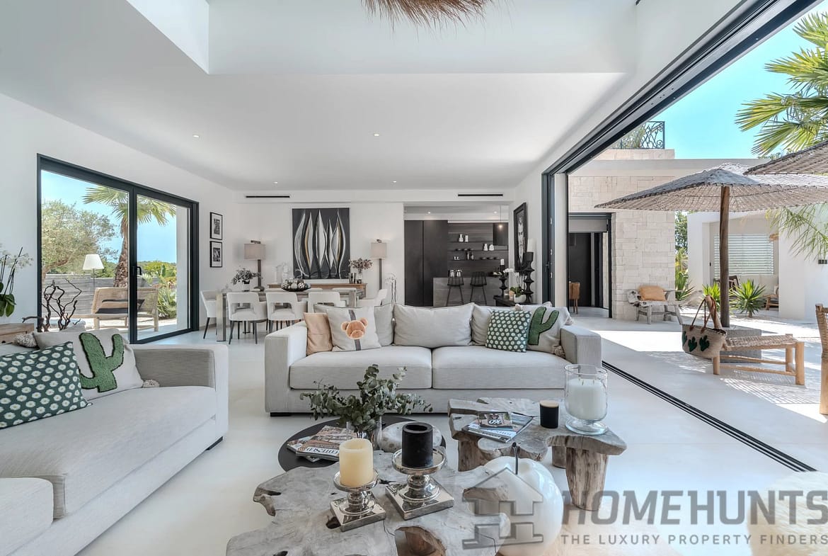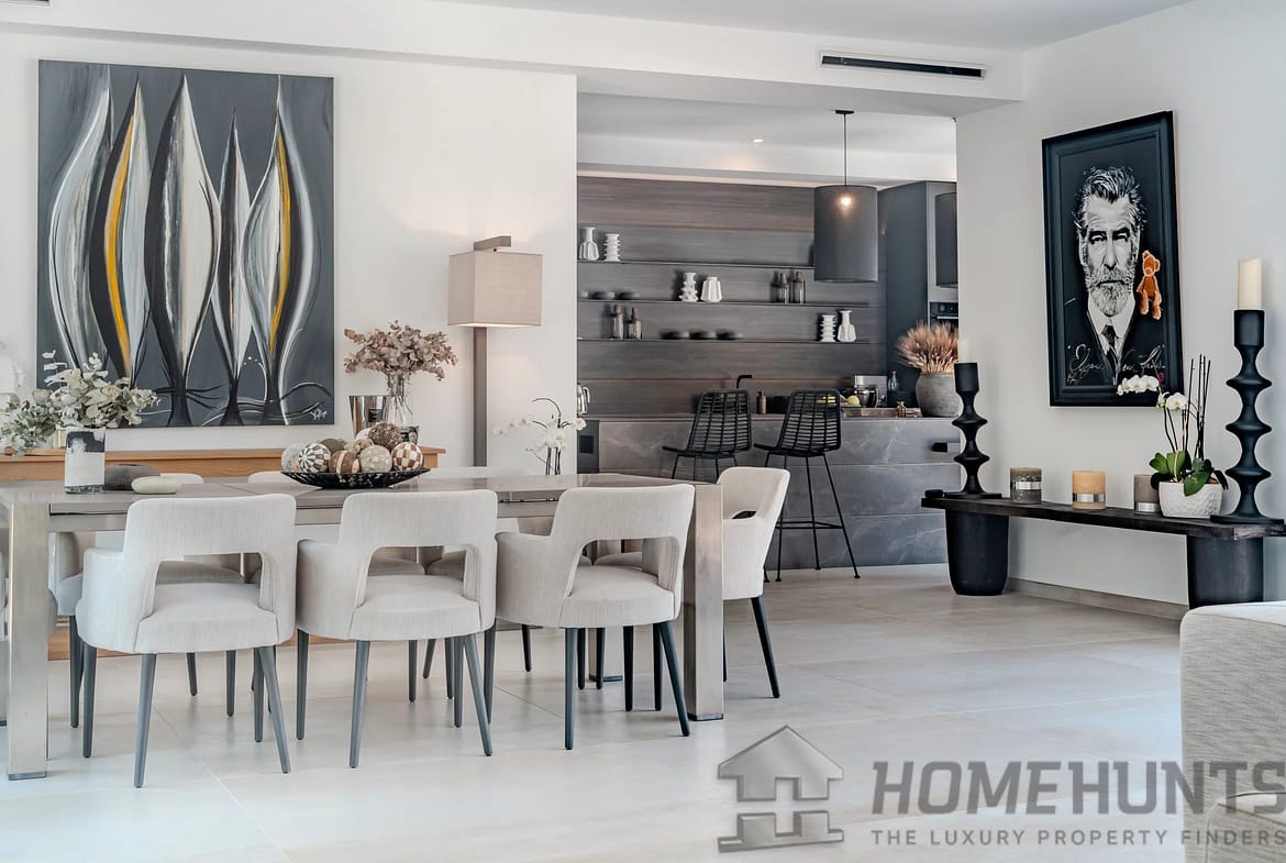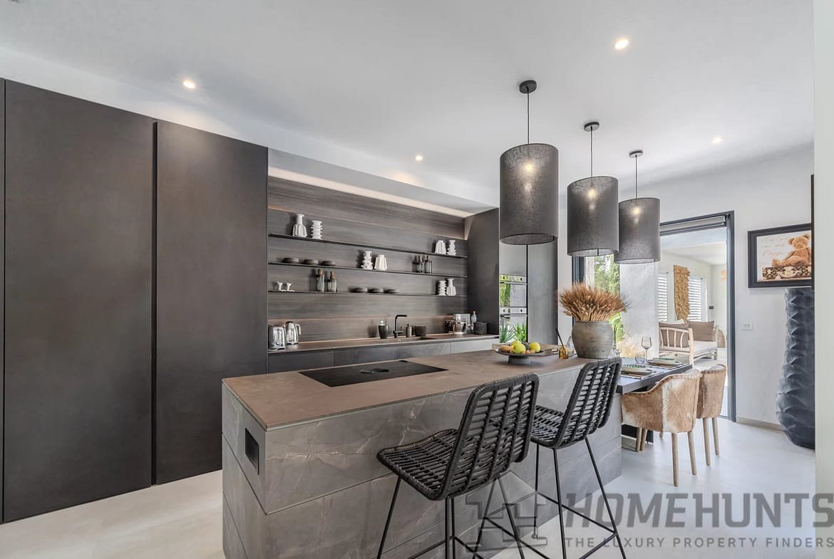 It offers a bright and generous living space, comprising a living room opening onto the exterior, a fully-equipped modern kitchen, and four suites with private bathrooms.