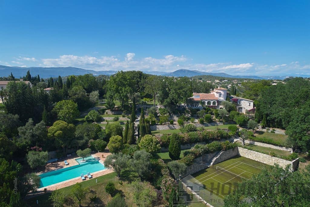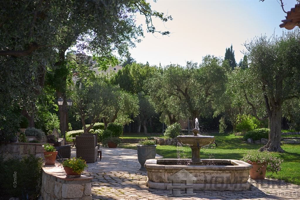 Located in a quiet and prestigious environment in Mougins, this unique and very special property with sea view extends over approximately 2.6 hectares of landscaped grounds with olive groves, terraced vineyards, fountains, and greenery.