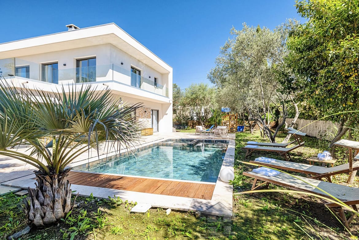 On the first floor, an entrance hall with built-in checkroom leads to a vast, light-filled living room, extended by a refined, fully-equipped open-plan kitchen. A bedroom with en-suite bathroom has direct access to the terraces and swimming pool.