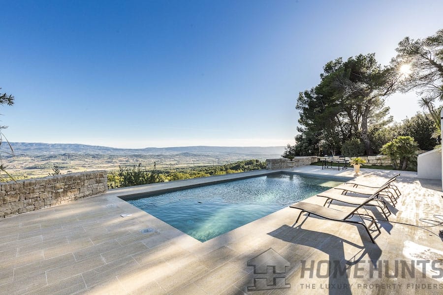 It has a total liveable floor space of 357 m2 and stands in more than 1800 m2 of terraced grounds with a unique and entrancing view that takes in the Lioux and Roussillon cliffs and extends to the Mont Sainte-Victoire.