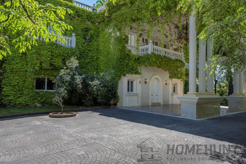 From the moment you arrive, the home makes a statement. Grand Doric columns frame the entrance, and ivy-covered walls soften the architecture, giving it a quiet, almost cinematic beauty. The double-height entryway, with its sweeping twin staircases and patterned marble floor, sets the tone: formal but warm, impressive yet inviting.