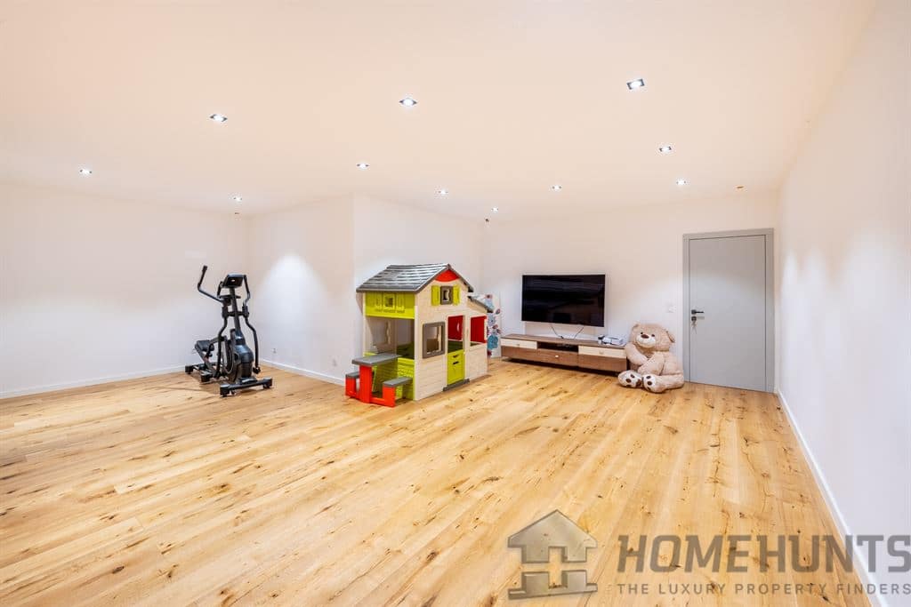 The villa features a fully equipped kitchen opening onto a large living room with lake views. It includes four bedrooms with en-suite bathrooms, a studio apartment, a large room suitable for use as a gym or home cinema, a laundry room, and a garage.